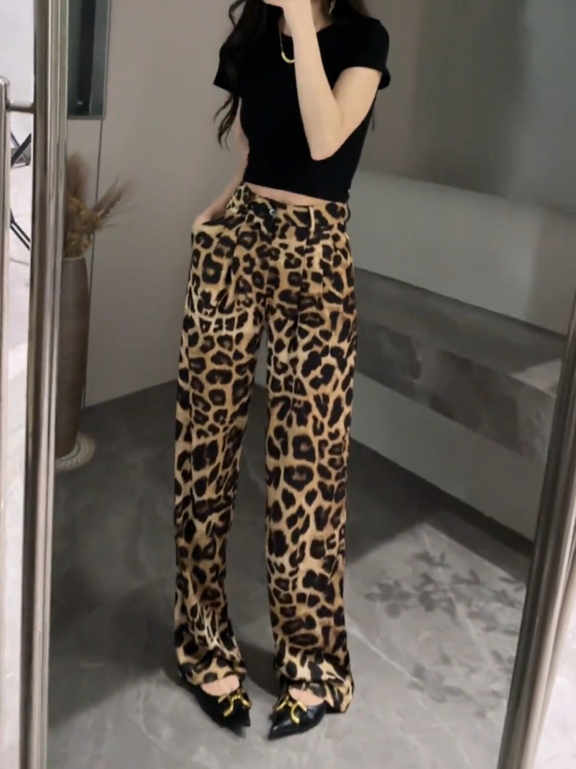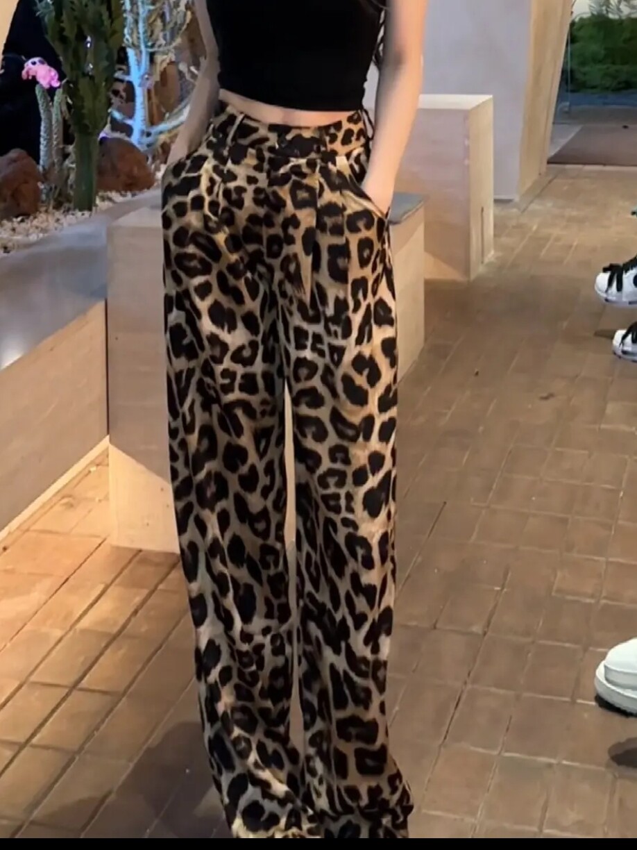 Leopard Print Pants, Satin Wide-Leg Pants for Women, Summer Hot Girl Style, Thin Long Pants, Slimming, Drapey Straight-Leg Pants, High-Waisted