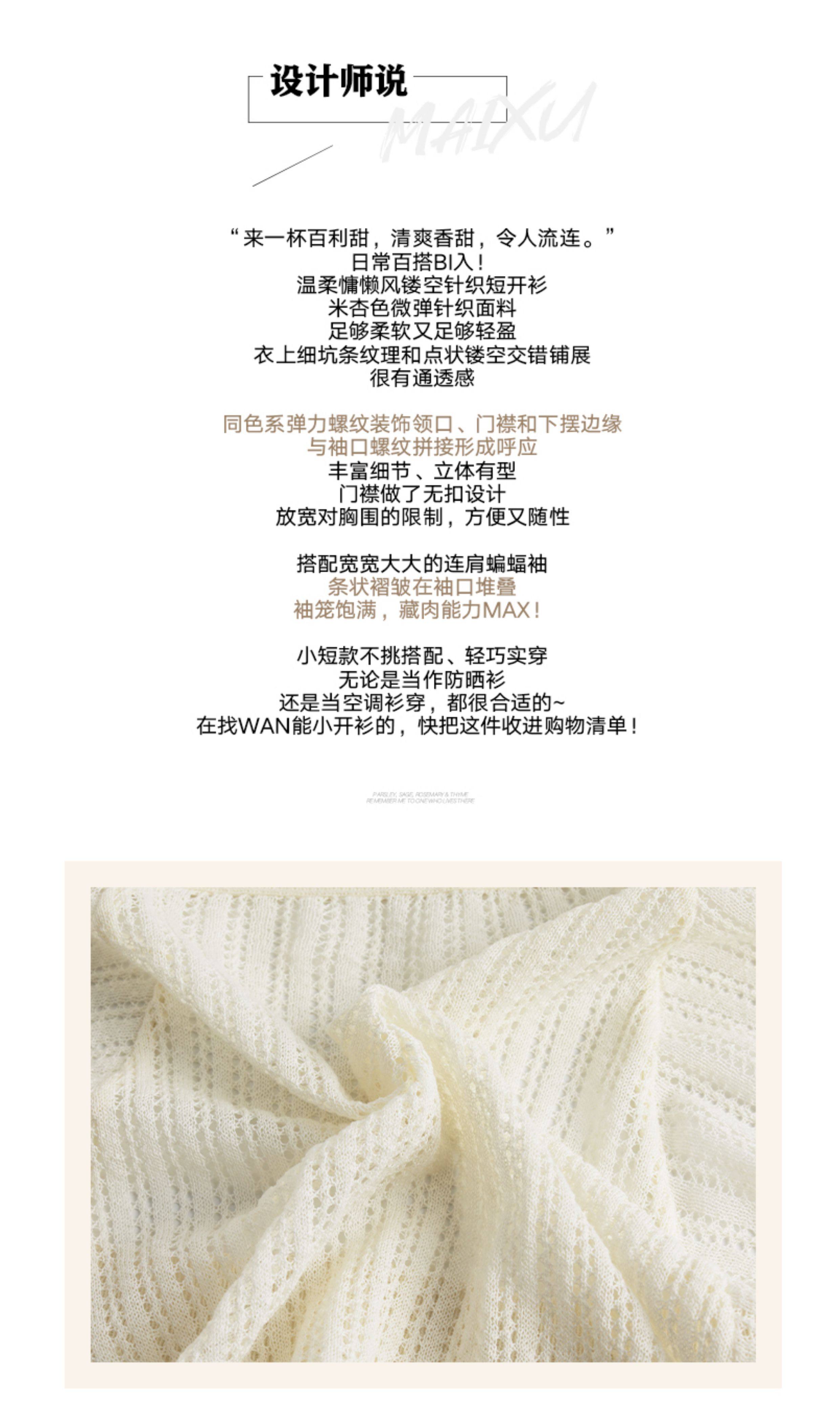 Macy's "Baileys" French-Style Versatile Batwing Sleeve Ice Silk Knit Hollow-Out Cardigan for Women, Summer Short Sun Protection Thin Top