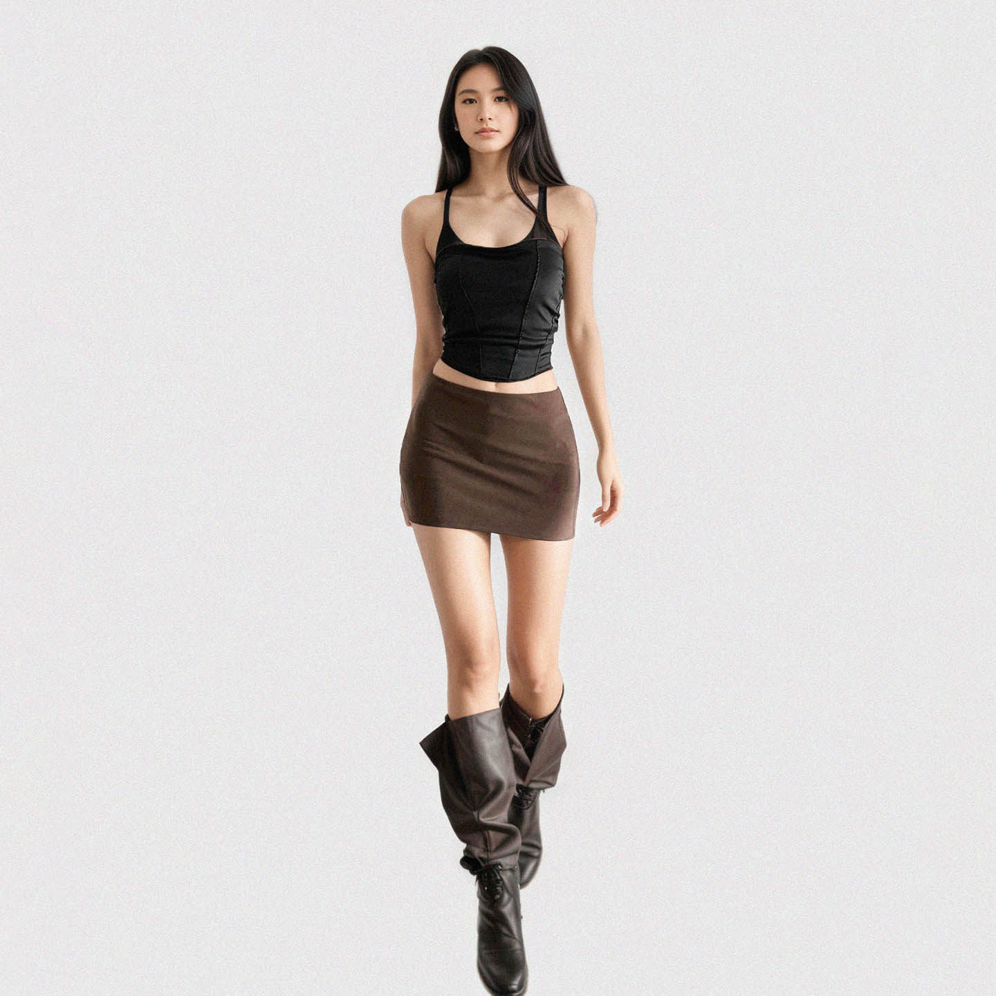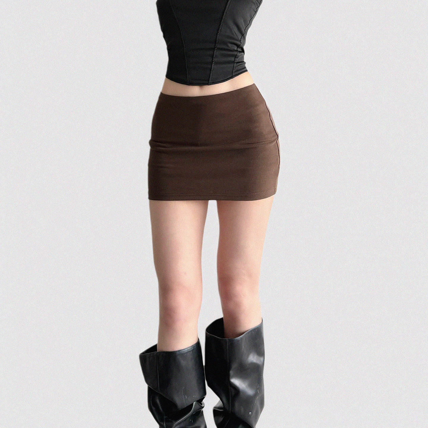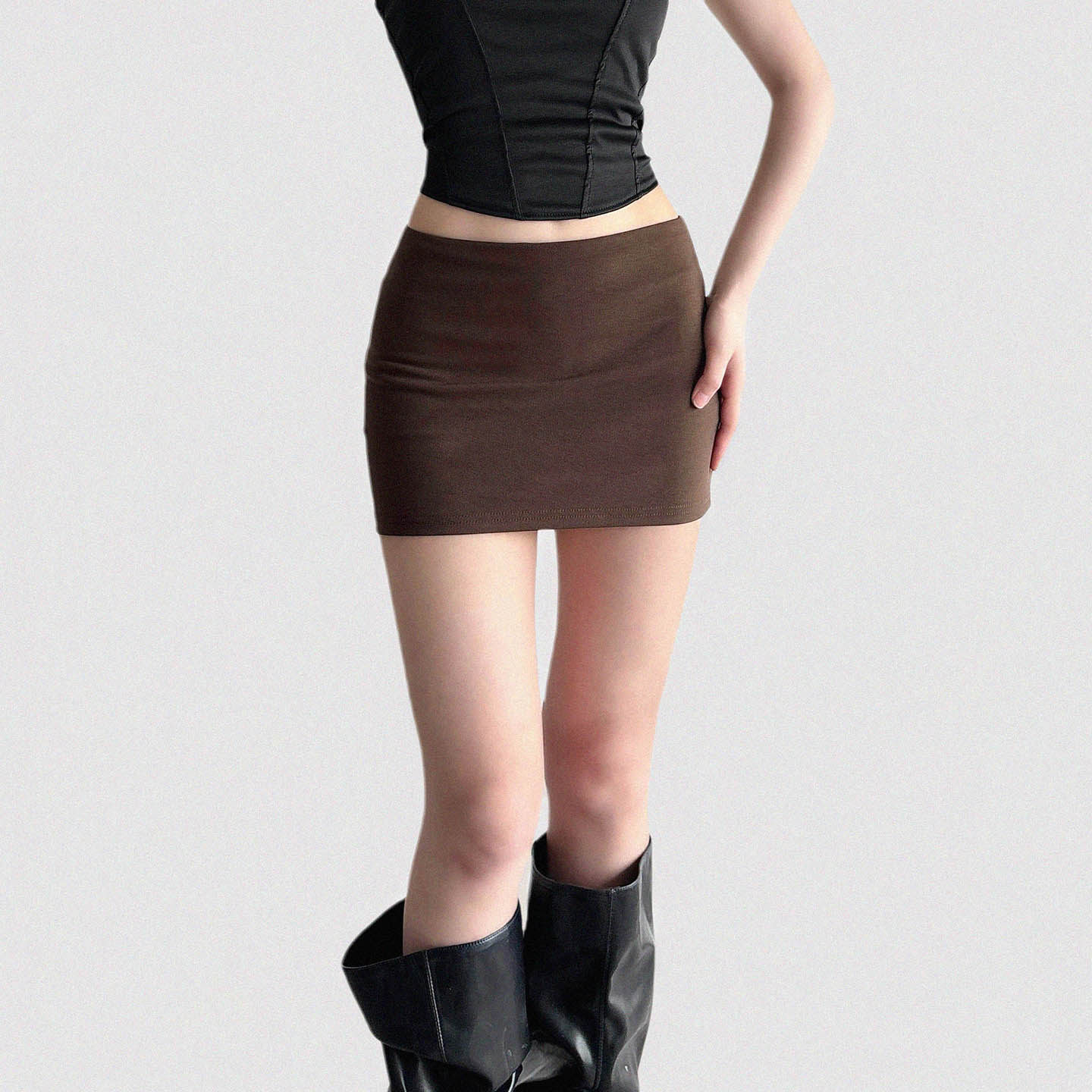 Funoff American Retro Brown One-Piece Hip-Hugging Low-Waist Short Skirt Sexy Simple Pure Color Basic Skirt
