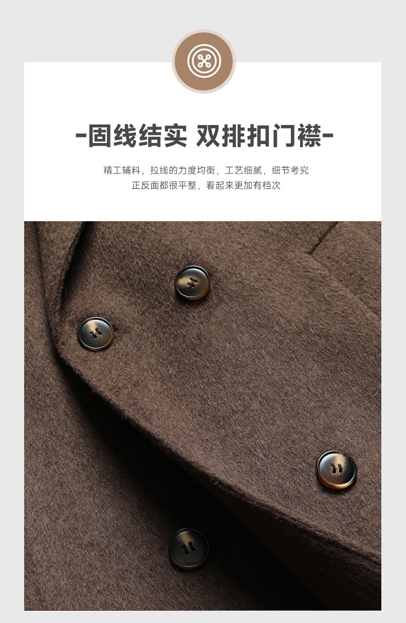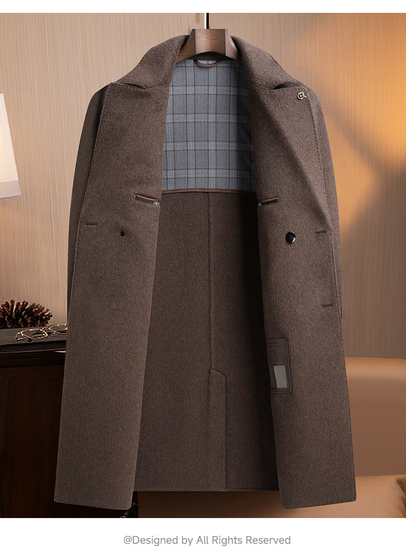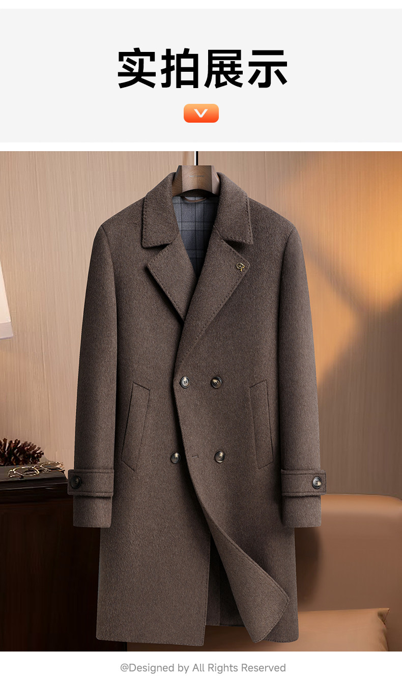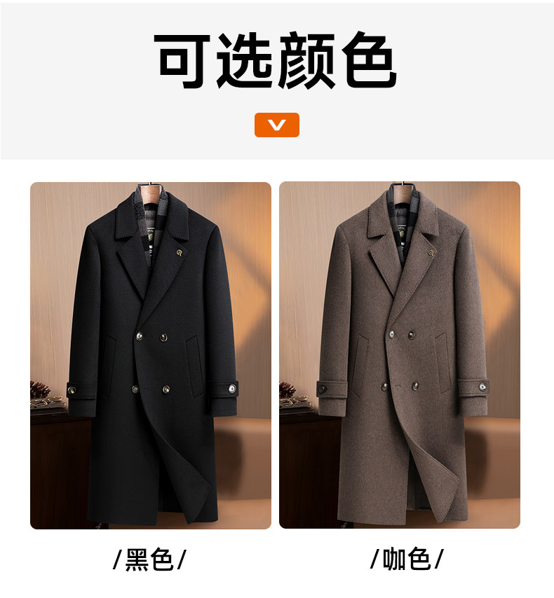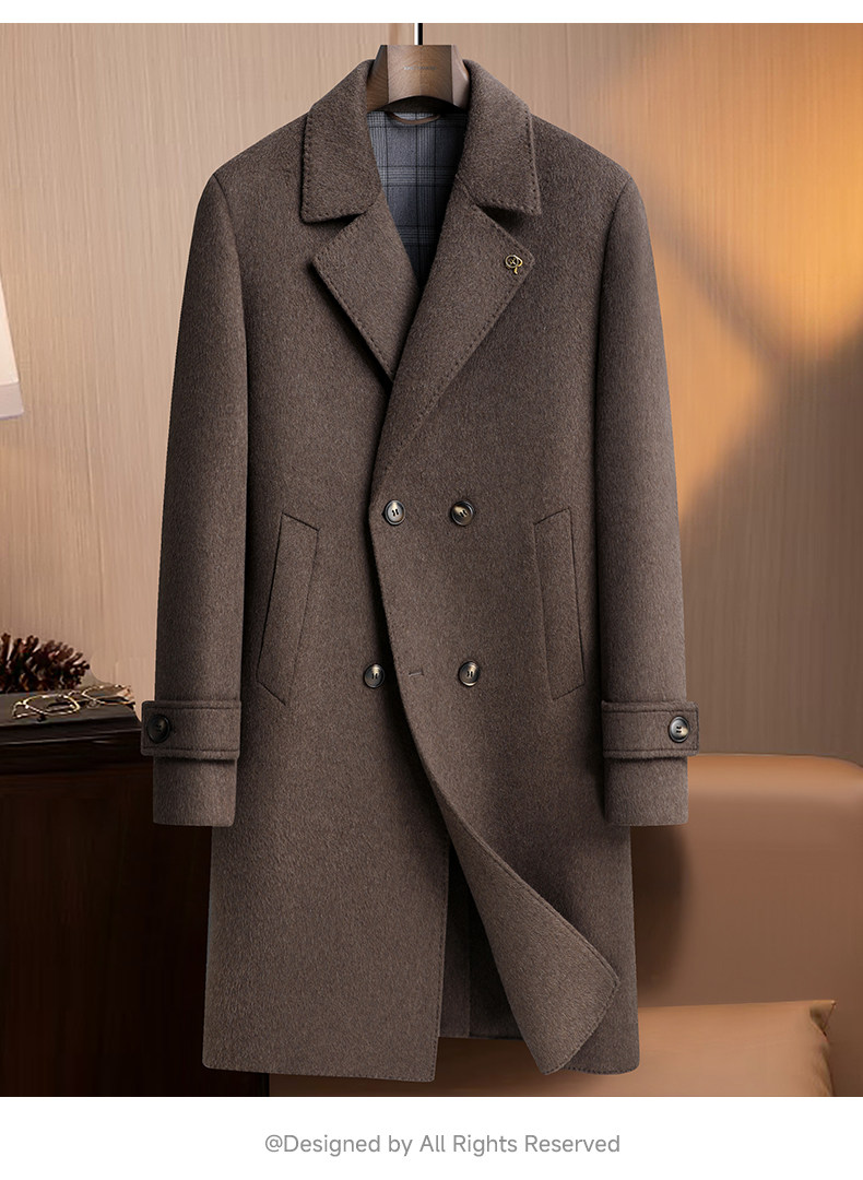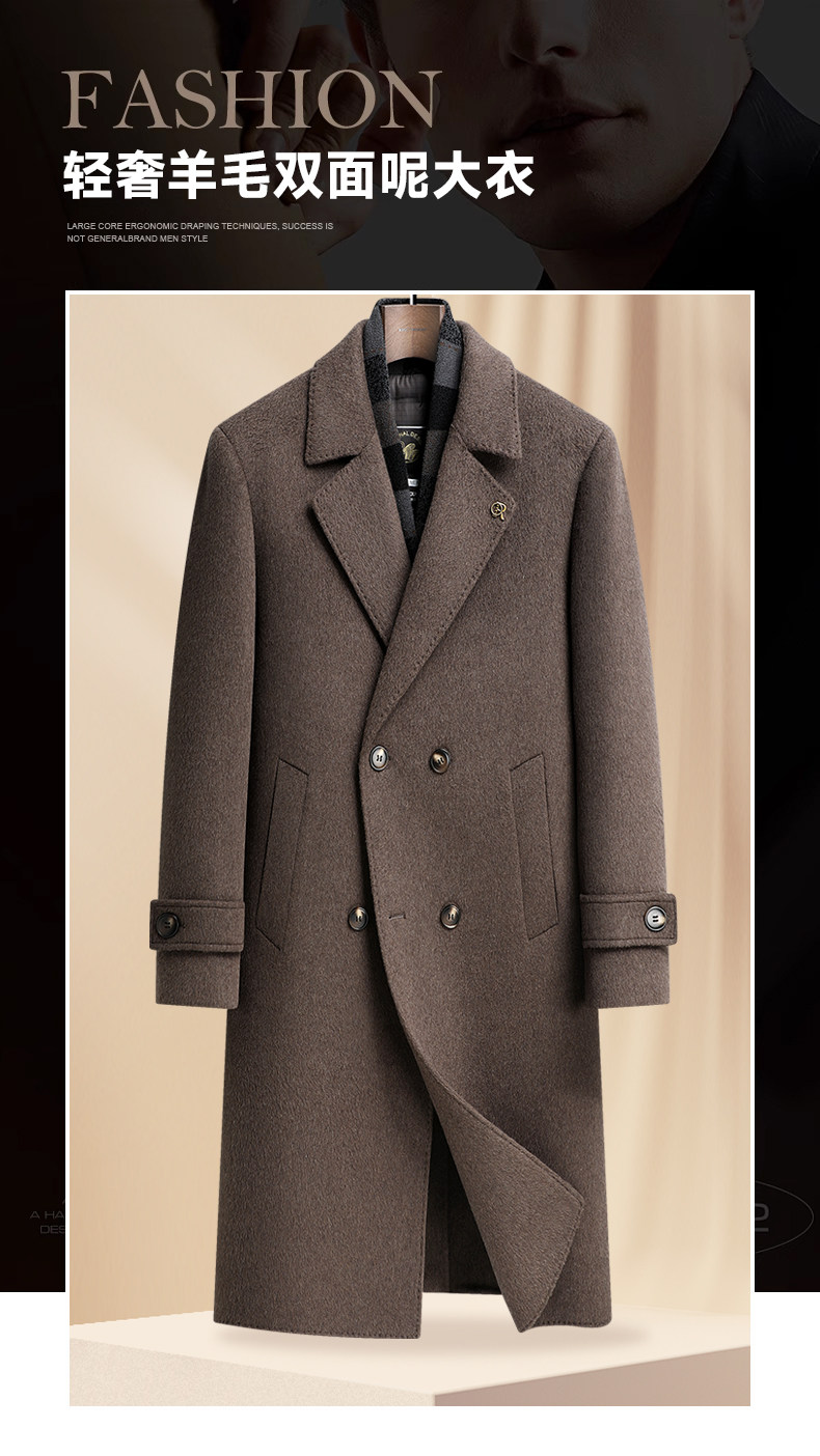 【White Goose down Lining + Cashmere】Romon Long Double-Breasted Wool Coat for Men, Double-Sided Woolen Overcoat