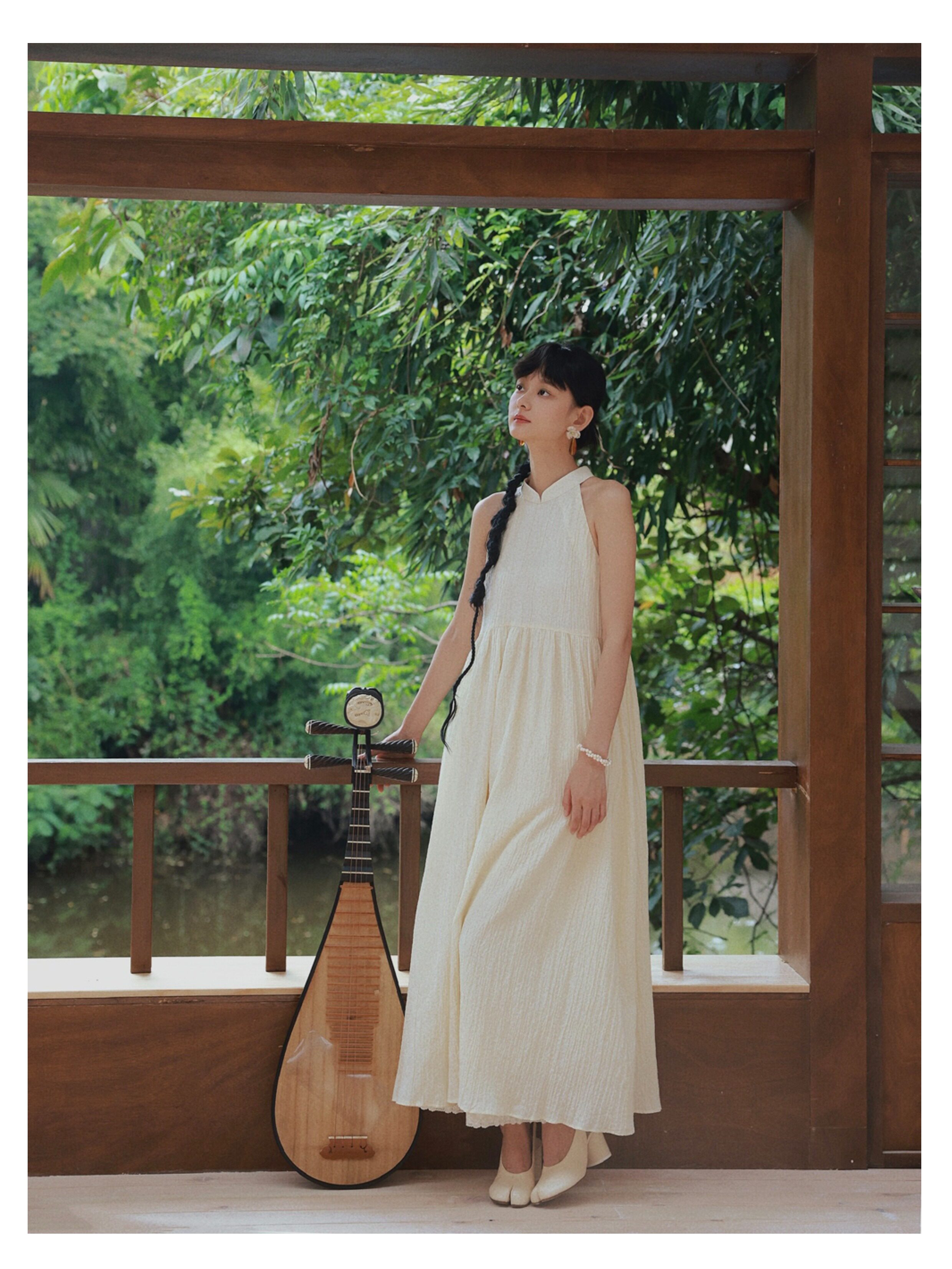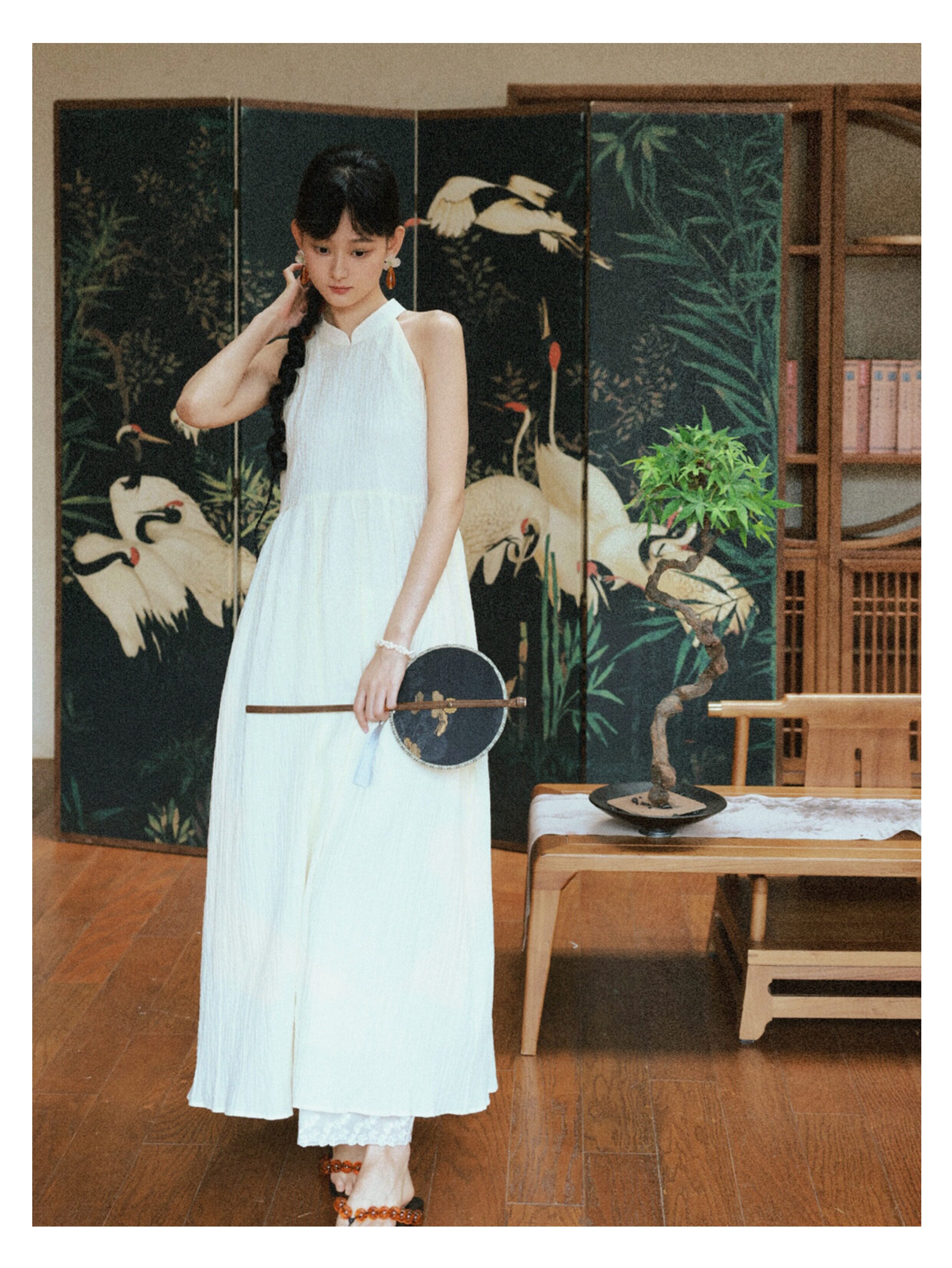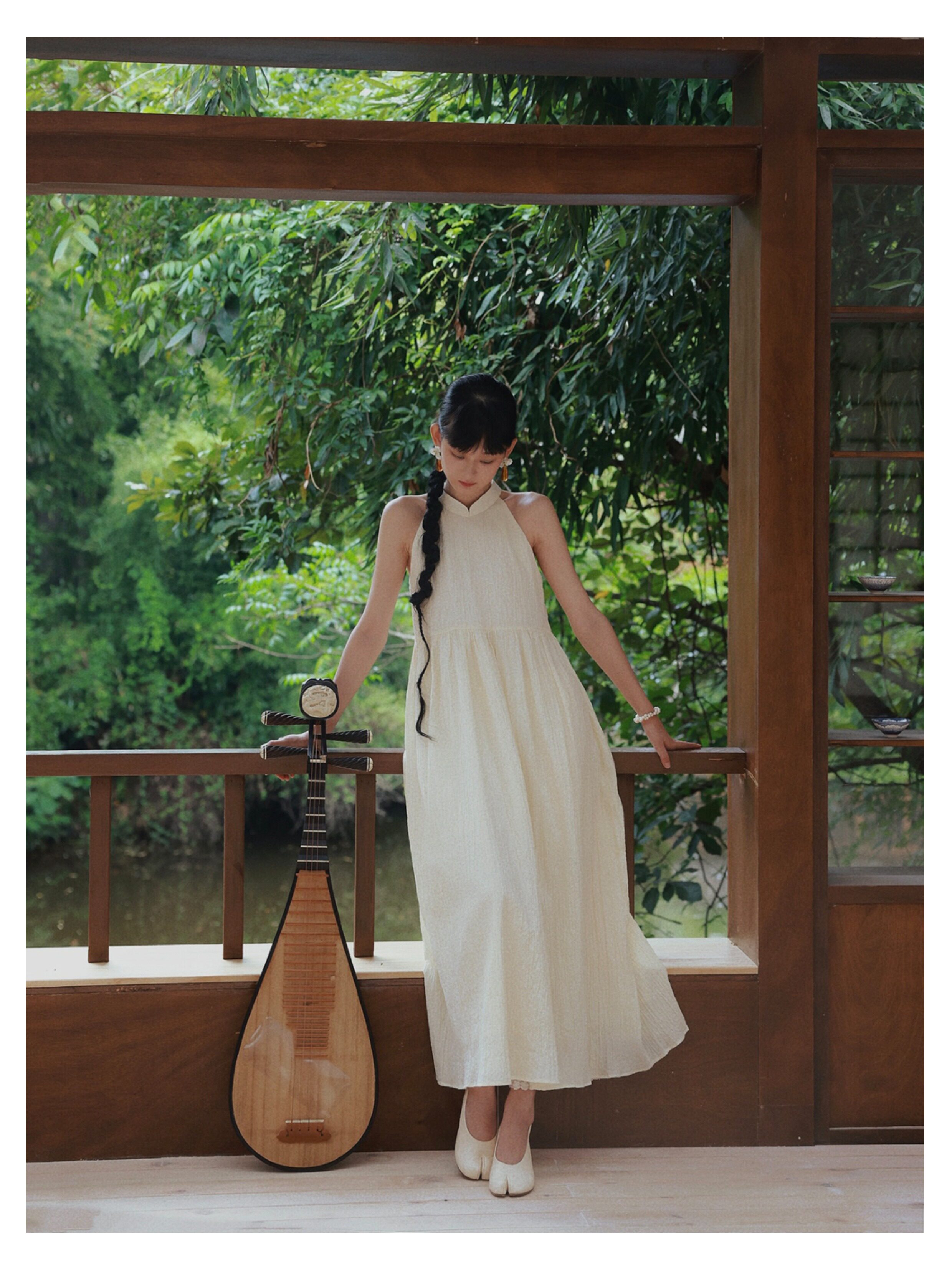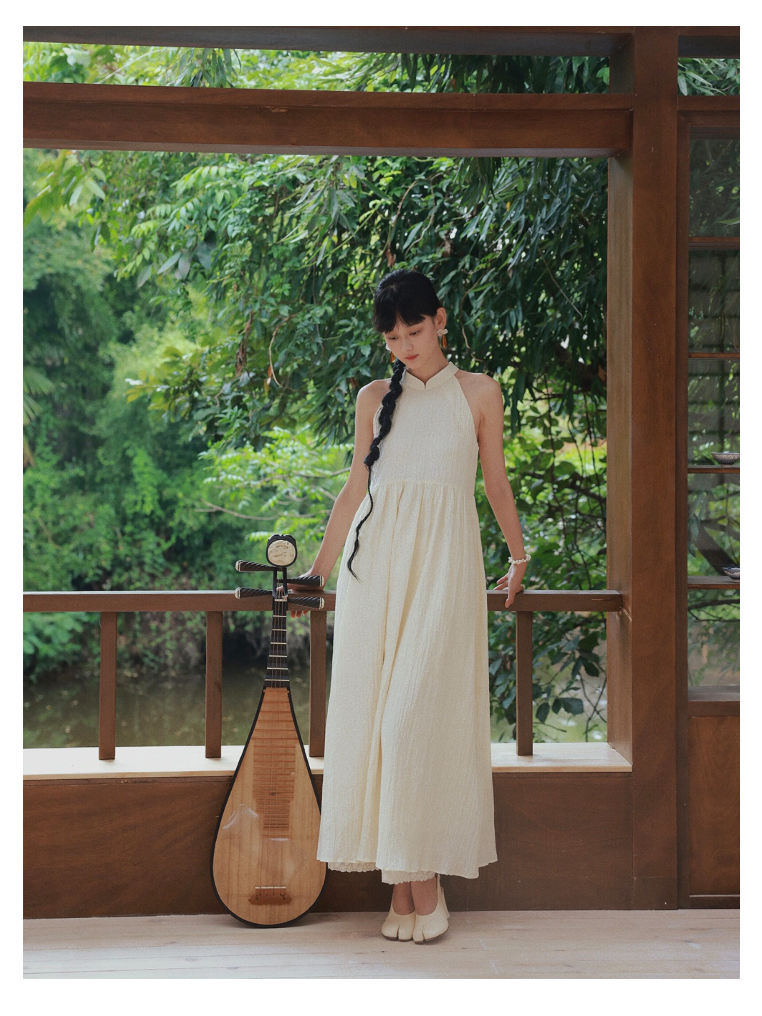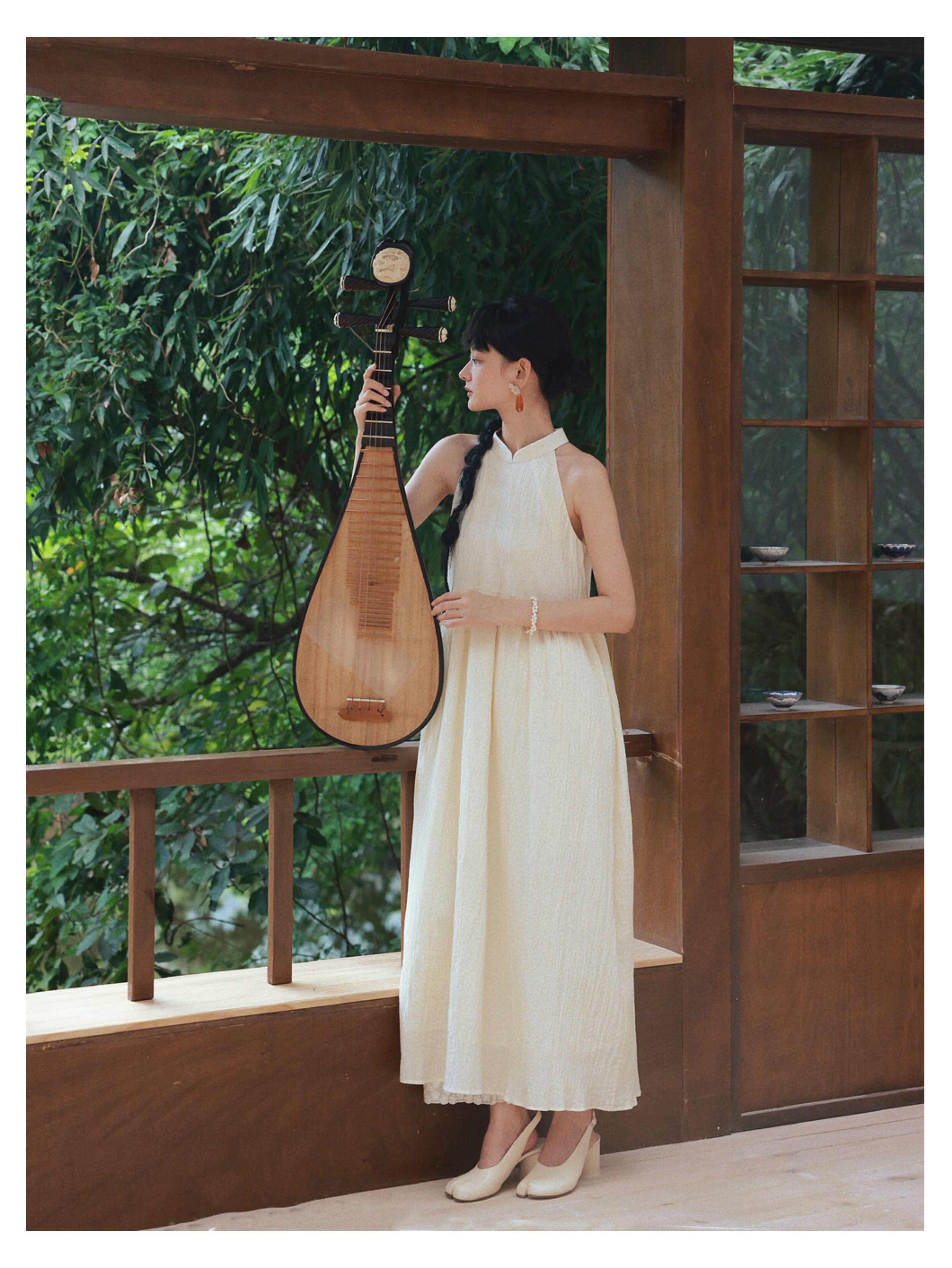 Playful Design 24A/W New Chinese Style Stand Collar Halter Neck Sleeveless Almond Light Yellow Bubble Cotton Loose Dress