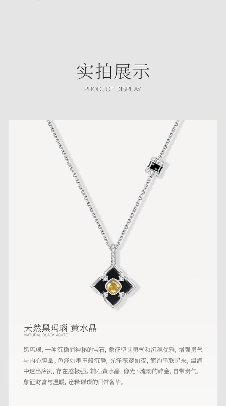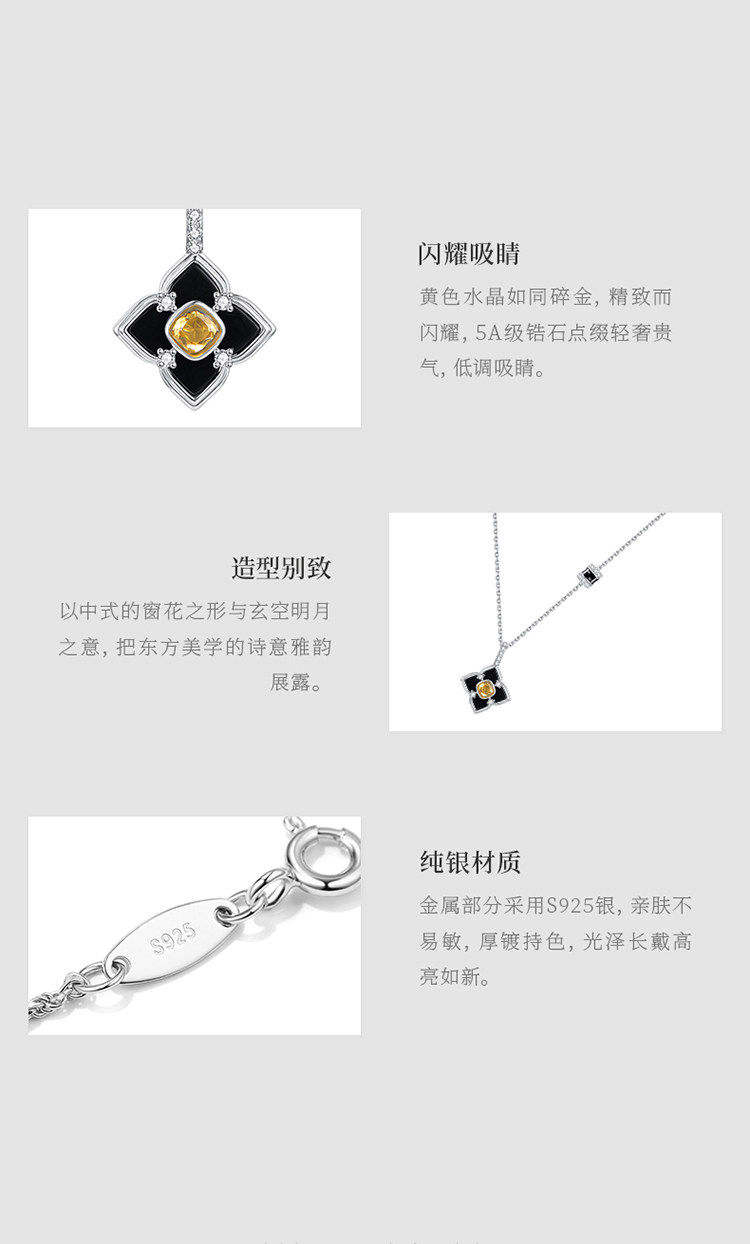 iSTONE Four-Leaf Clover Necklace with Window Flower Design, Light Luxury Black Onyx Flower, Citrine, Sterling Silver Choker Pendant