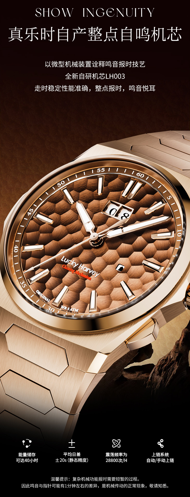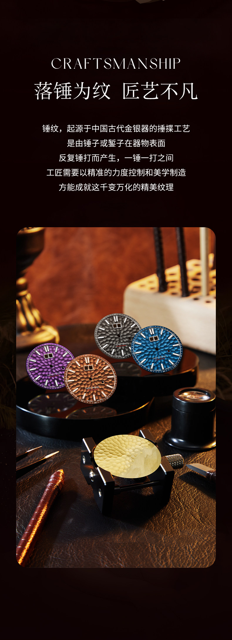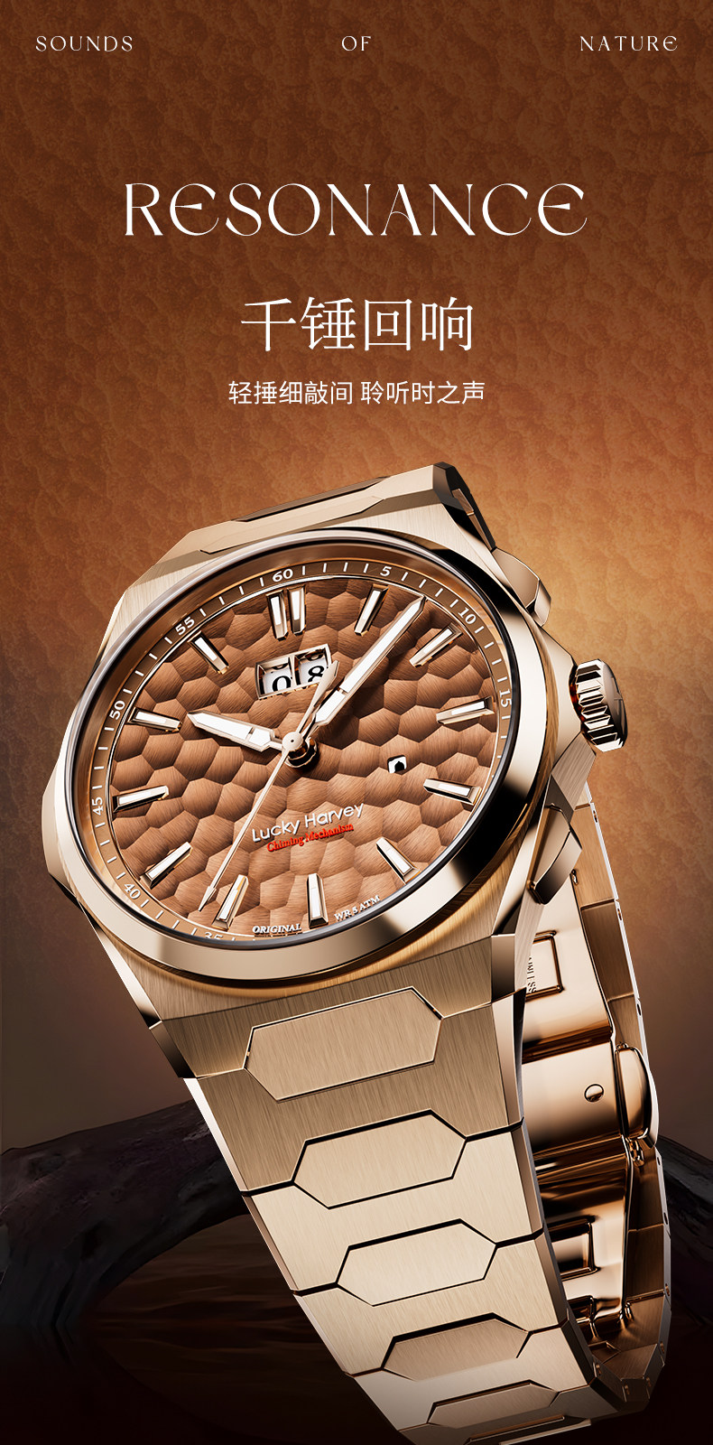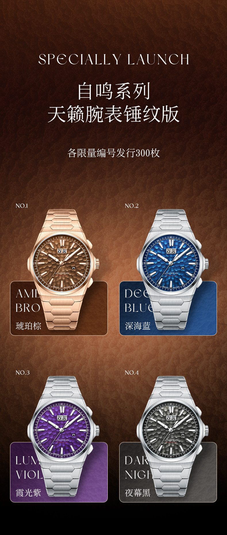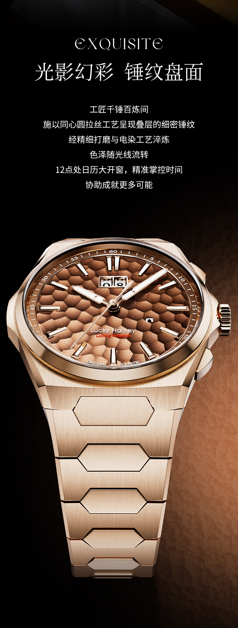 [Limited Edition] Lucky Harvey Self-Winding Series Hammered Texture Men's Watch Mechanical Watch Amber Brown