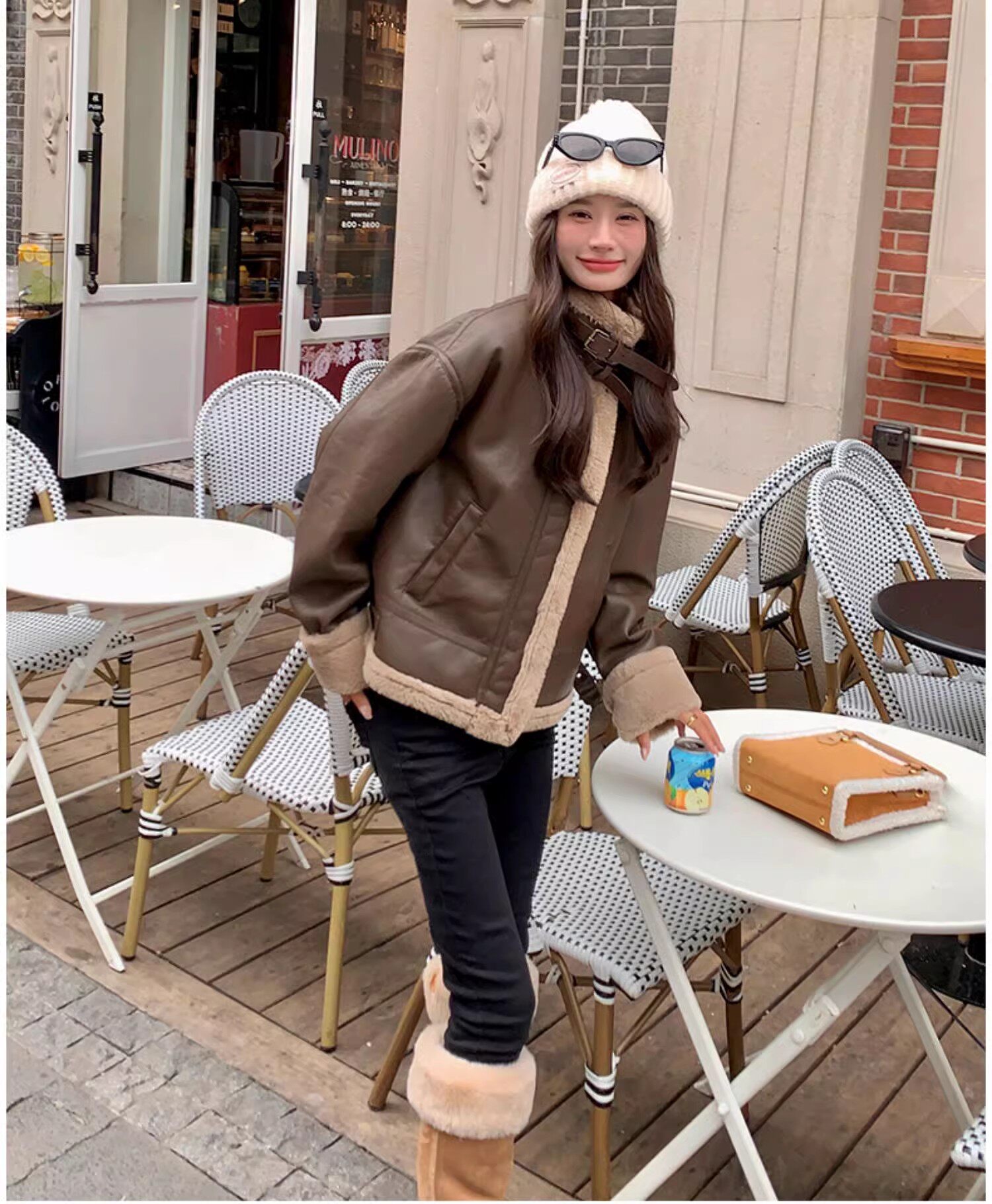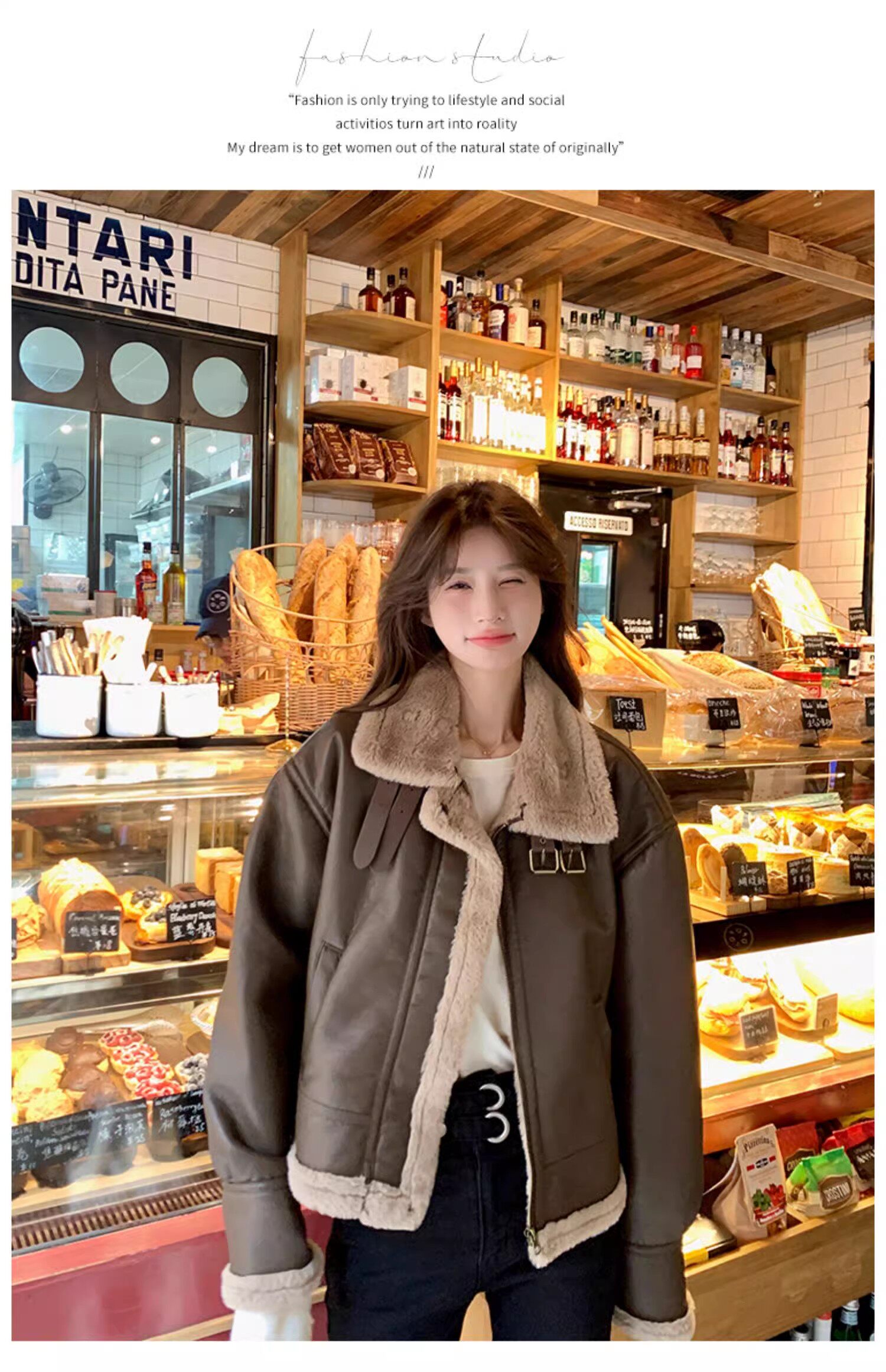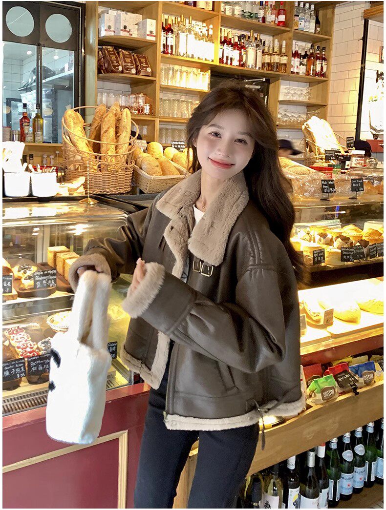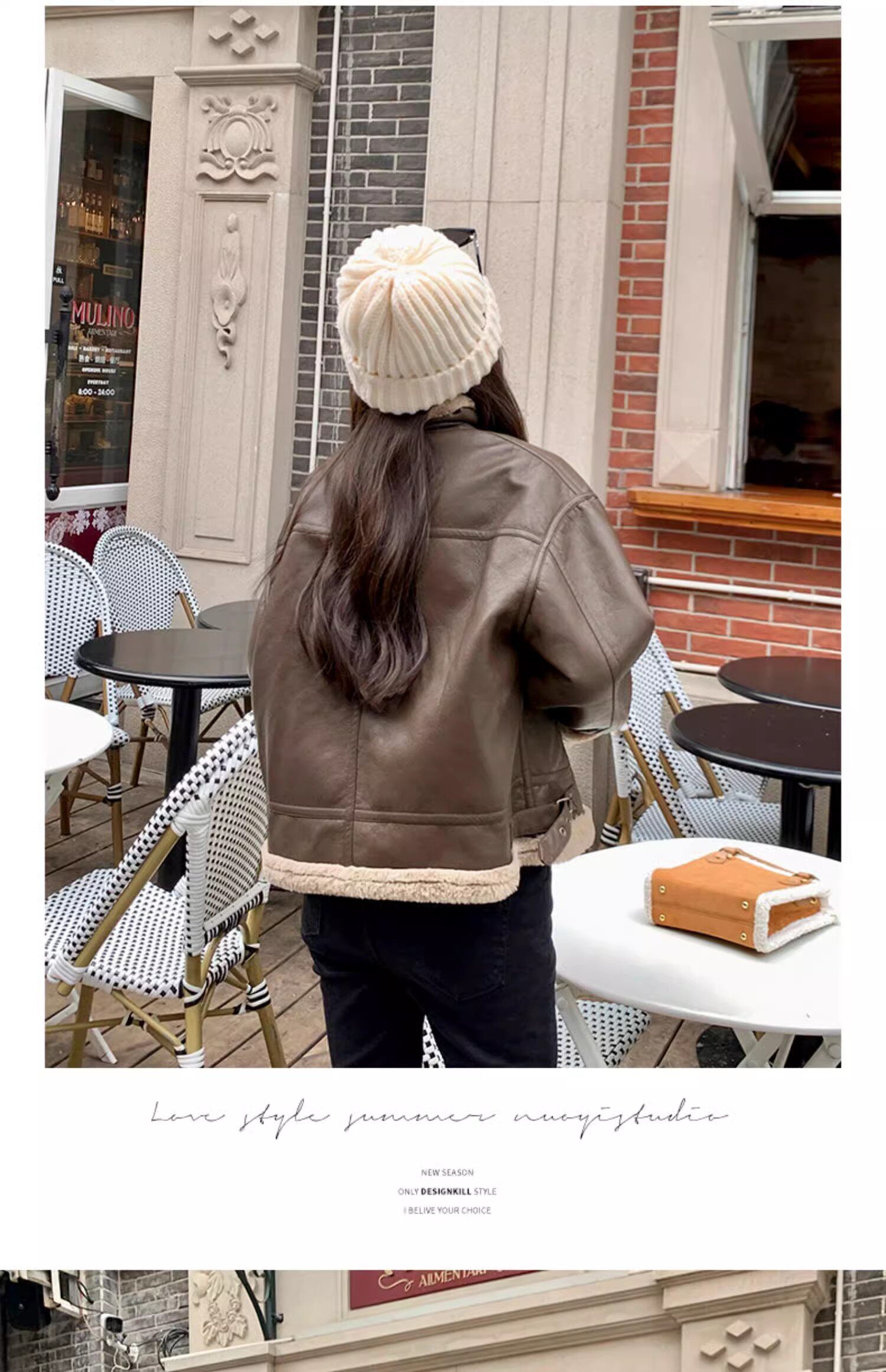 In Stock】Faux Fur Integrated Lamb Wool Biker Jacket for Women, Winter Short Style, Stand Collar, Long Sleeves, American Retro Jacket
