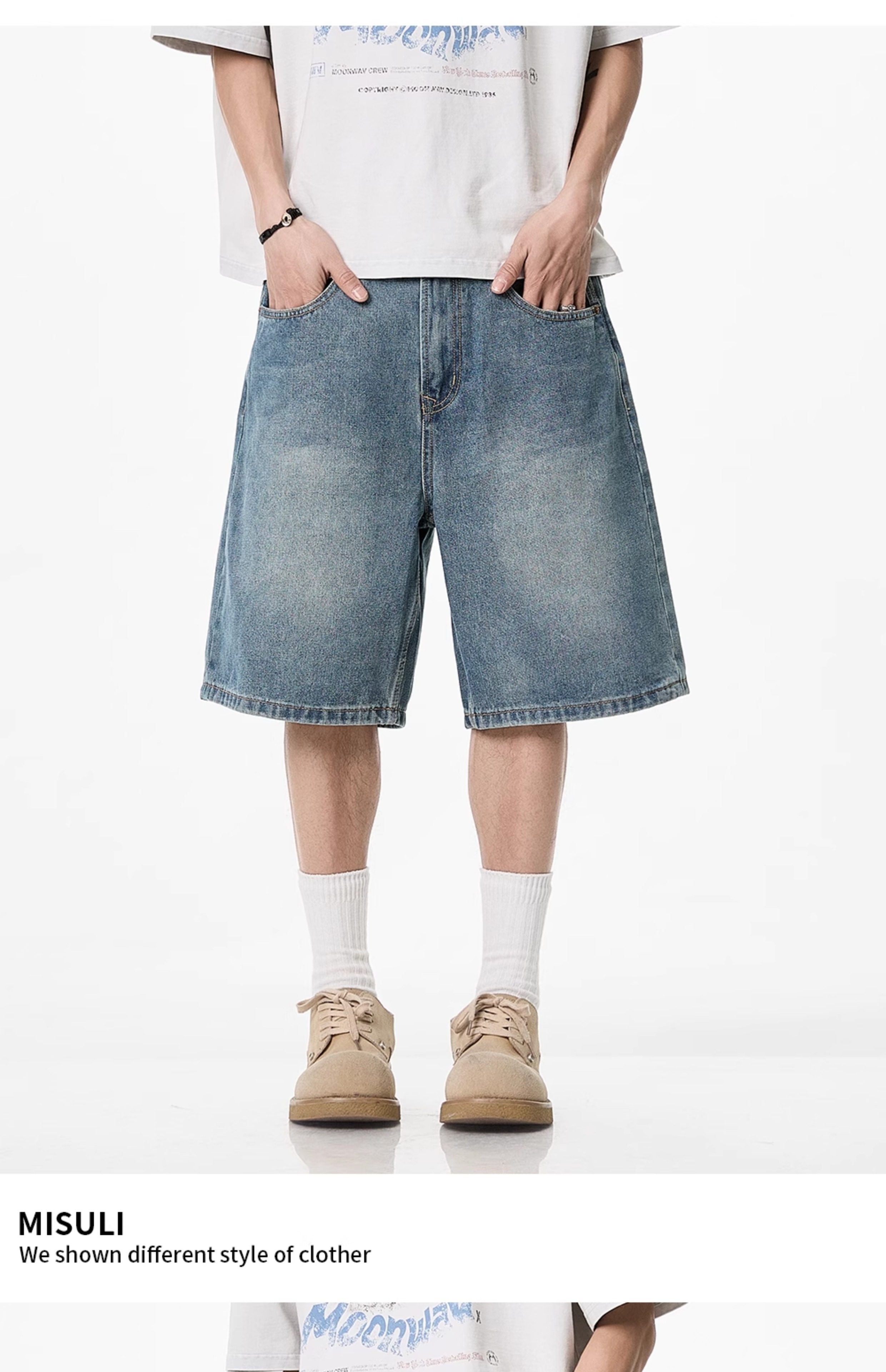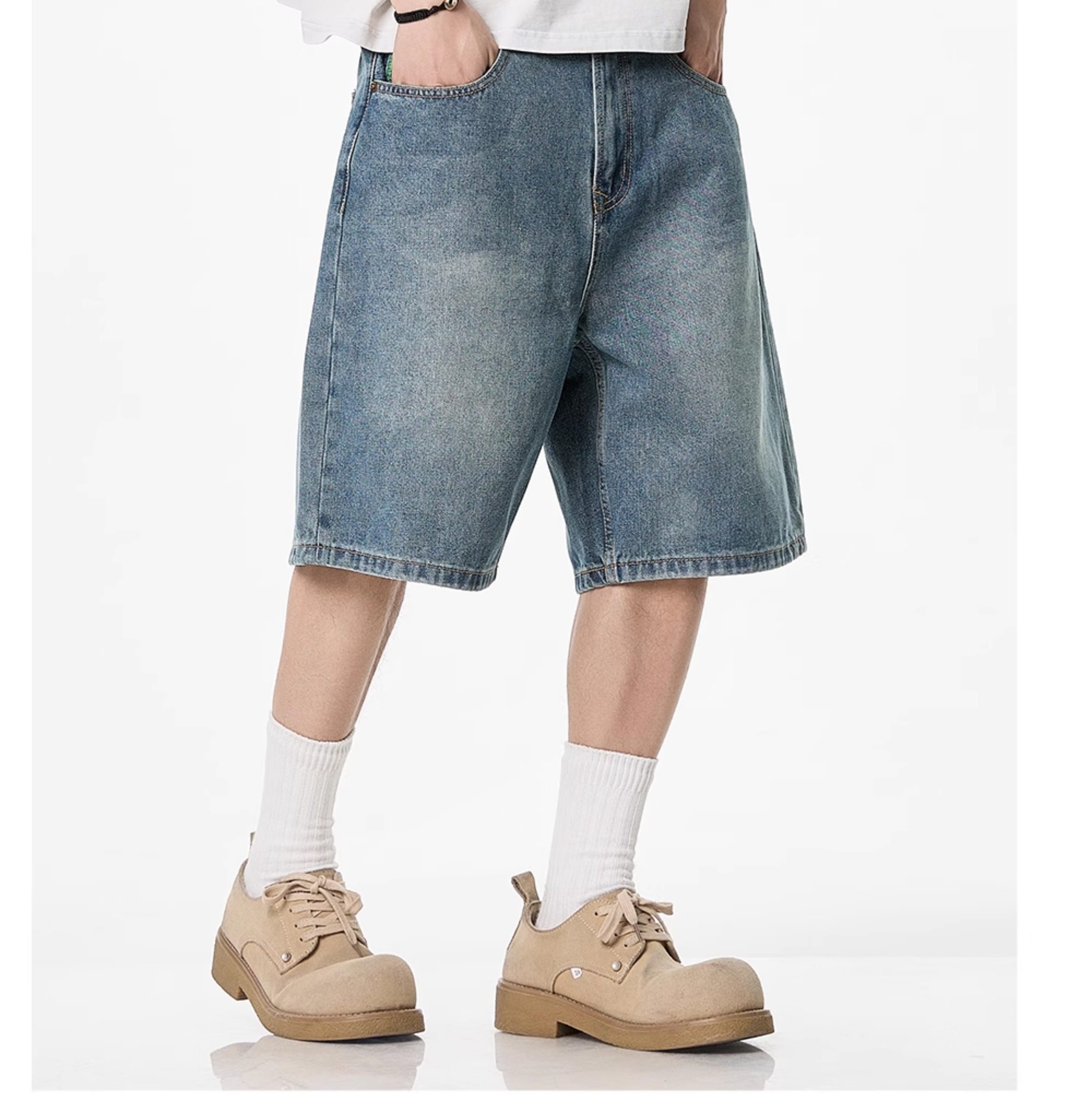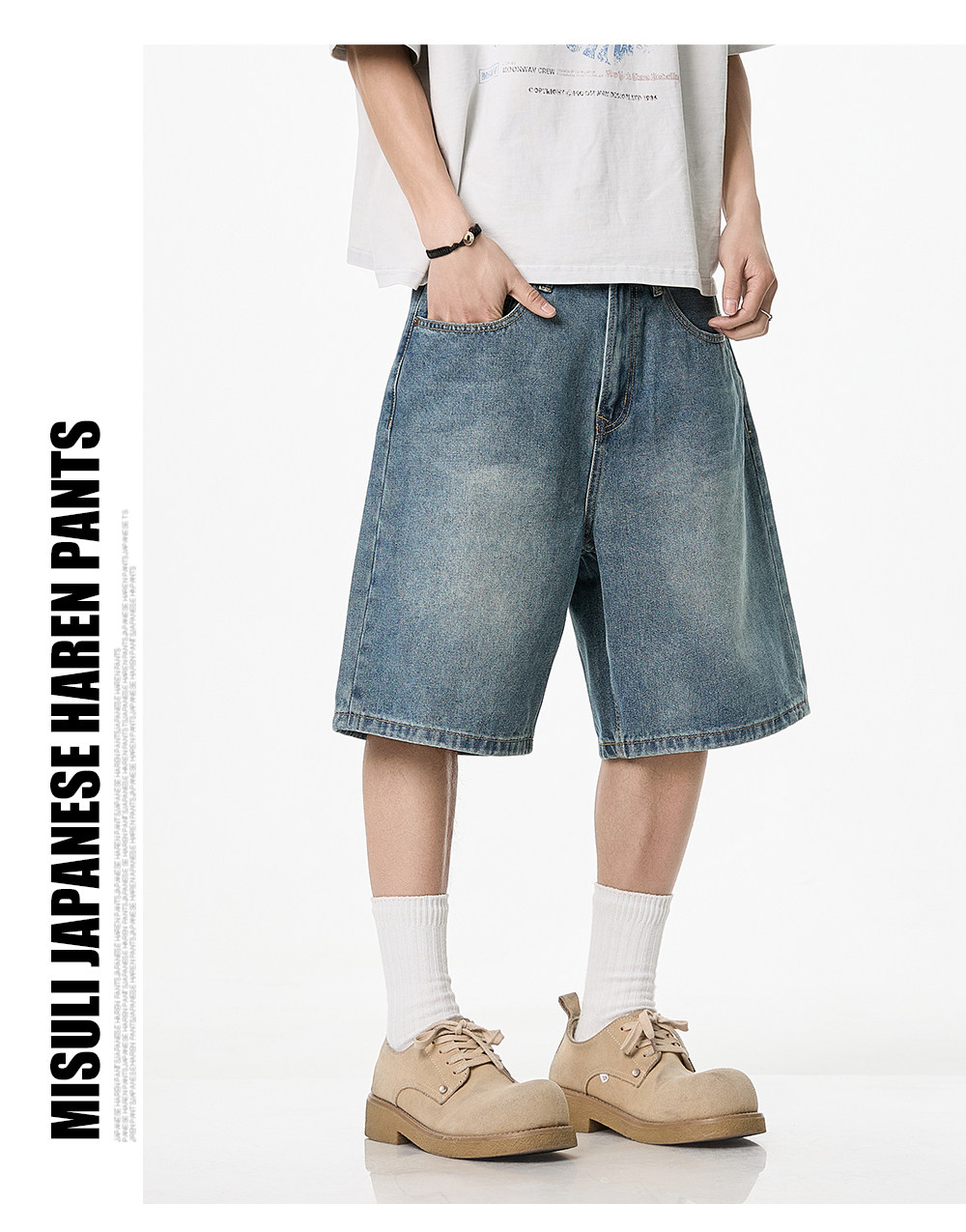 American Retro Heavy Washed Denim Shorts for Men, Trendy and Cool, Loose Fit, Plus Size, Five-Point Pants, Summer Thin Style