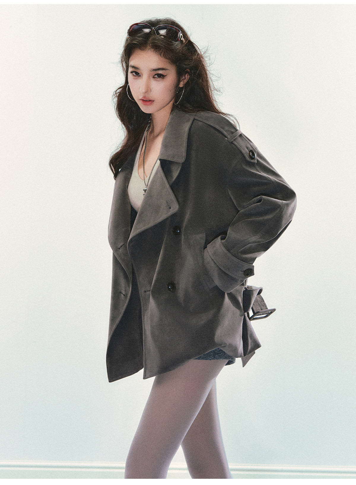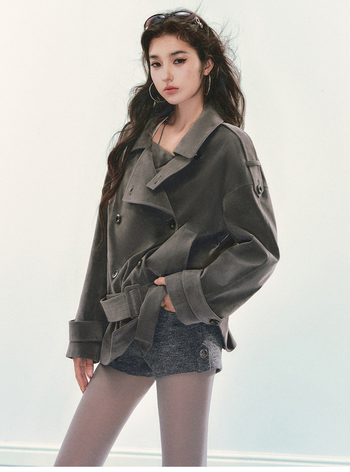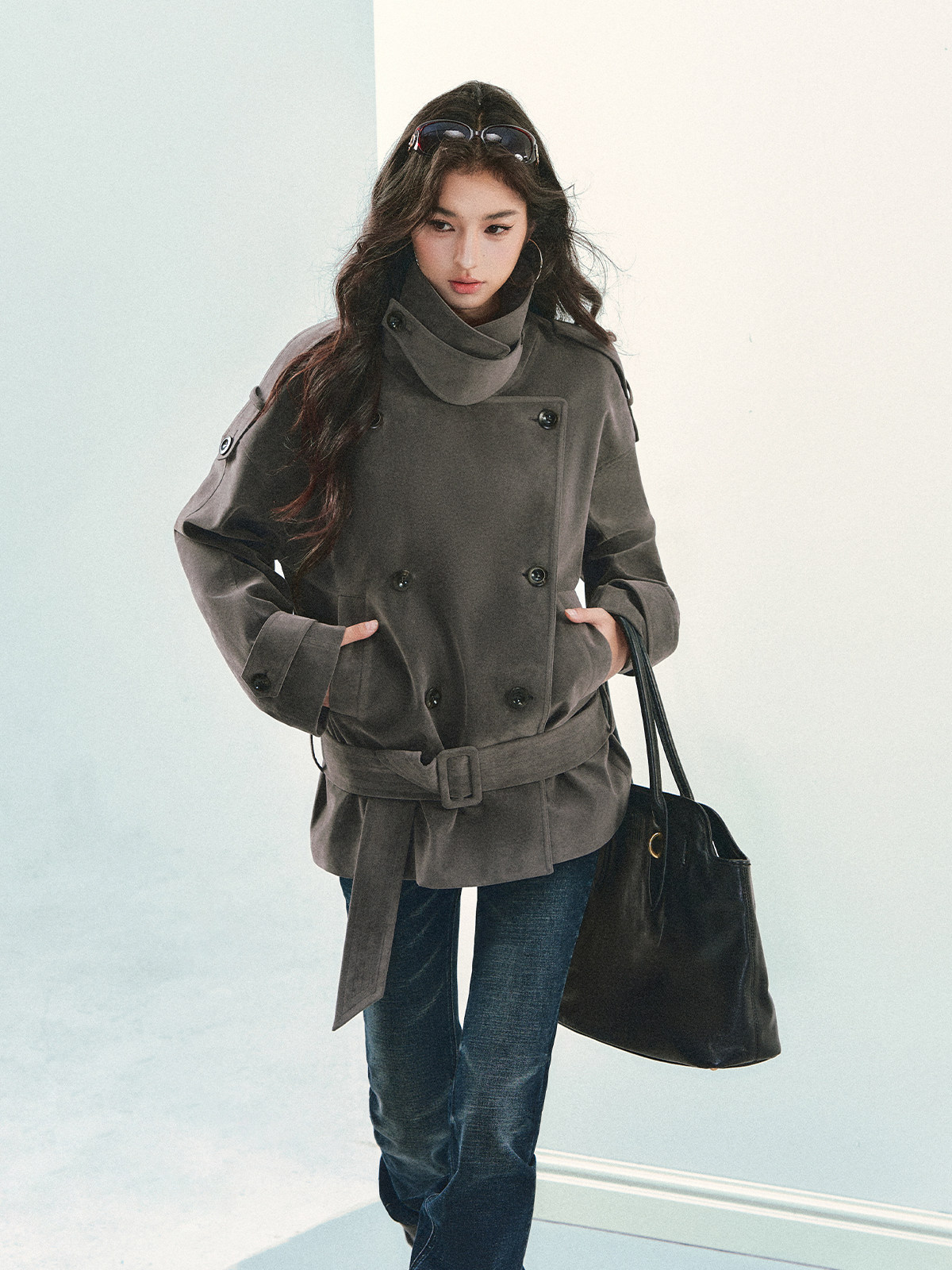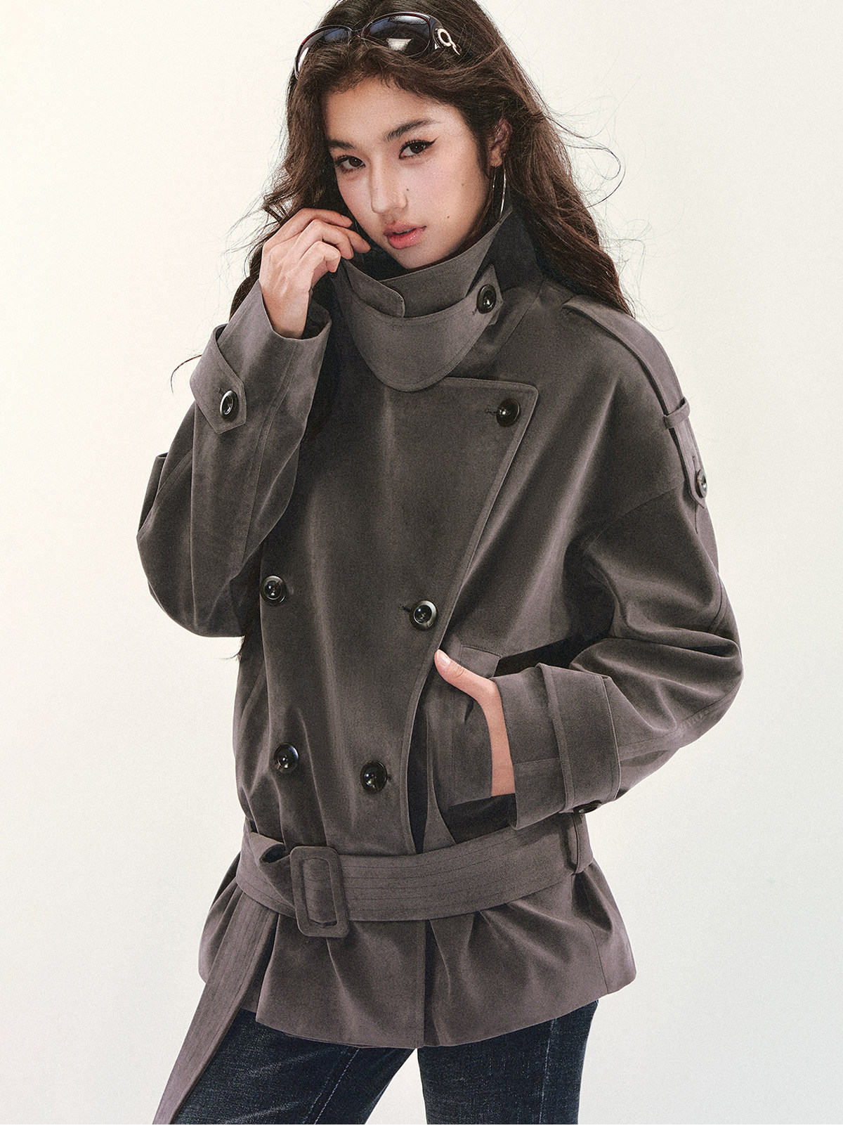 『Huyiyao's Style』Andyet Ad1 Suede Trench Coat Jacket for Women with Stand Collar, Double-Breasted, Padded Outerwear Top