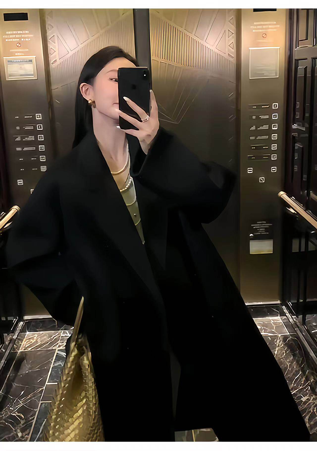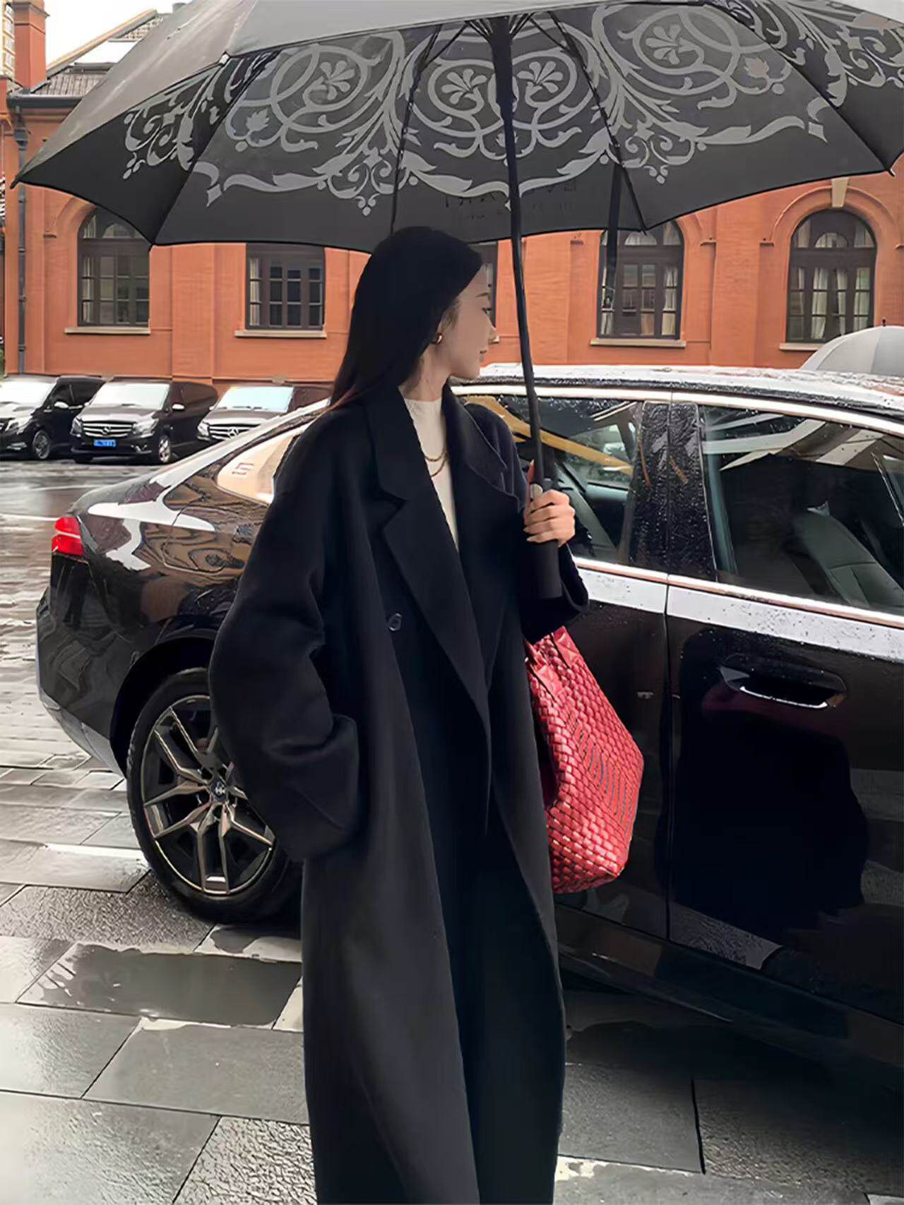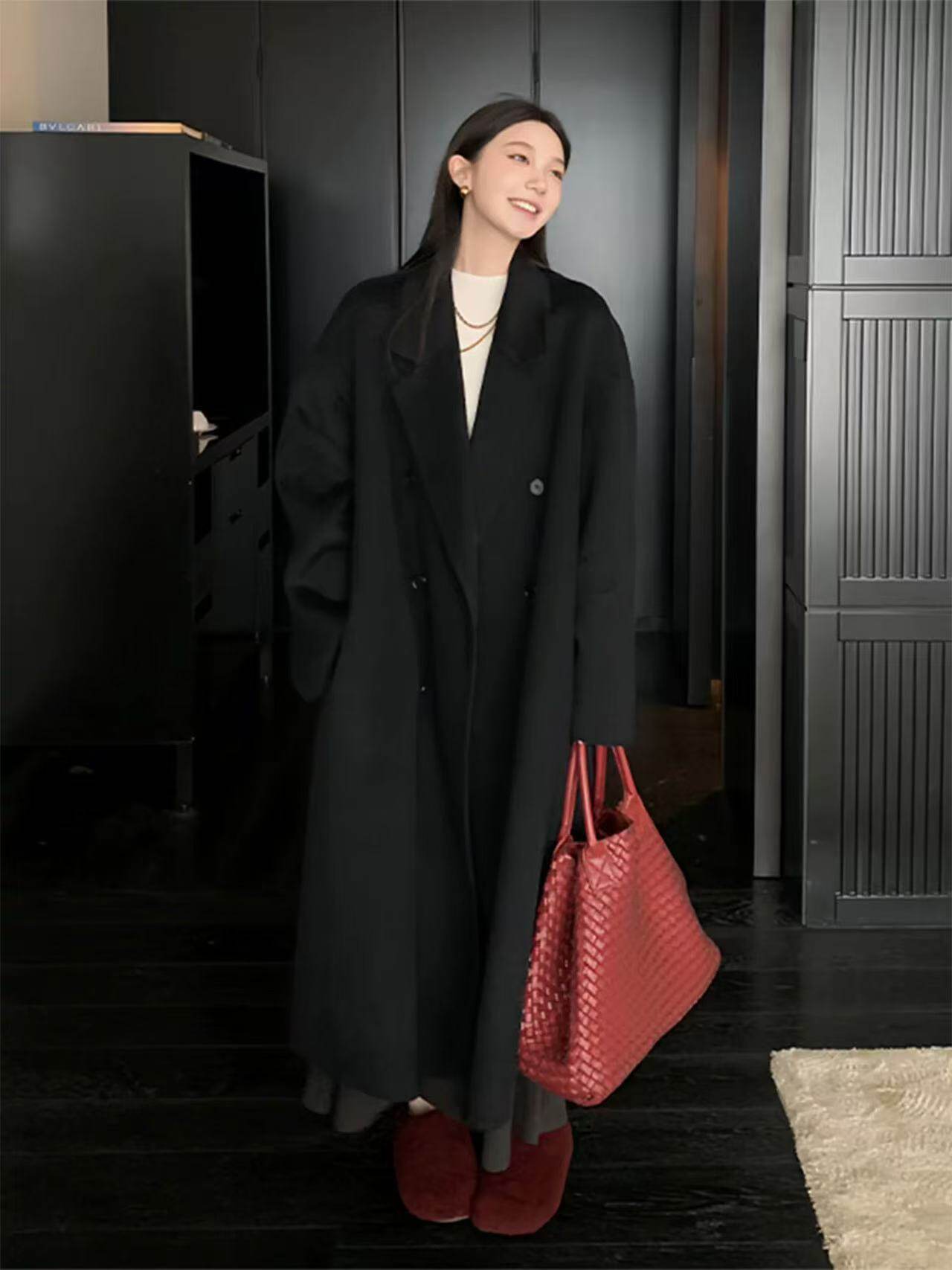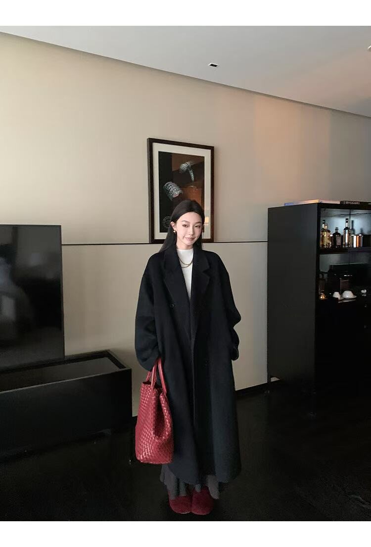 Black Wool Double-Sided Coat for Women, New Winter Style, Lazy Style, Elegant Mid-Length Double-Breasted Woolen Coat