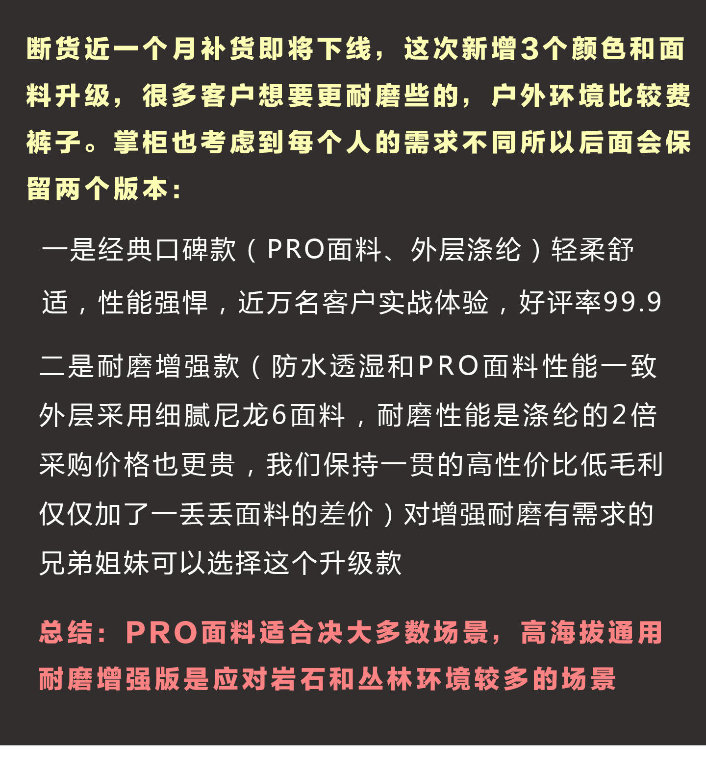 兄弟姐妹们催着掌柜开发的高性能冲锋衣来啦,冲锋裤口碑面料再升级,外层采用超耐磨尼龙,中间覆昂贵的EPTFE高透膜,全身YKK防水拉链,功能配置直接拉满。男女同款,投票醉多的5个颜色均已安排,价格非常划算,同价位性价比天花板,可以趁着活动入手。详情点我直达:https://item.taobao.com/item.htm?ft=t&id=1003502857294&spm=a21dvs.23580594.0.0.4fee2c1bja1waj