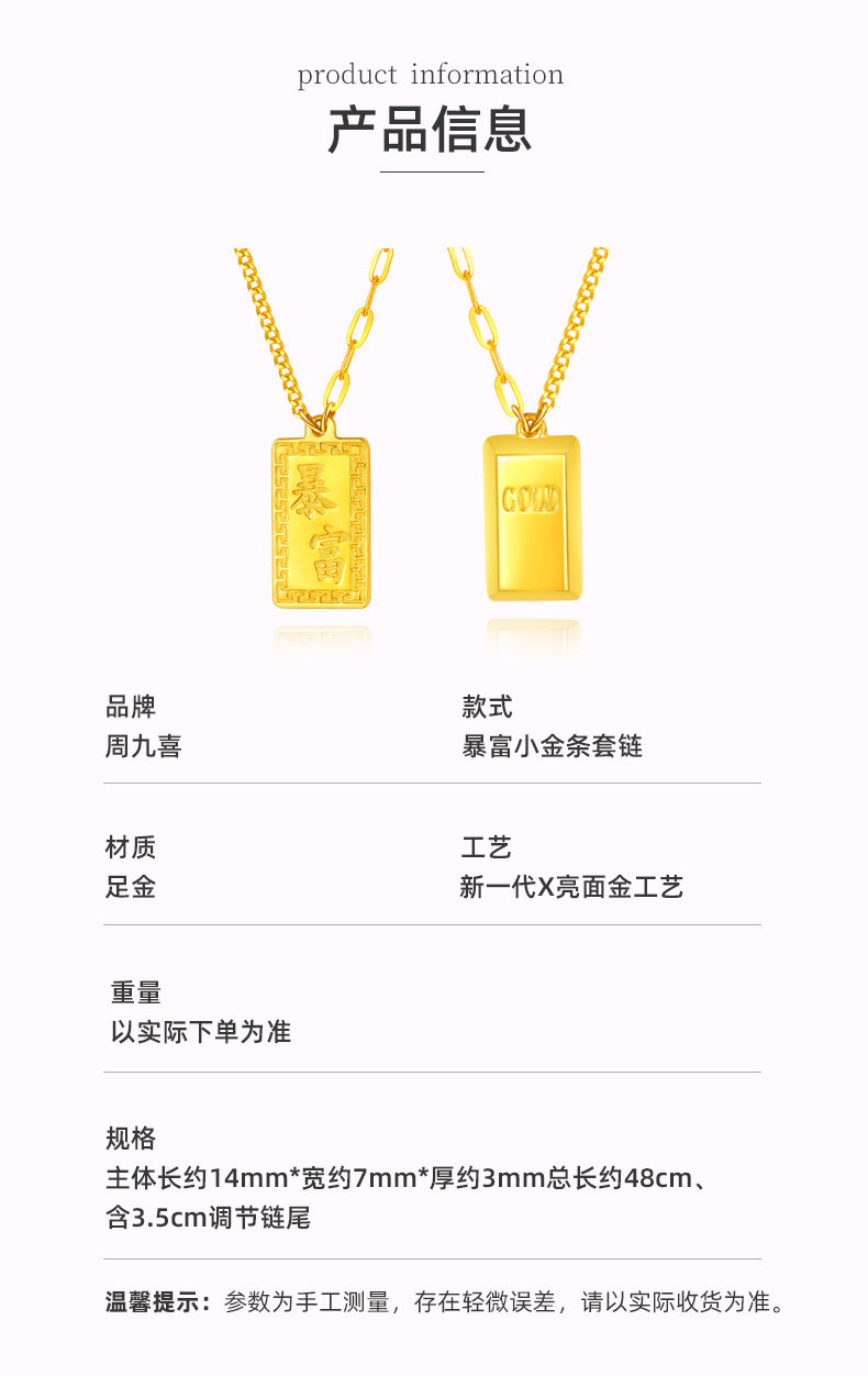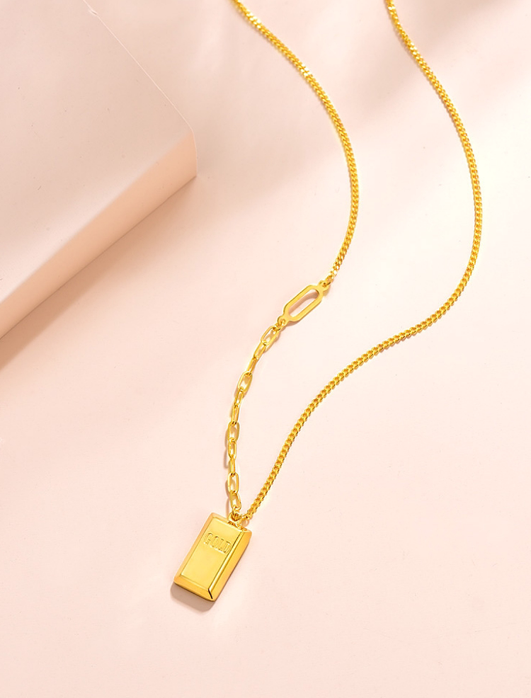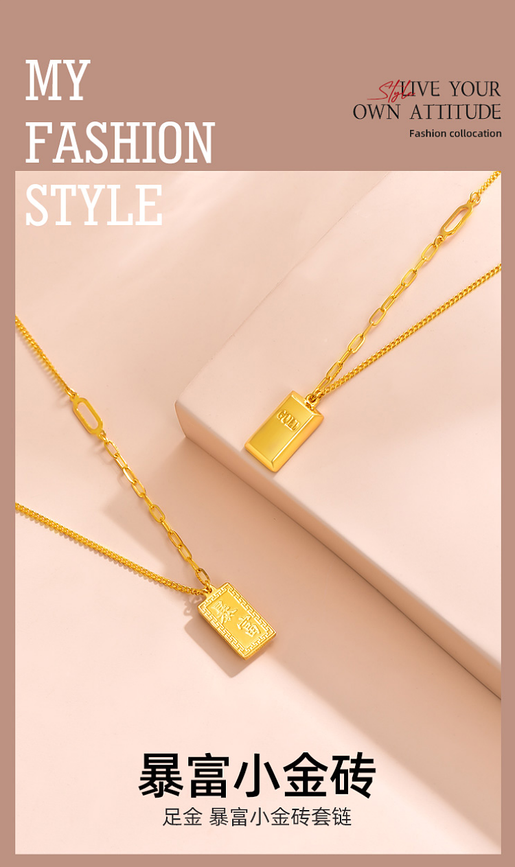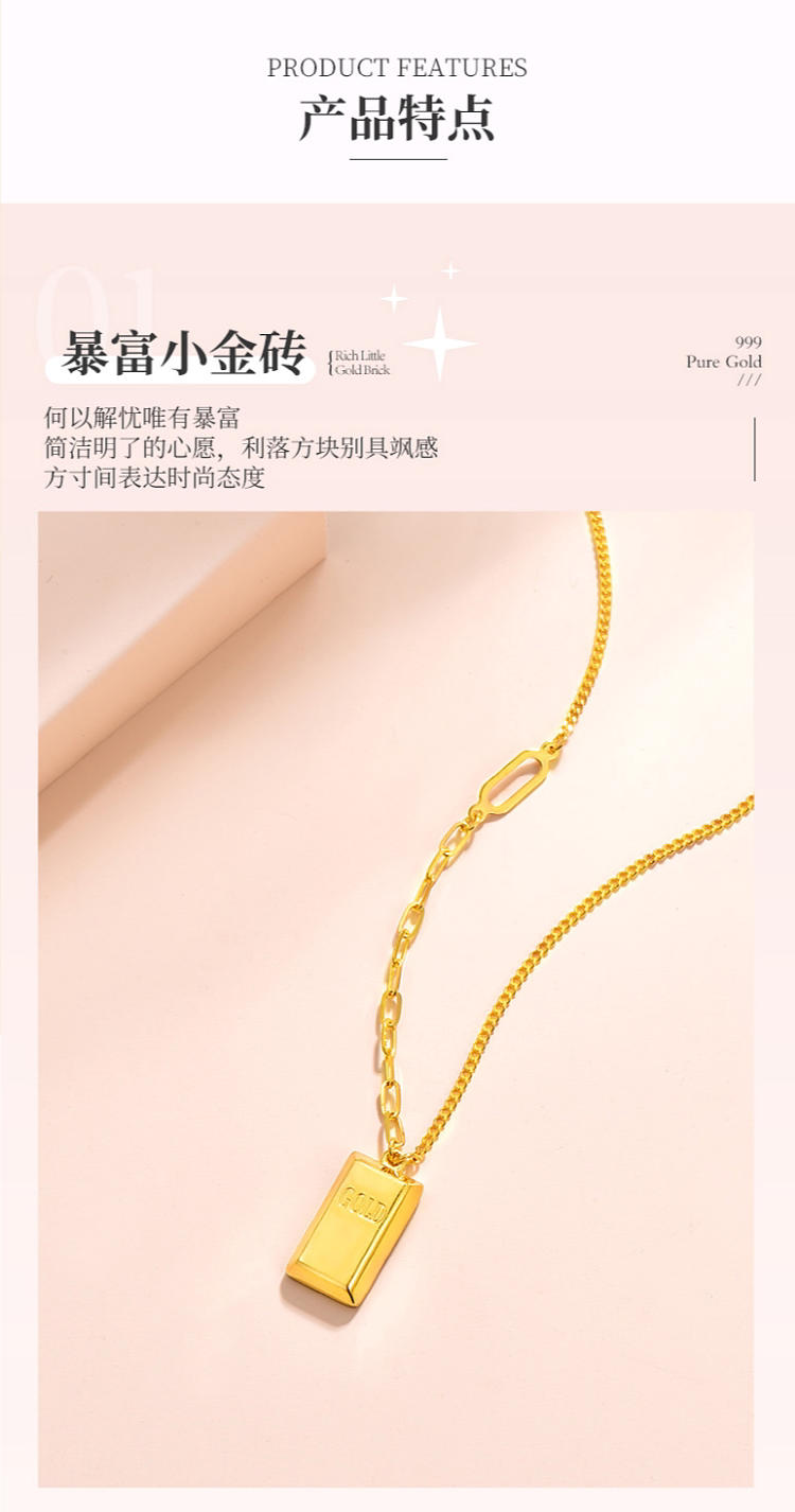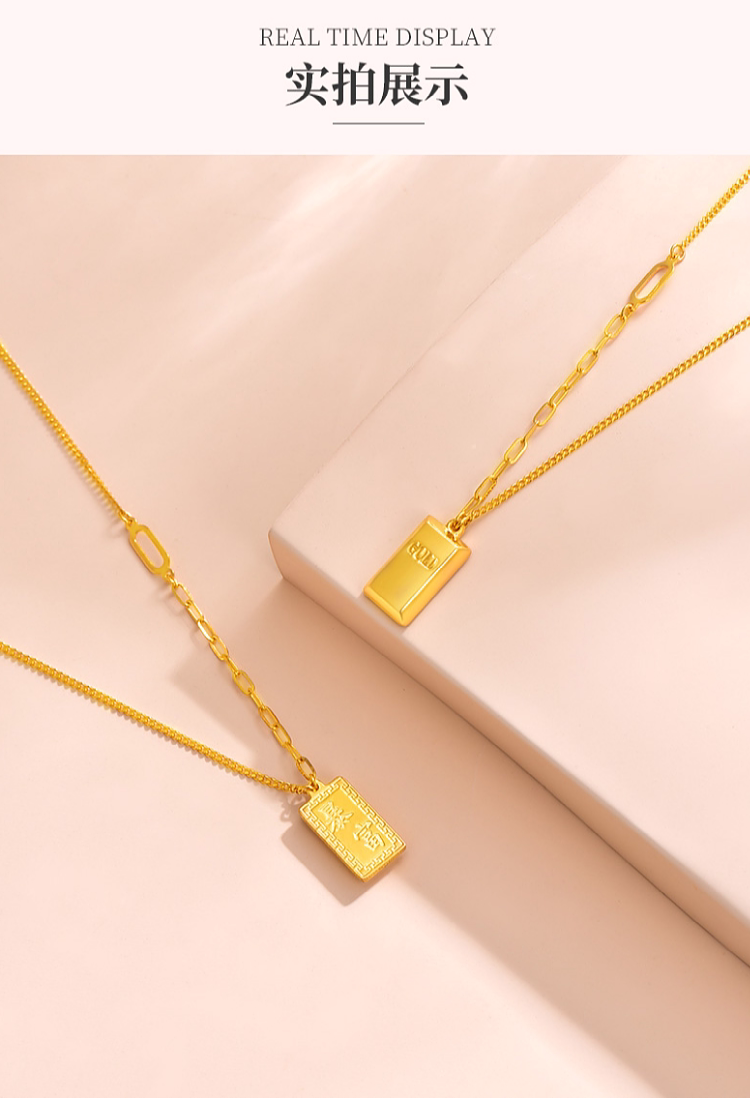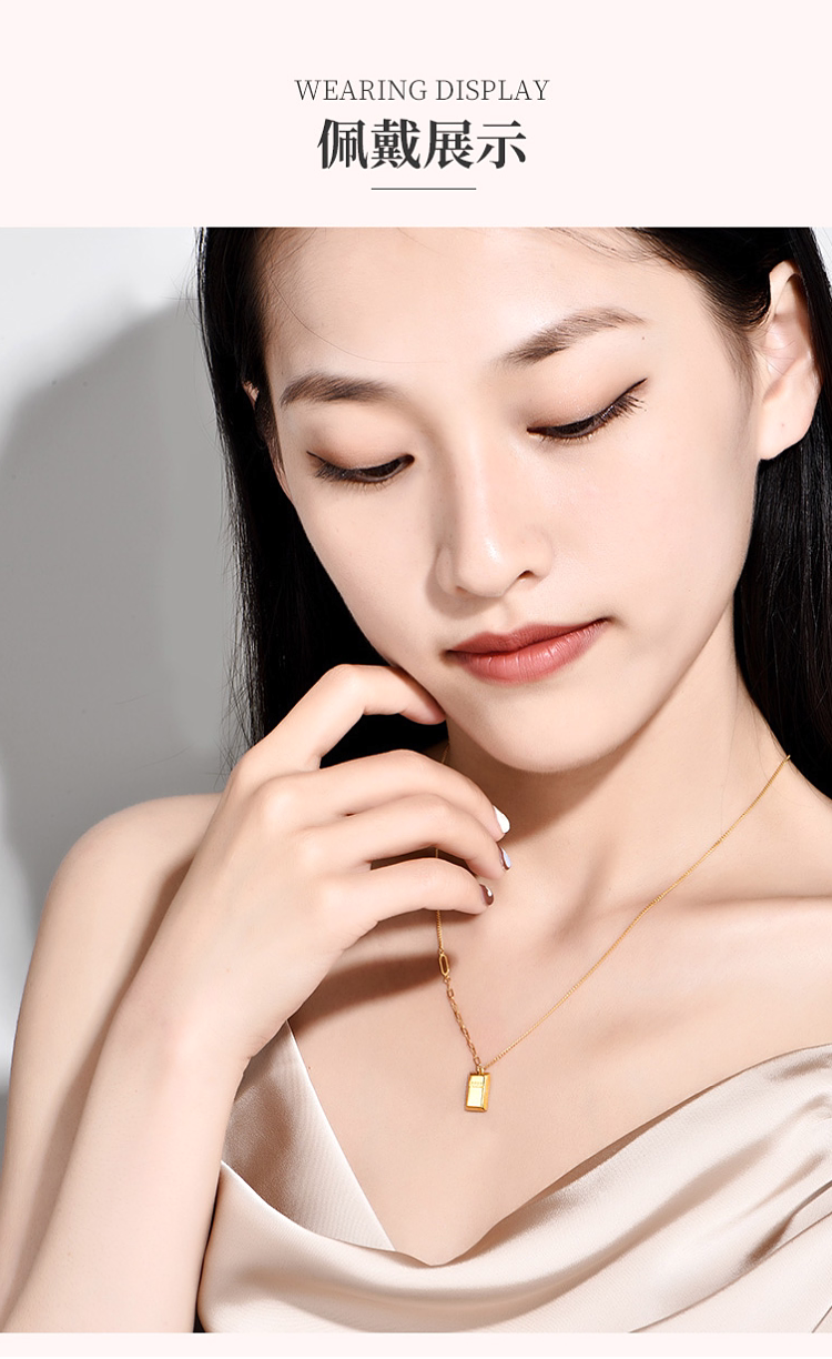 Zhou Jiuxi Pure Gold 999 Fortune-Bringing Small Gold Bar Necklace 5g Gold Bar Necklace Gift for Girlfriend or Wife for Qixi Festival