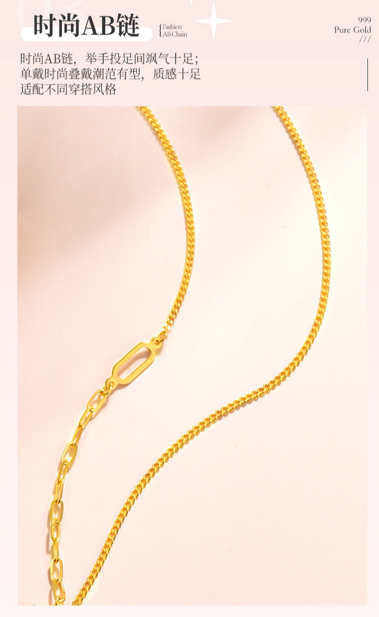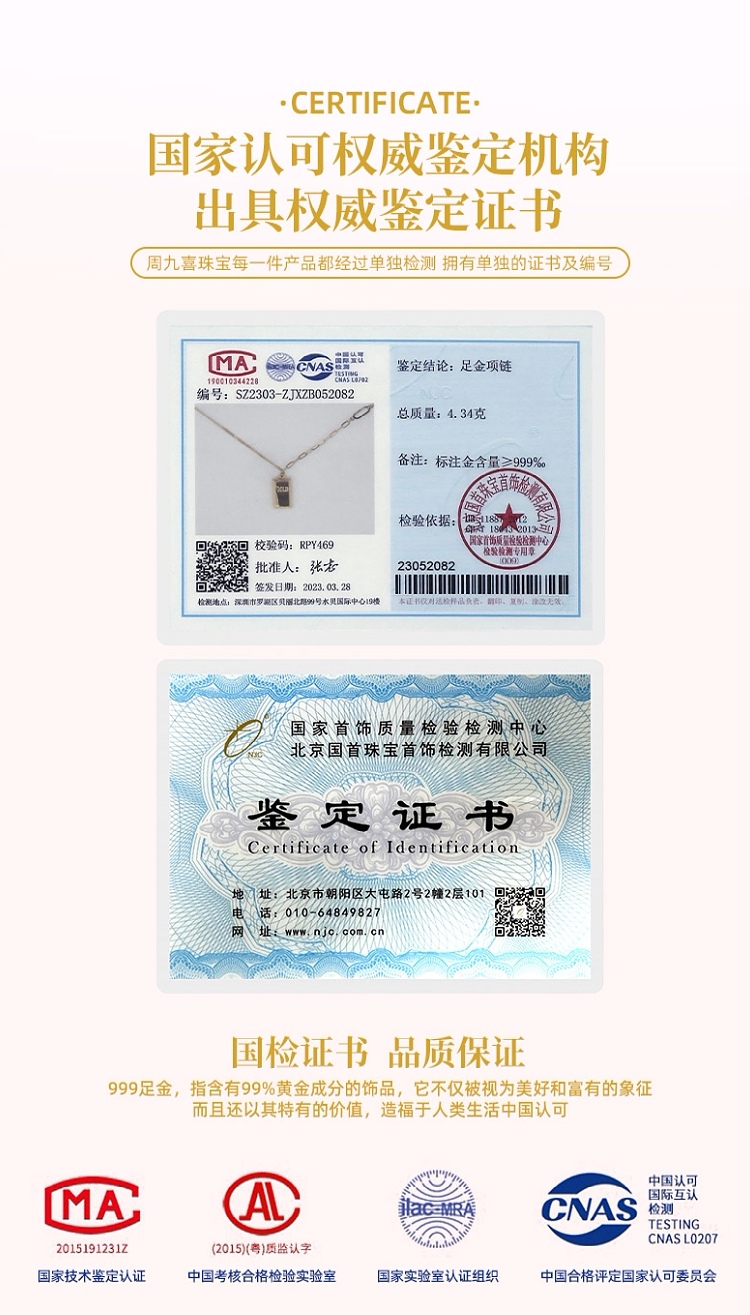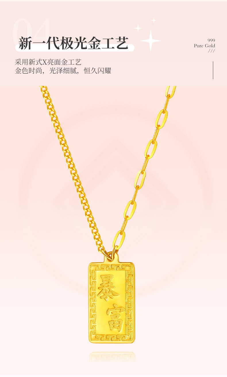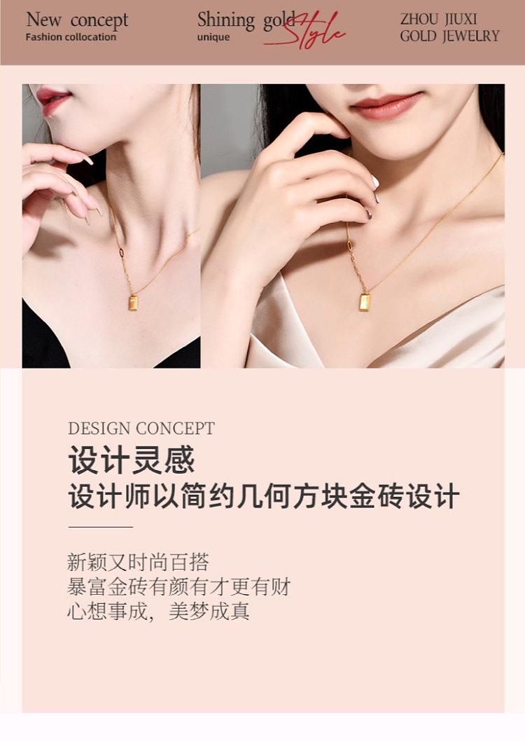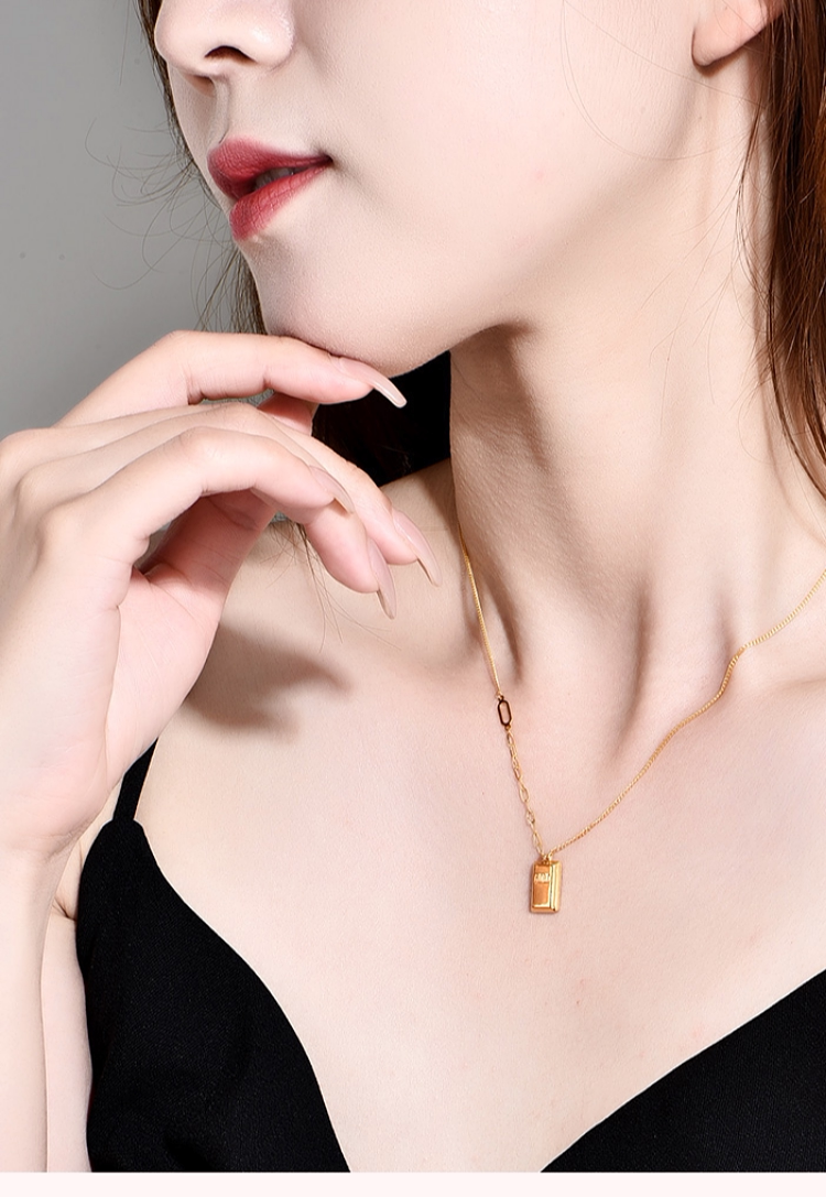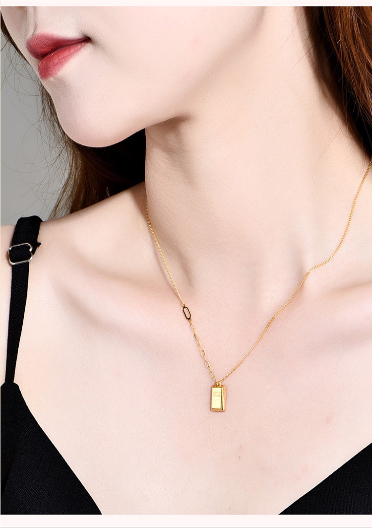 Zhou Jiuxi Pure Gold 999 Fortune-Bringing Small Gold Bar Necklace 5g Gold Bar Necklace Gift for Girlfriend or Wife for Qixi Festival