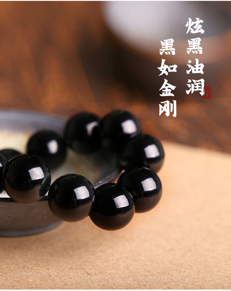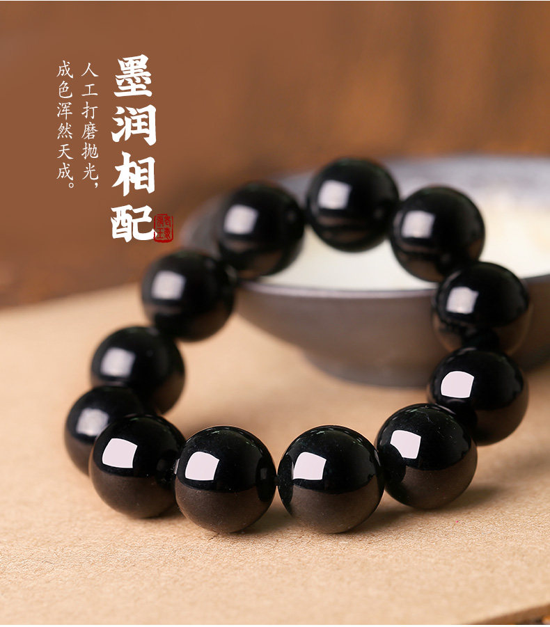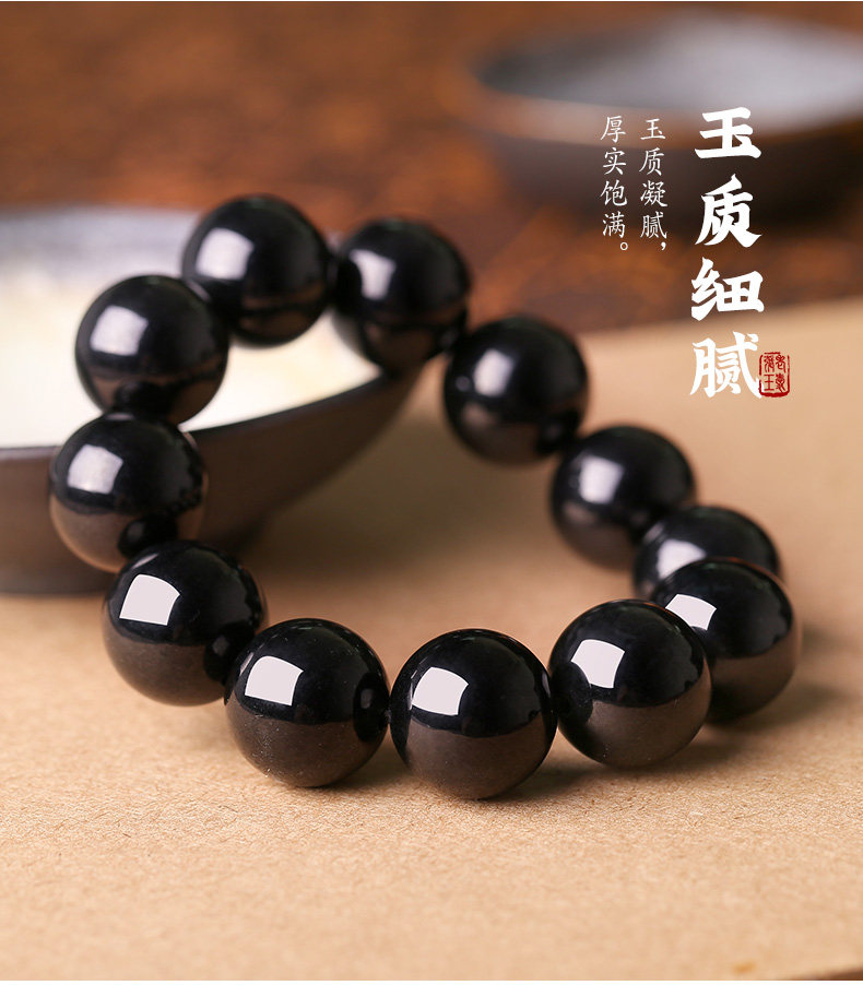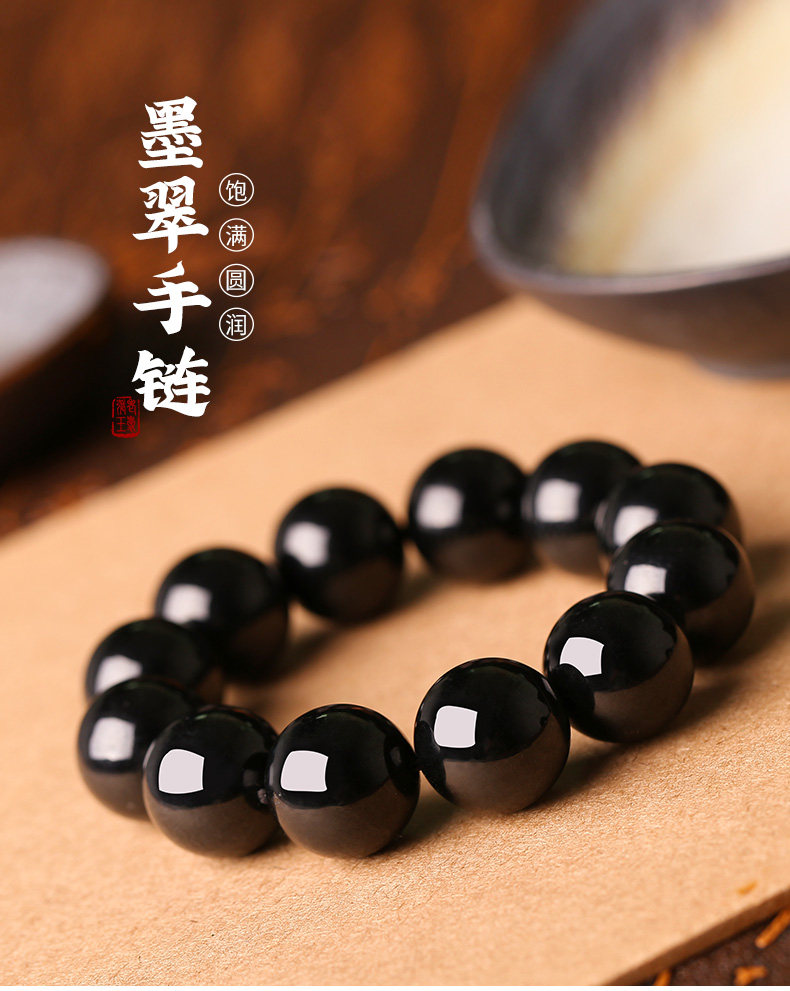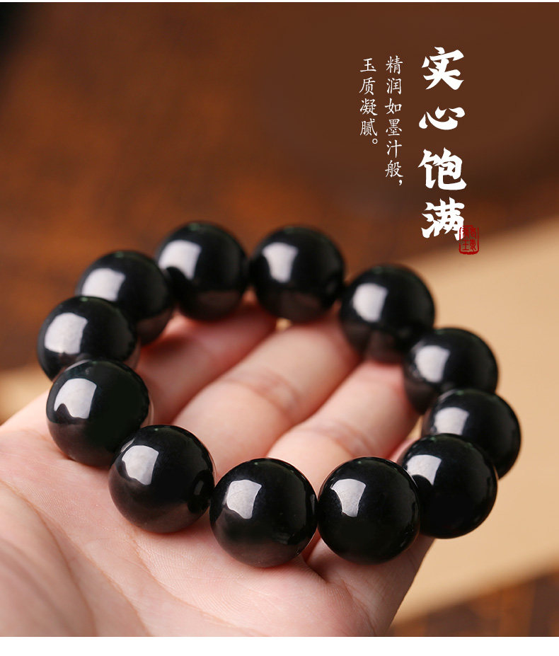 Xiangzhengfu Natural Jade Bracelet for Men, Ink Green Round Beads Bracelet, Single Circle, Ice Waxy Grade a Beads Chain
