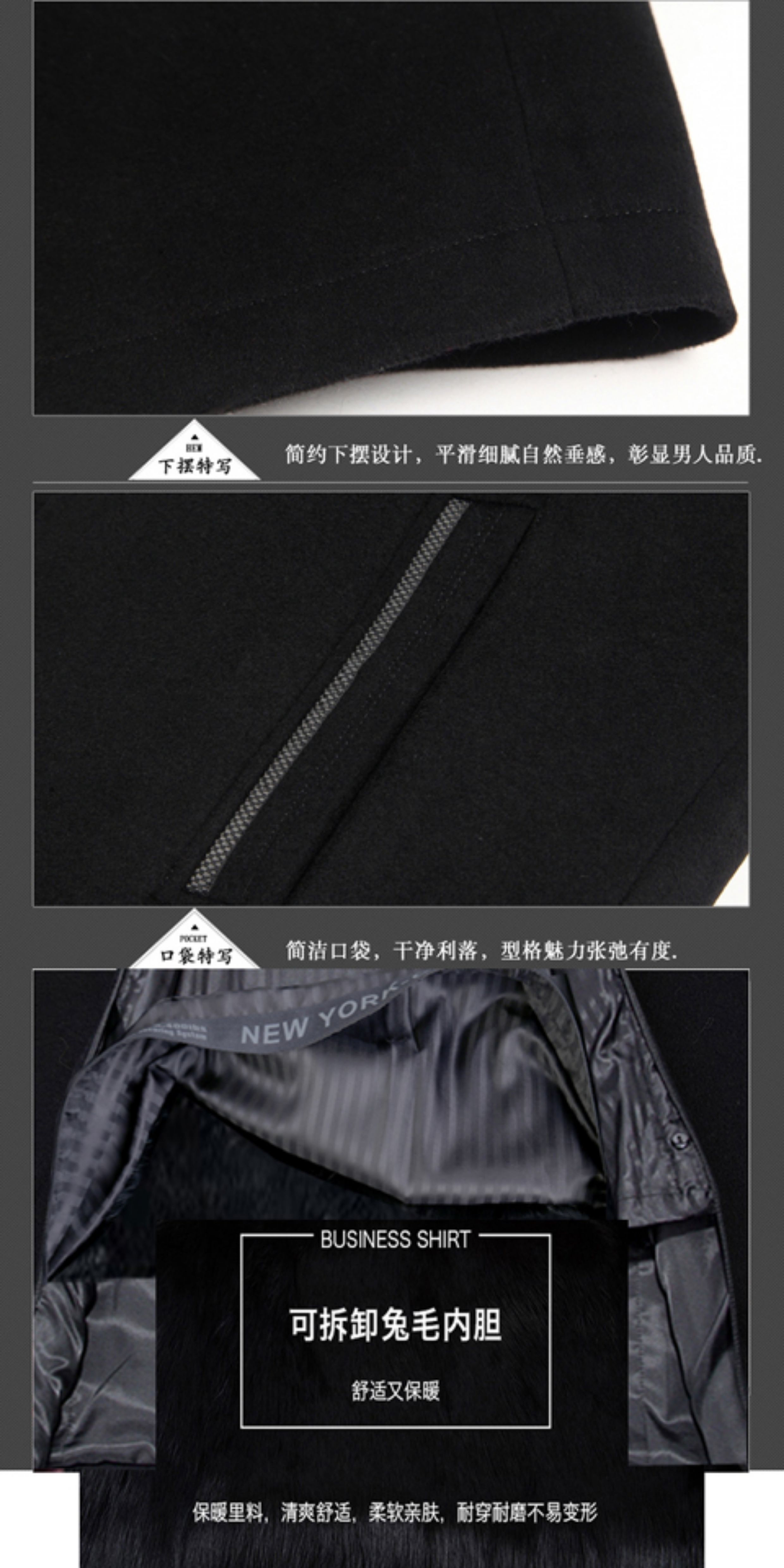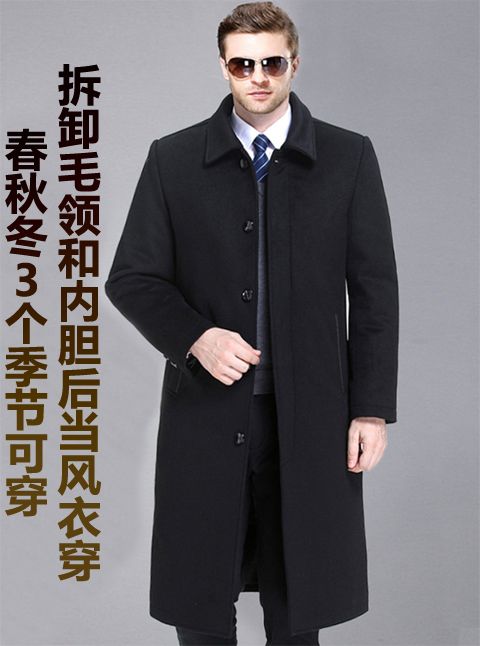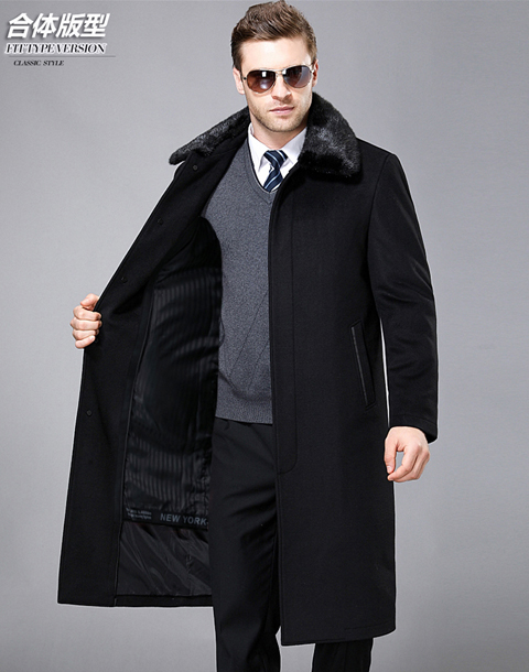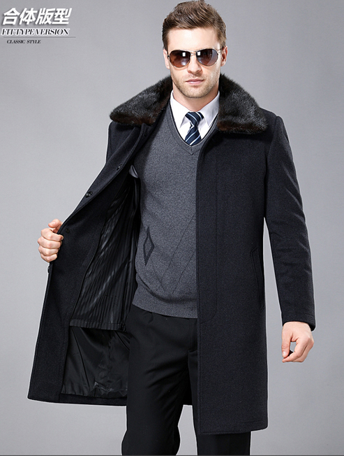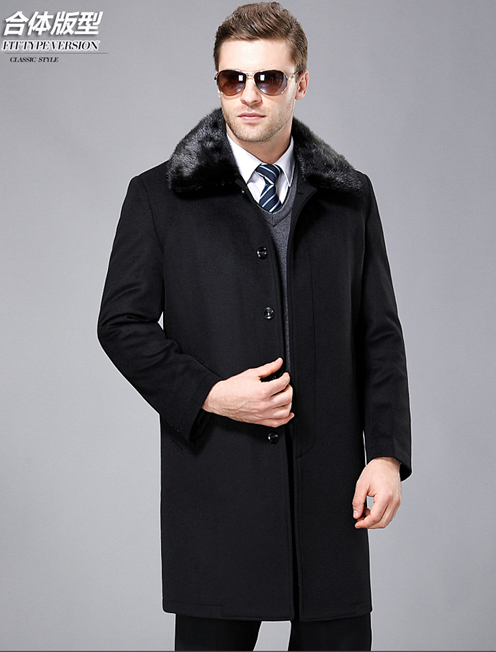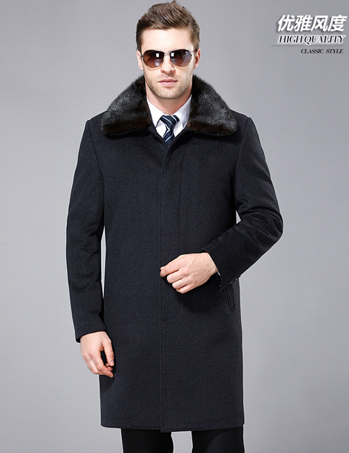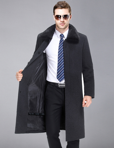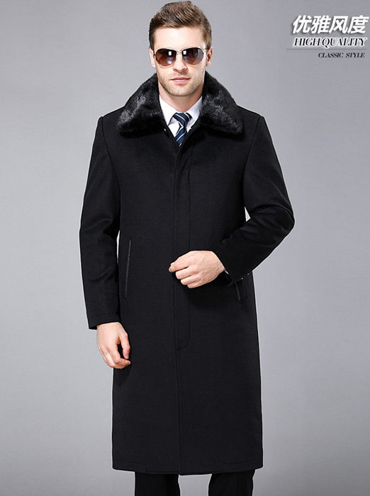 Pierre Cardin High-End Cashmere Wool Coat for Men, Extra-Long, Over-The-Knee, with Mink Fur Collar, Suitable for Middle-Aged and Elderly People