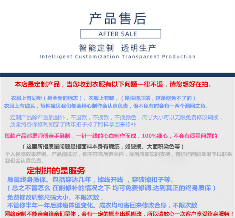 本店纯属成衣定制,不代表任何品牌,请大家端正购买心态!由于定制产品的特殊性质,一人一版,无法二次销售,本店除严重质量外,不接受任何理由的退款退货!请谨慎下单,有疑问请联系客服,拍下付款既为认同此申明!底下有下单流程和售后说明请大家务必看完只有更专业才能更完美 !