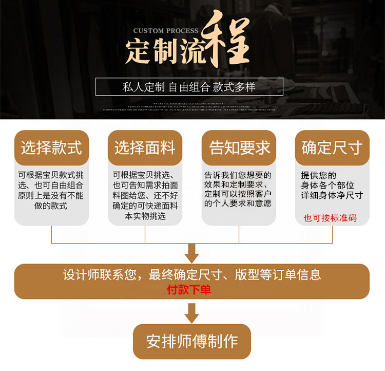 1、选好要定的款式。(面料、颜色、工艺等均可自选请与旺旺沟通联系)