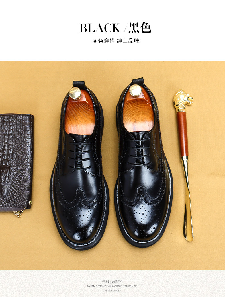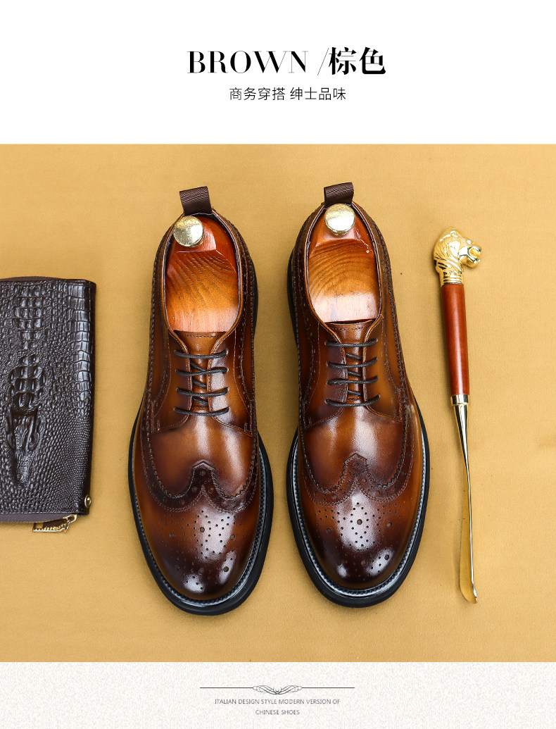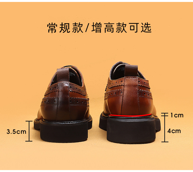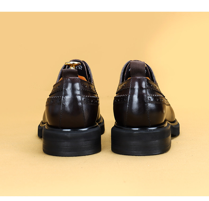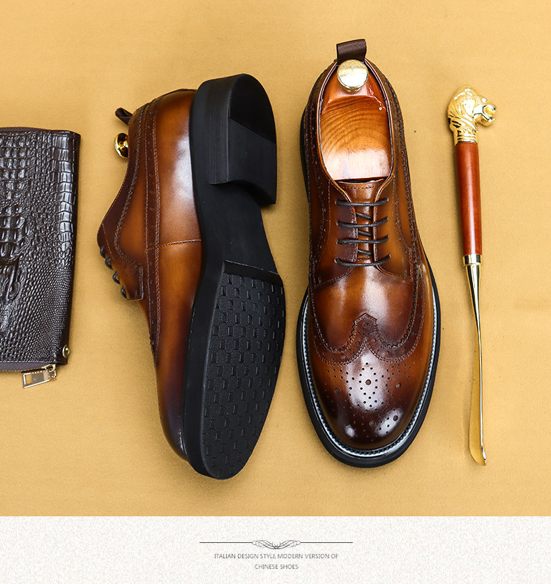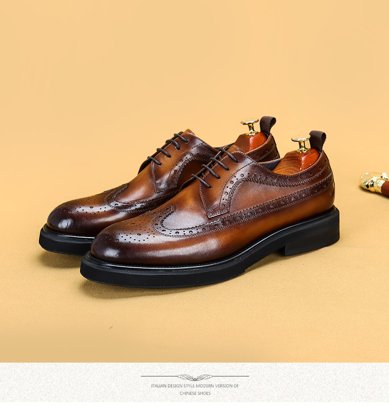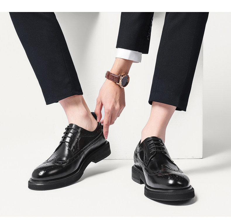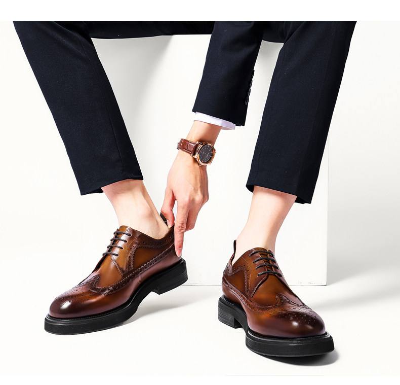 British Brogue Carved Men's Shoes with Thick Soles and Height-Increasing Features, Genuine Leather Men's Brown Business Formal Leather Shoes for Grooms and Weddings