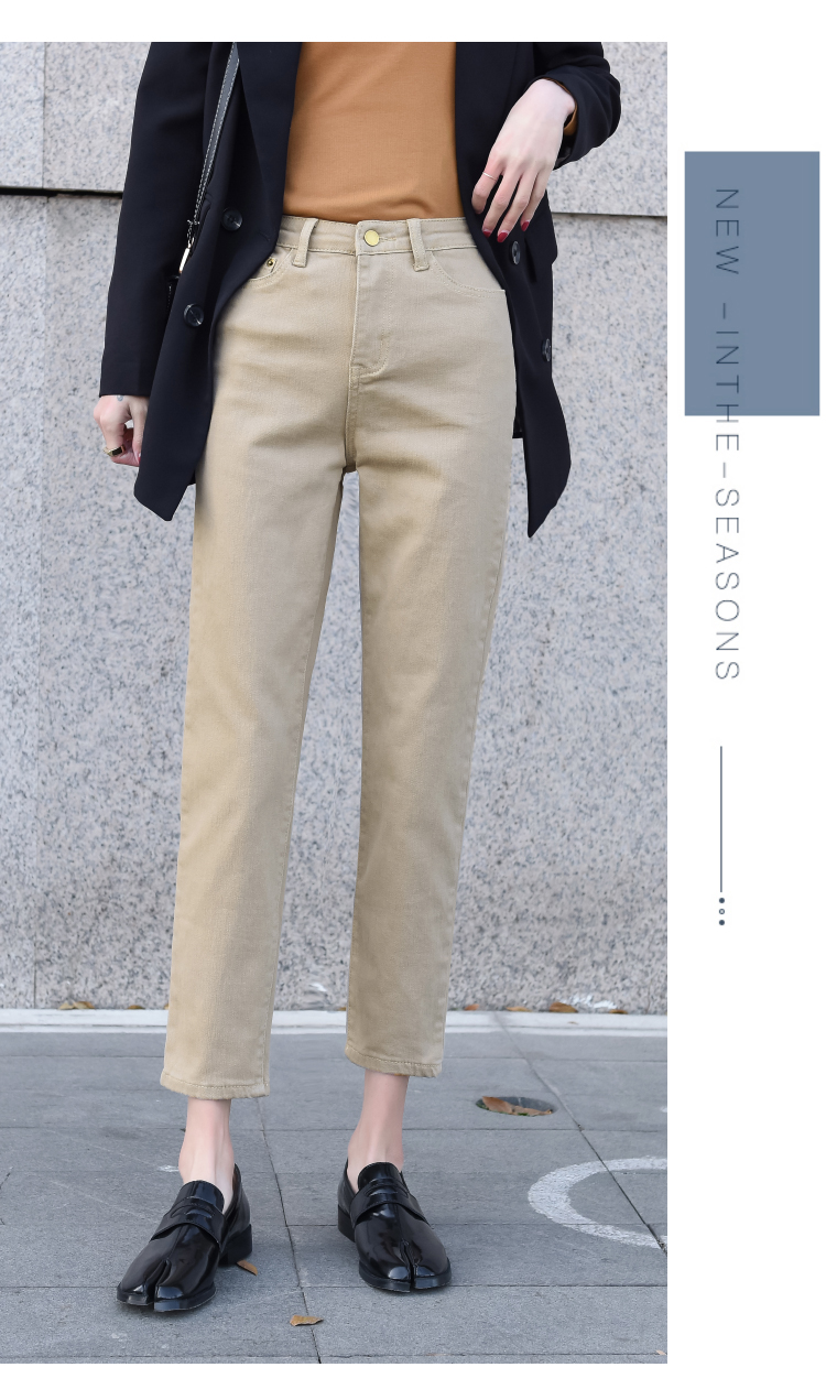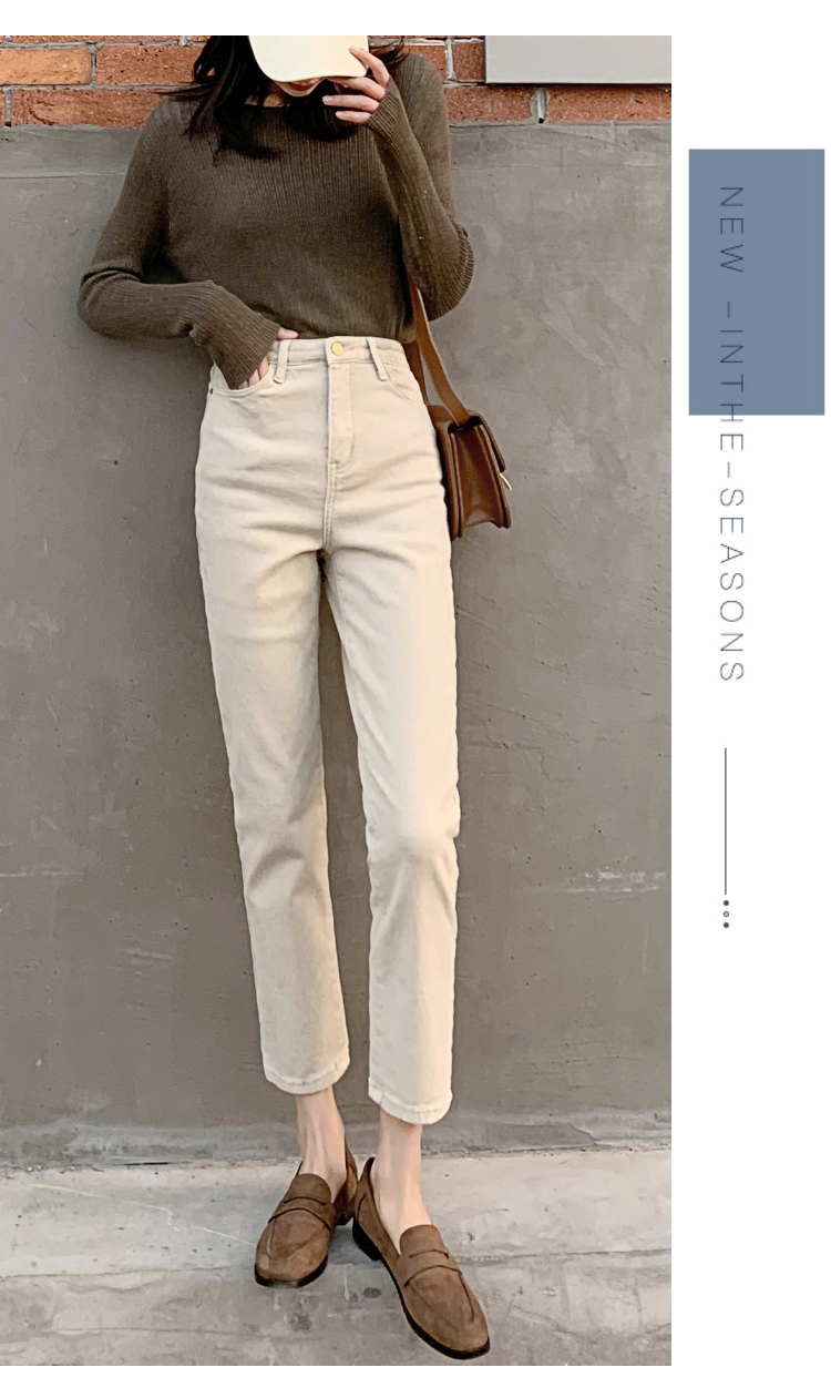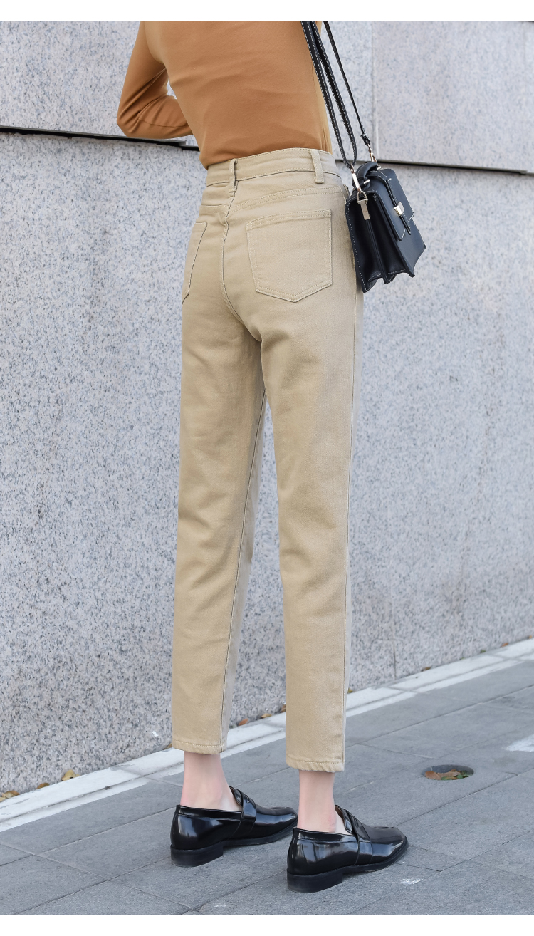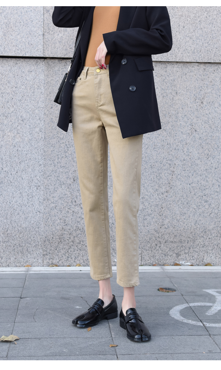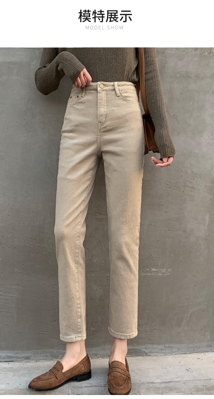 Women's Denim Cigarette Pants for Spring, Autumn, and Winter, Thin Fleece-Lined Khaki Pants, Petite Size, Cropped Narrow Fit, Fleece-Lined Baguette Straight-Leg Pants