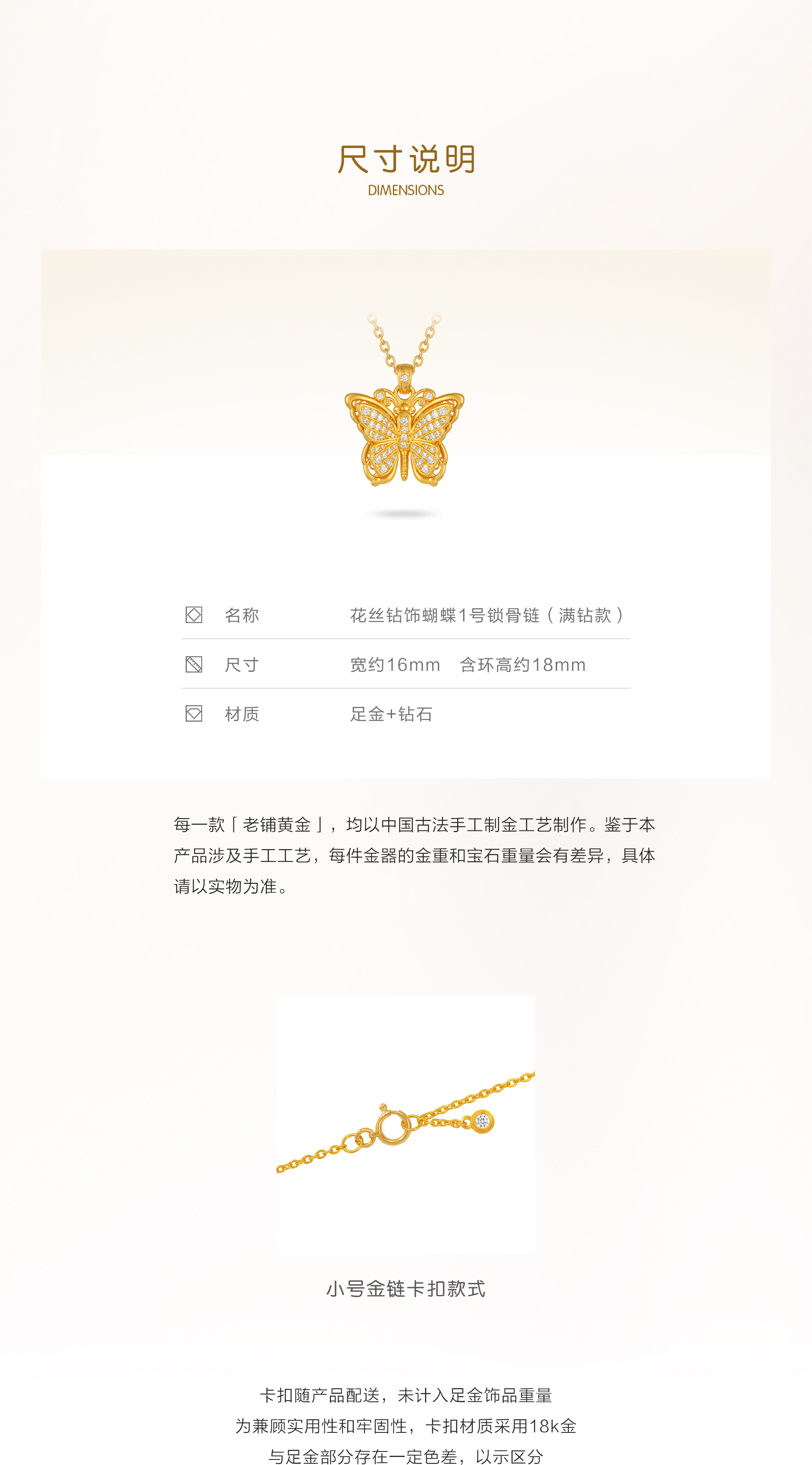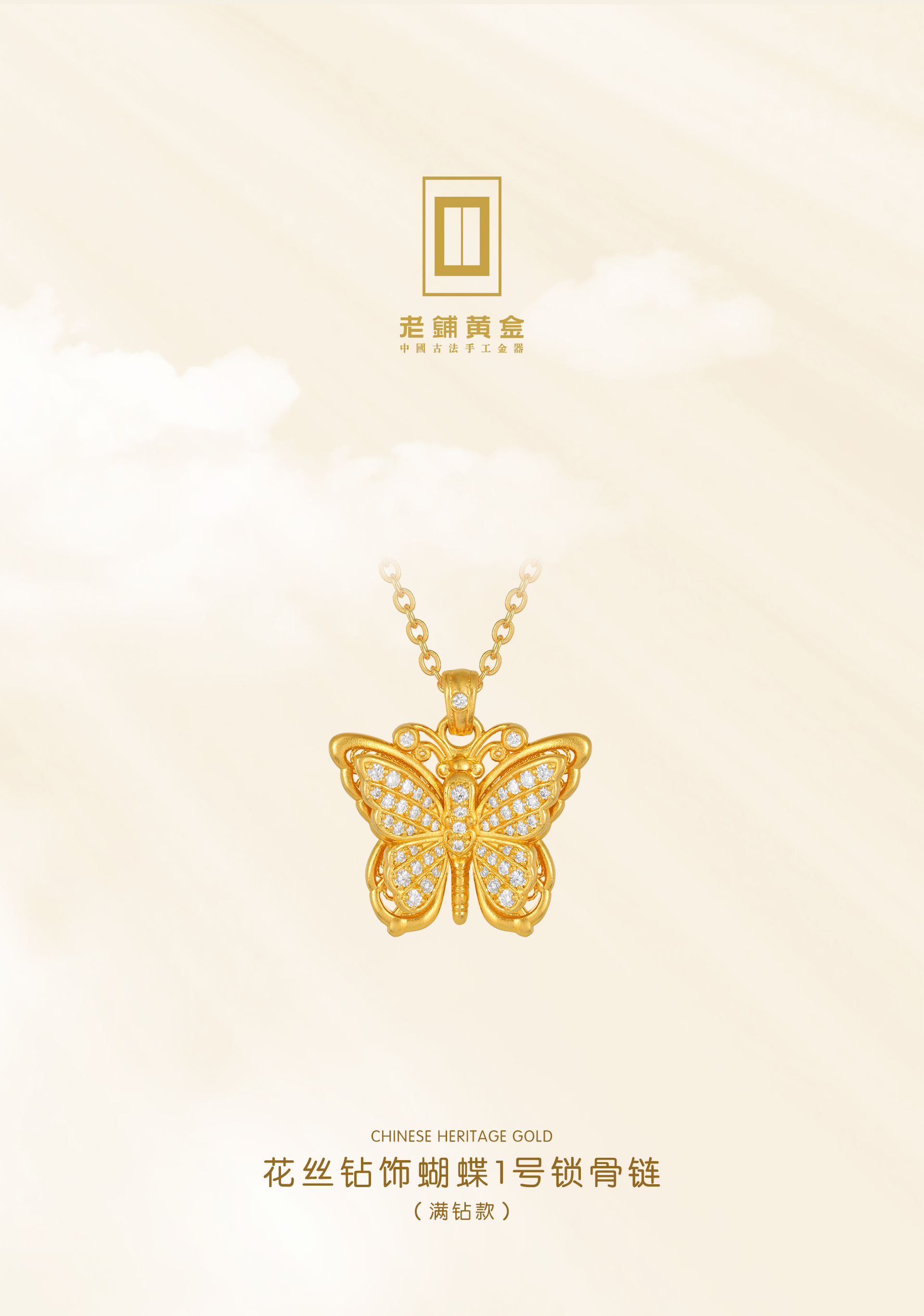 Old-Fashioned Gold Necklace Made by Traditional Methods, Pure Gold Necklace with Filigree Diamond Butterfly (No. 1) Collarbone Chain (Full Diamond Version)