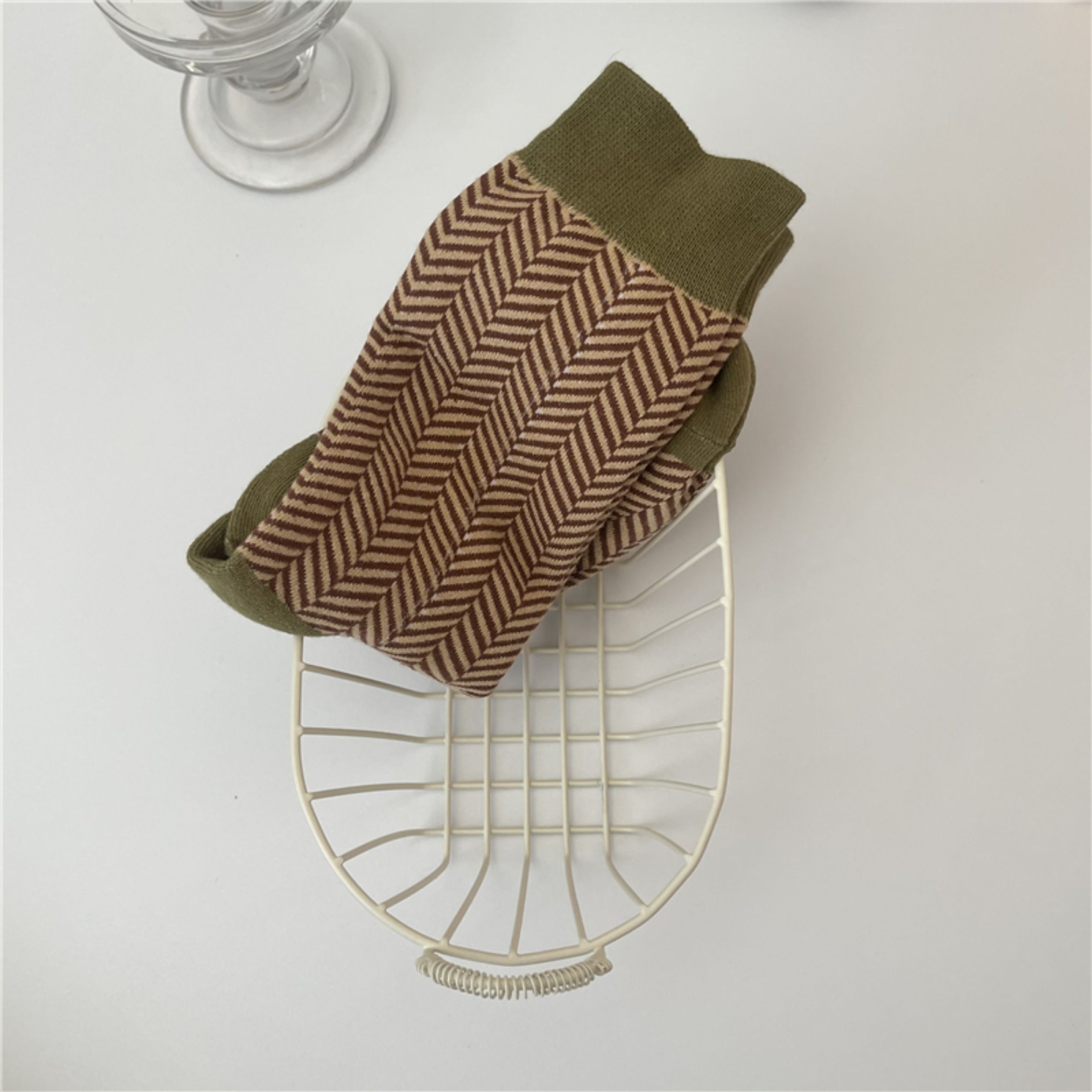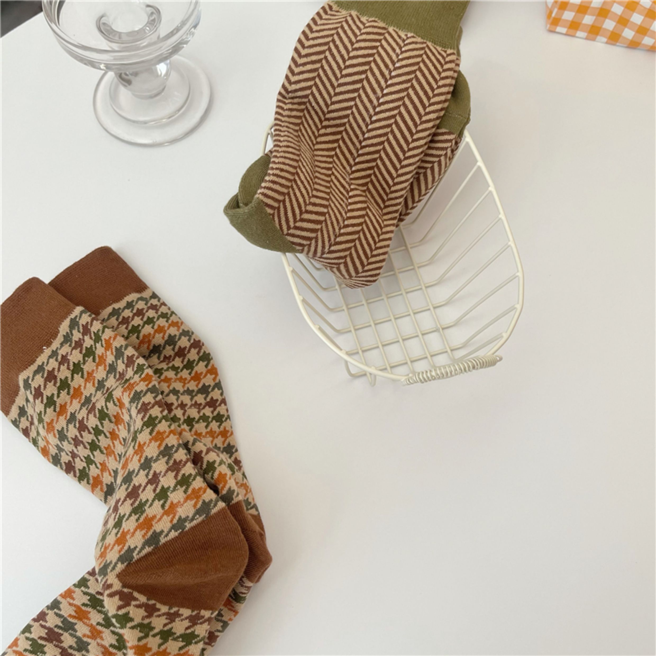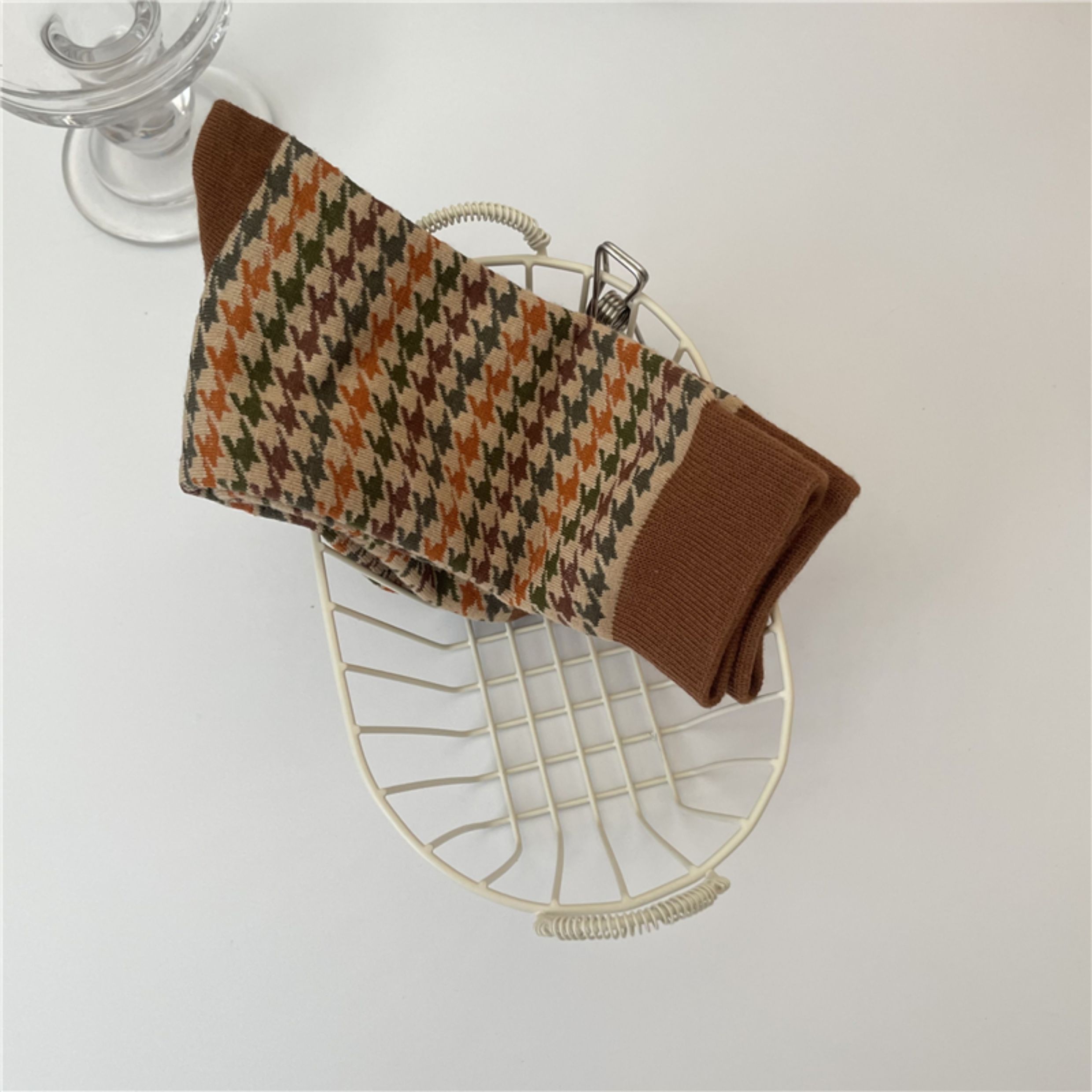 New Autumn and Winter Women's Houndstooth Series Floral Cotton Socks, Retro Niche Versatile Mid-Calf Japanese-Style Cotton Socks