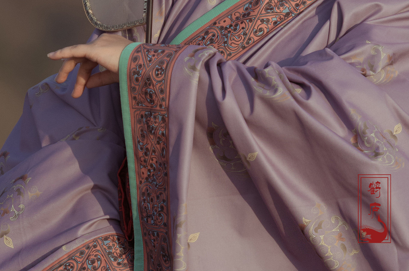 +淡粉橙底淡蓝色鸟纹带钩纹样衣袖缘+石绿色包边