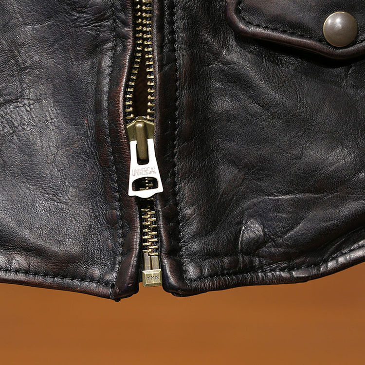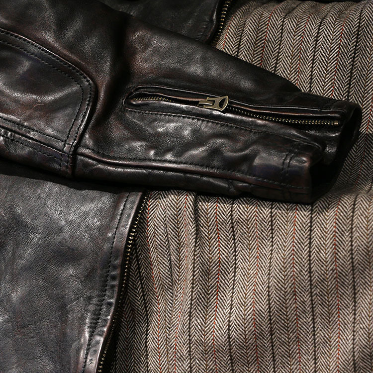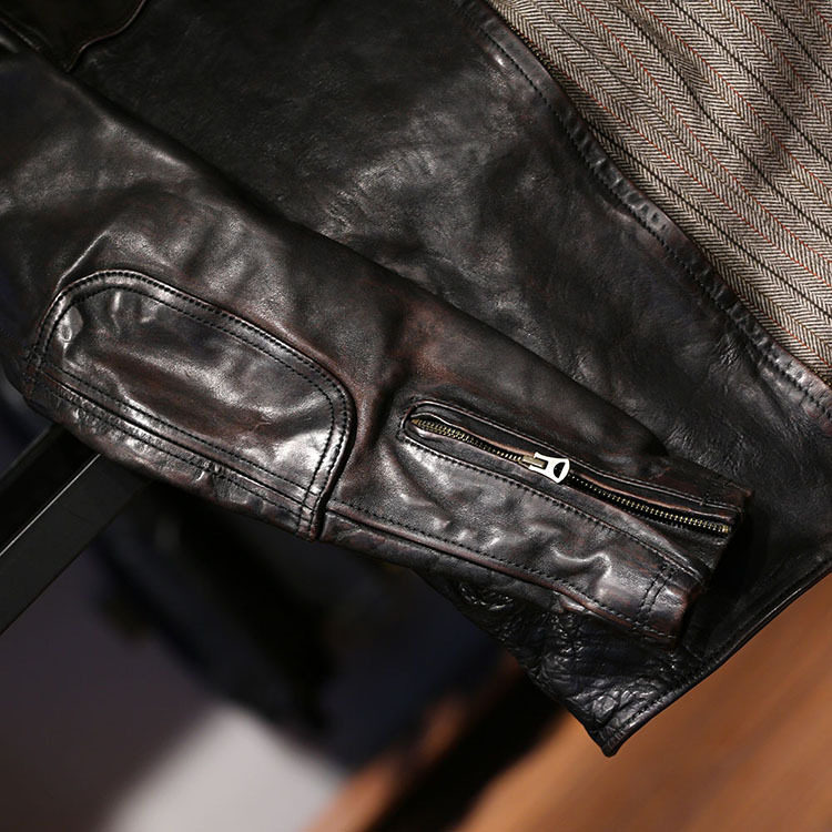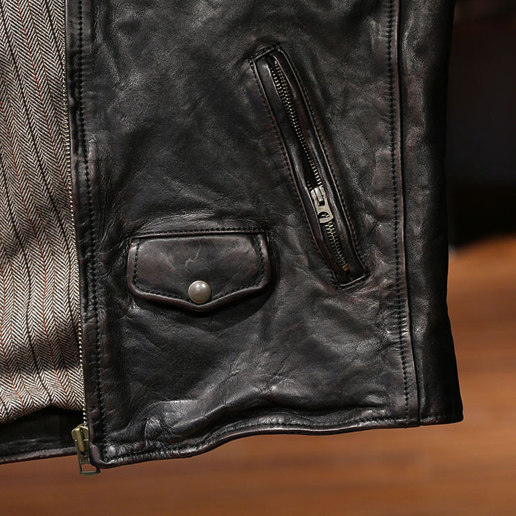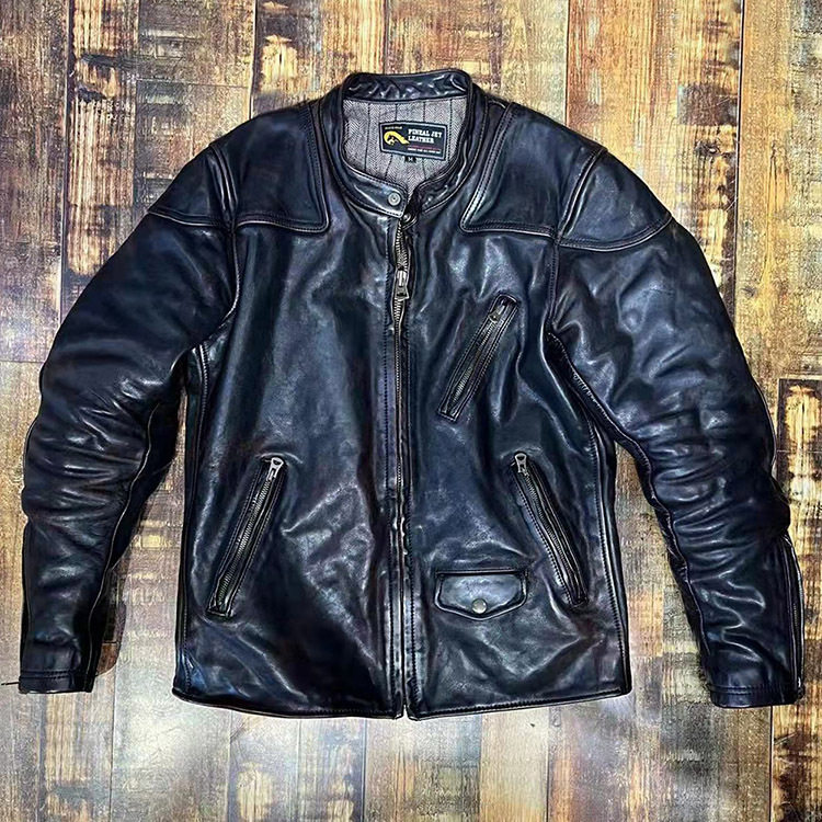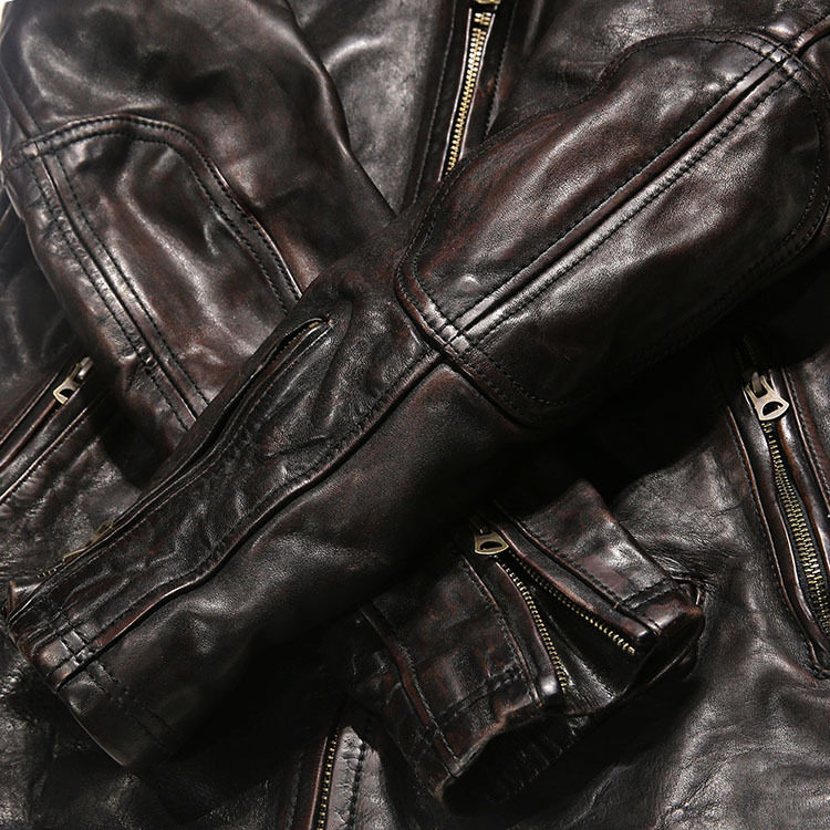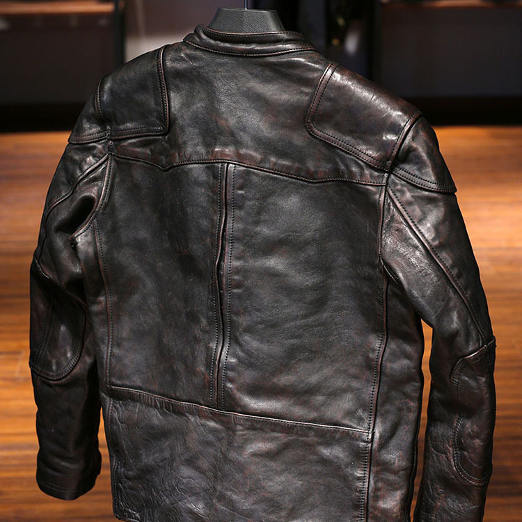 Ame-Kaji Vintage Distressed Horsehide Leather Jacket for Men, Stand Collar Slim Fit Biker Jacket, Casual Genuine Leather Coat