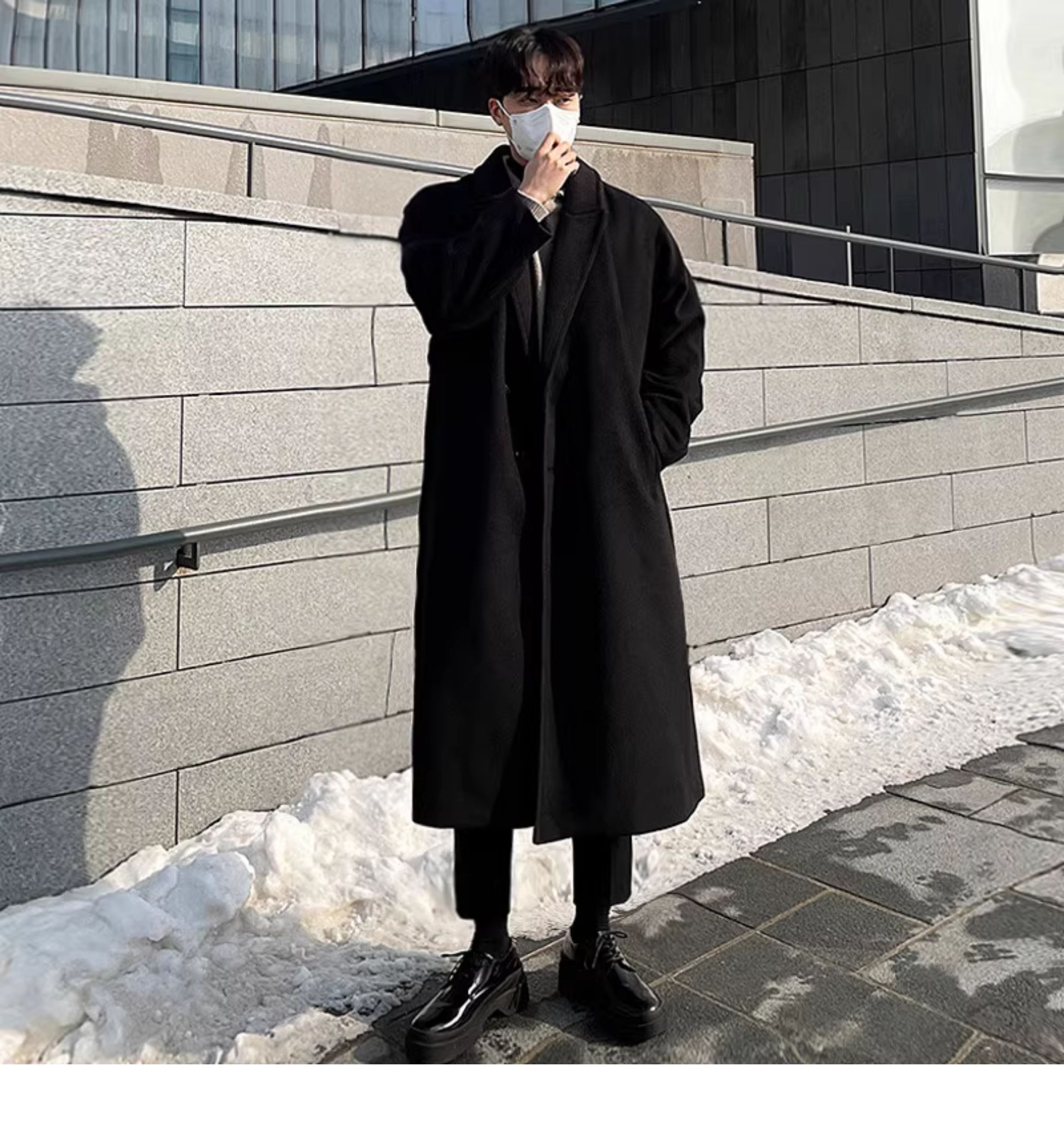 Men's Woolen Coat, Mid-Length, Over-The-Knee, Black, Autumn and Winter, Fleece-Lined, Thickened Woolen Jacket, ins Trendy Korean Style Trench Coat