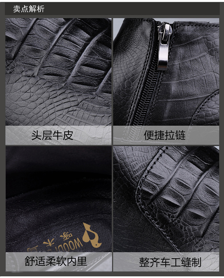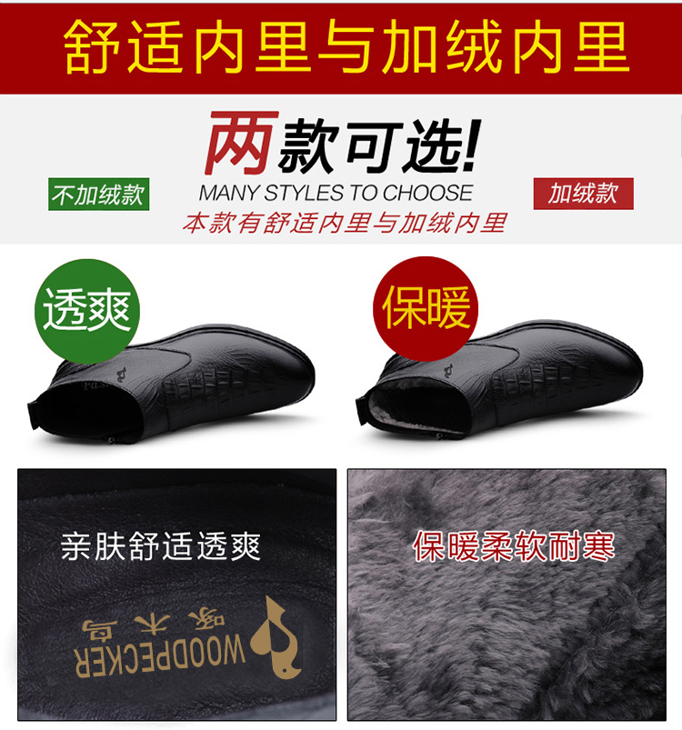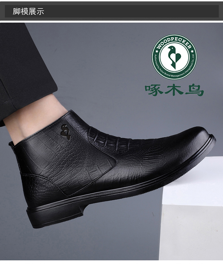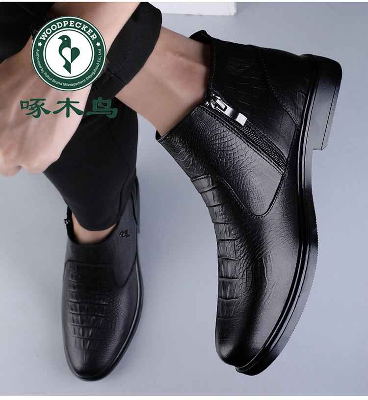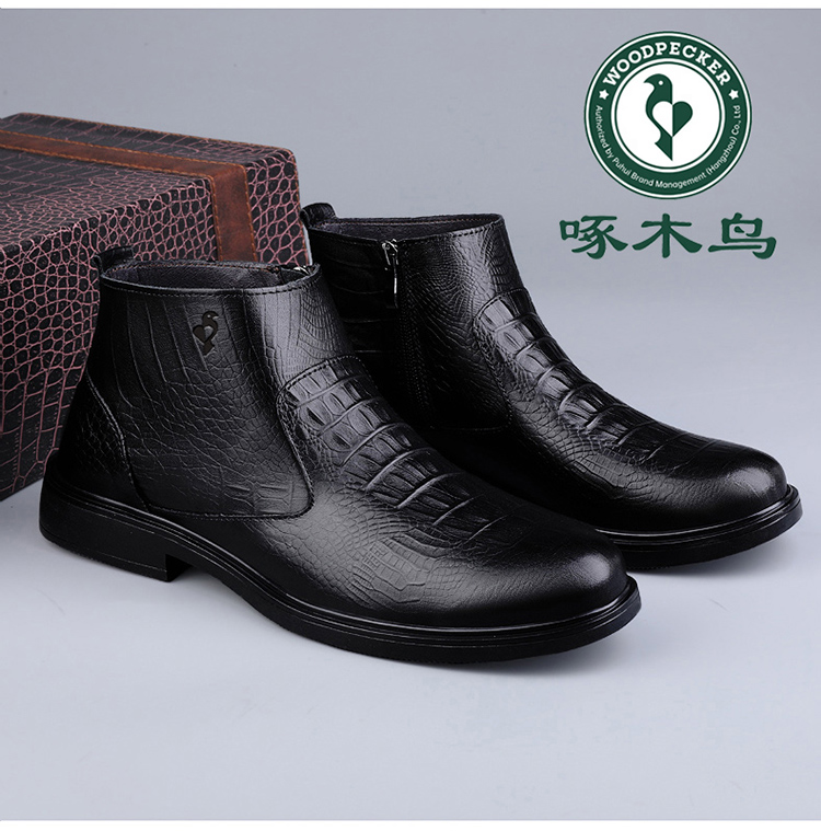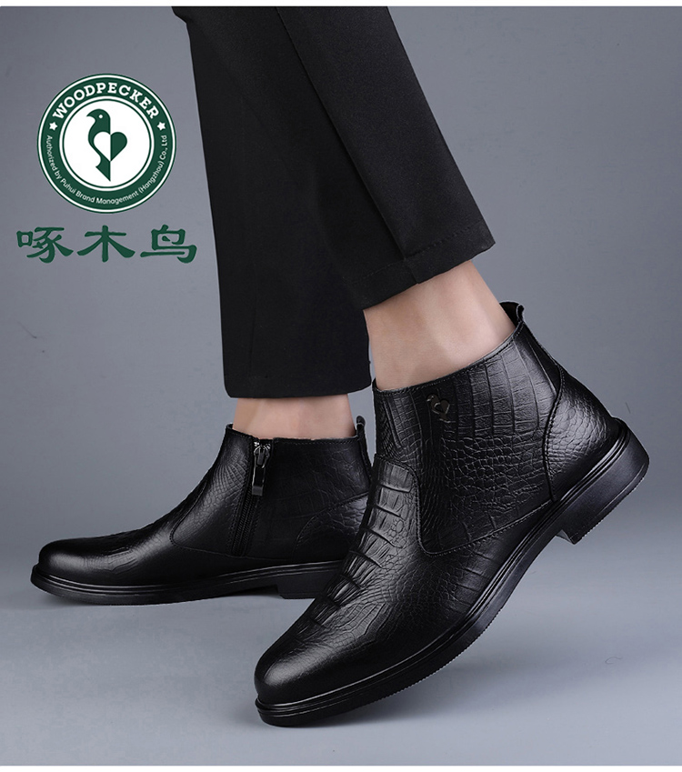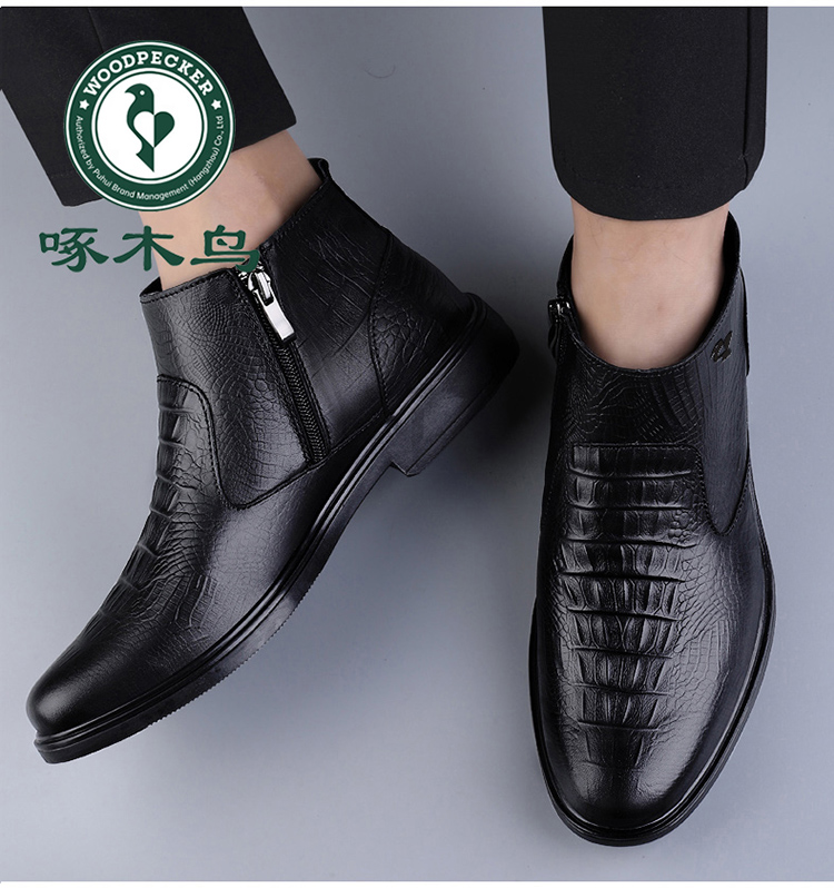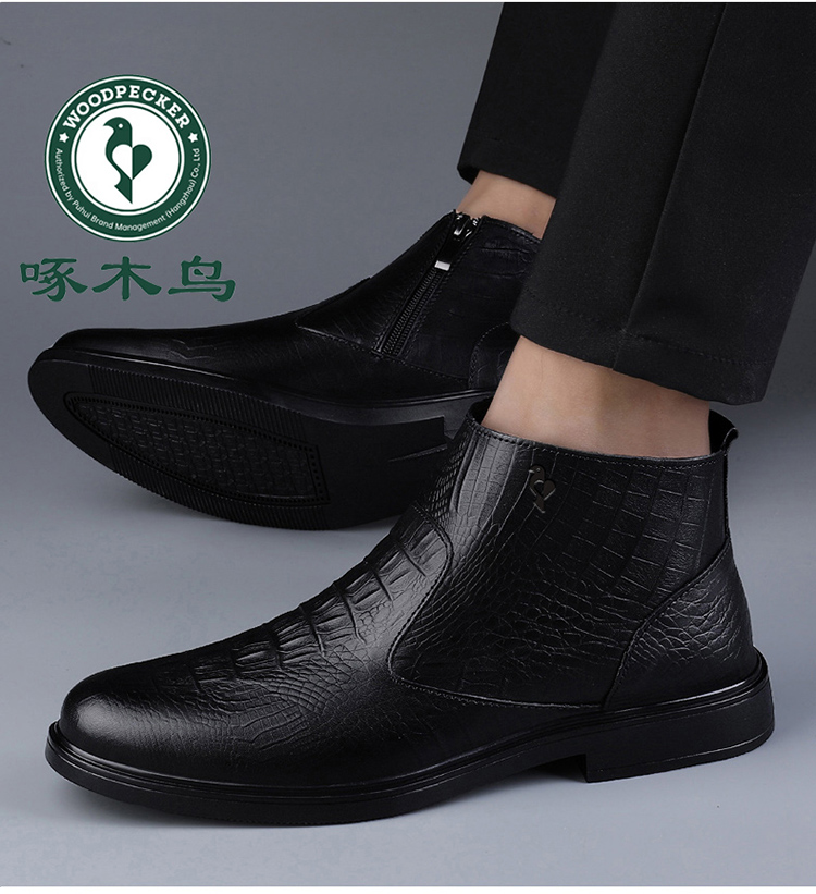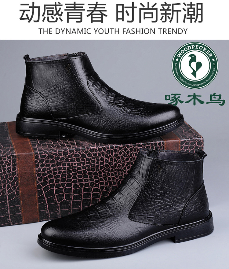 Woodpecker Genuine Leather High-Top Men's Shoes Plus Velvet Cotton Shoes Crocodile Pattern Leather Shoes Winter New Black Chelsea Short Boots