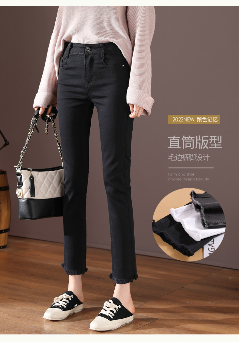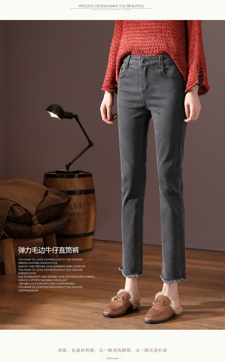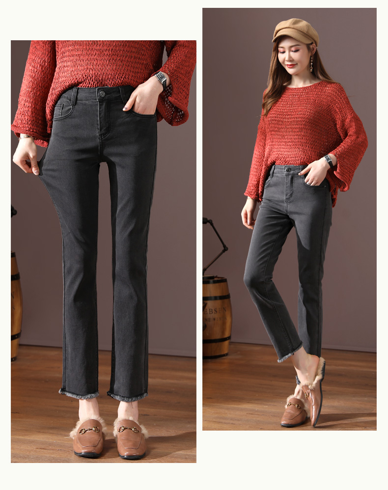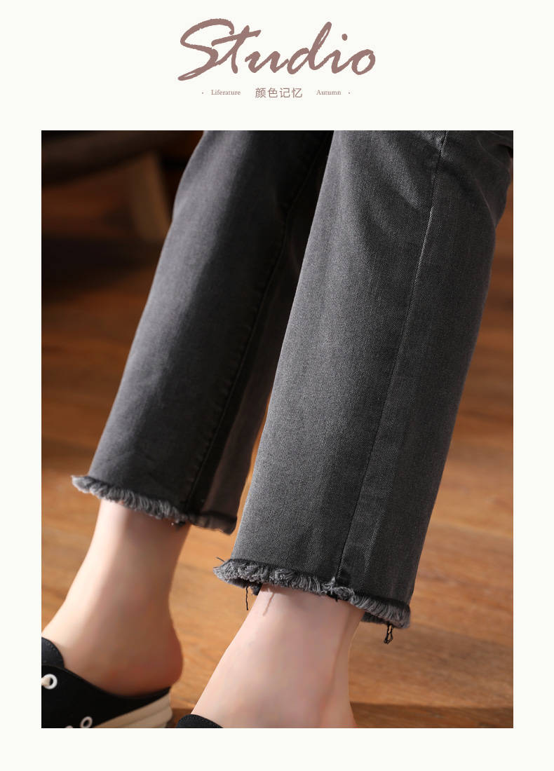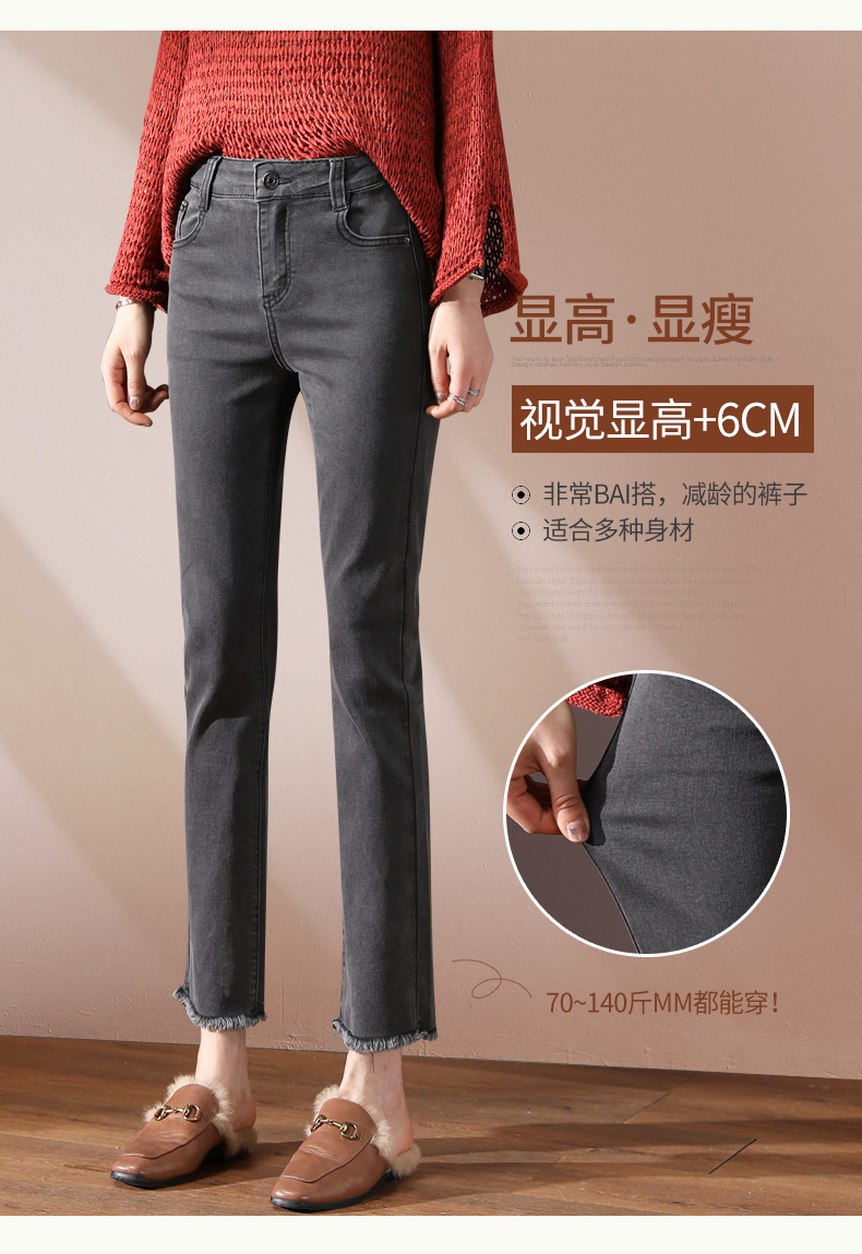Smoky Gray Straight-Leg Jeans for Women, Autumn and Winter, Fleece-Lined, Cropped, Petite, High-Waisted, Vintage, Frayed Hem, Nine-Tenths Length Cigarette Pants
