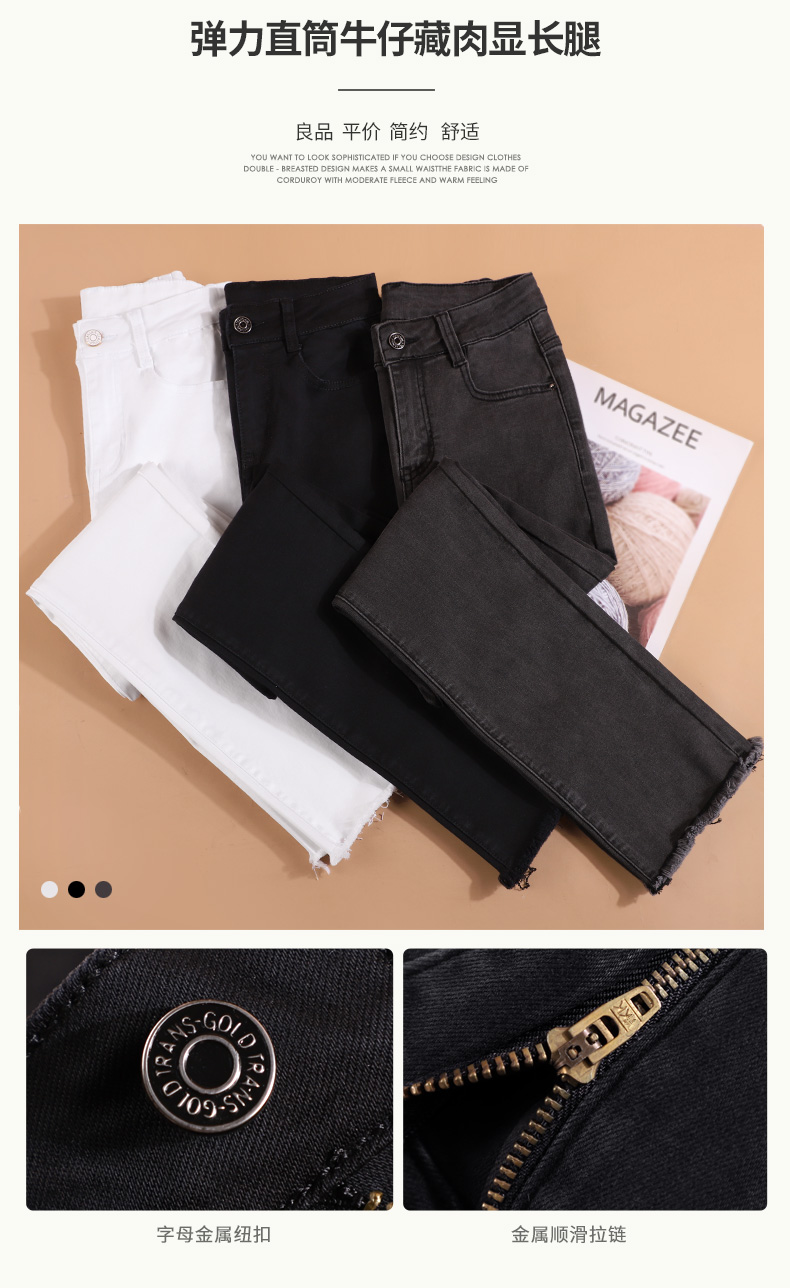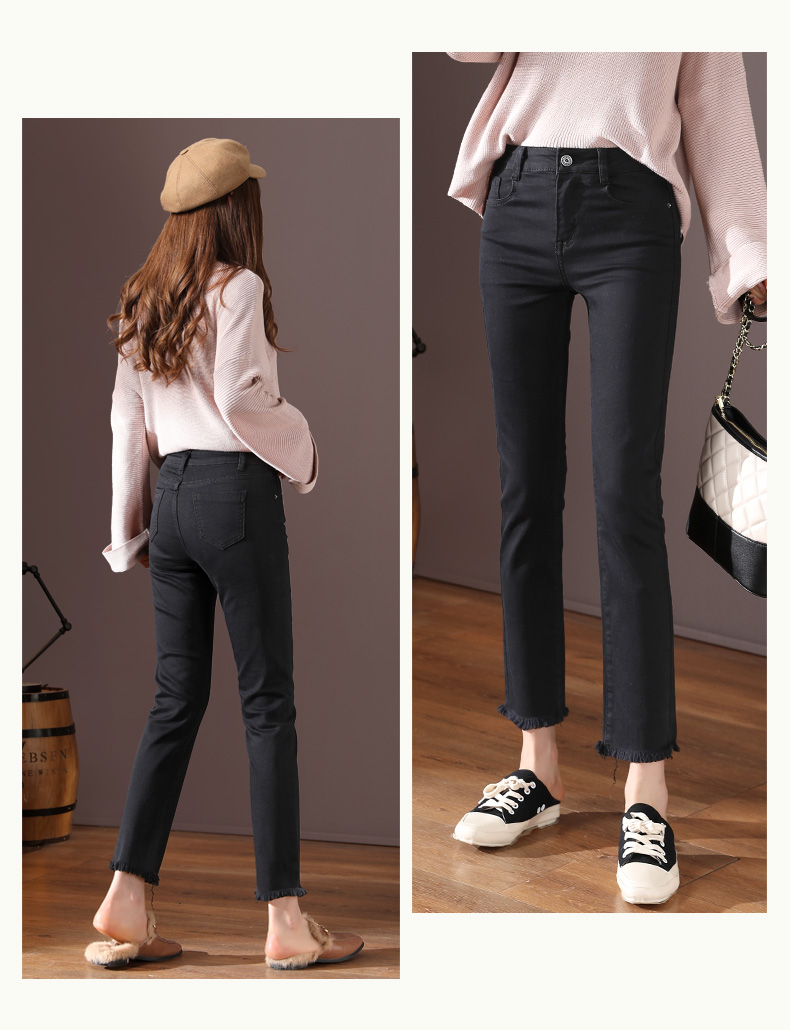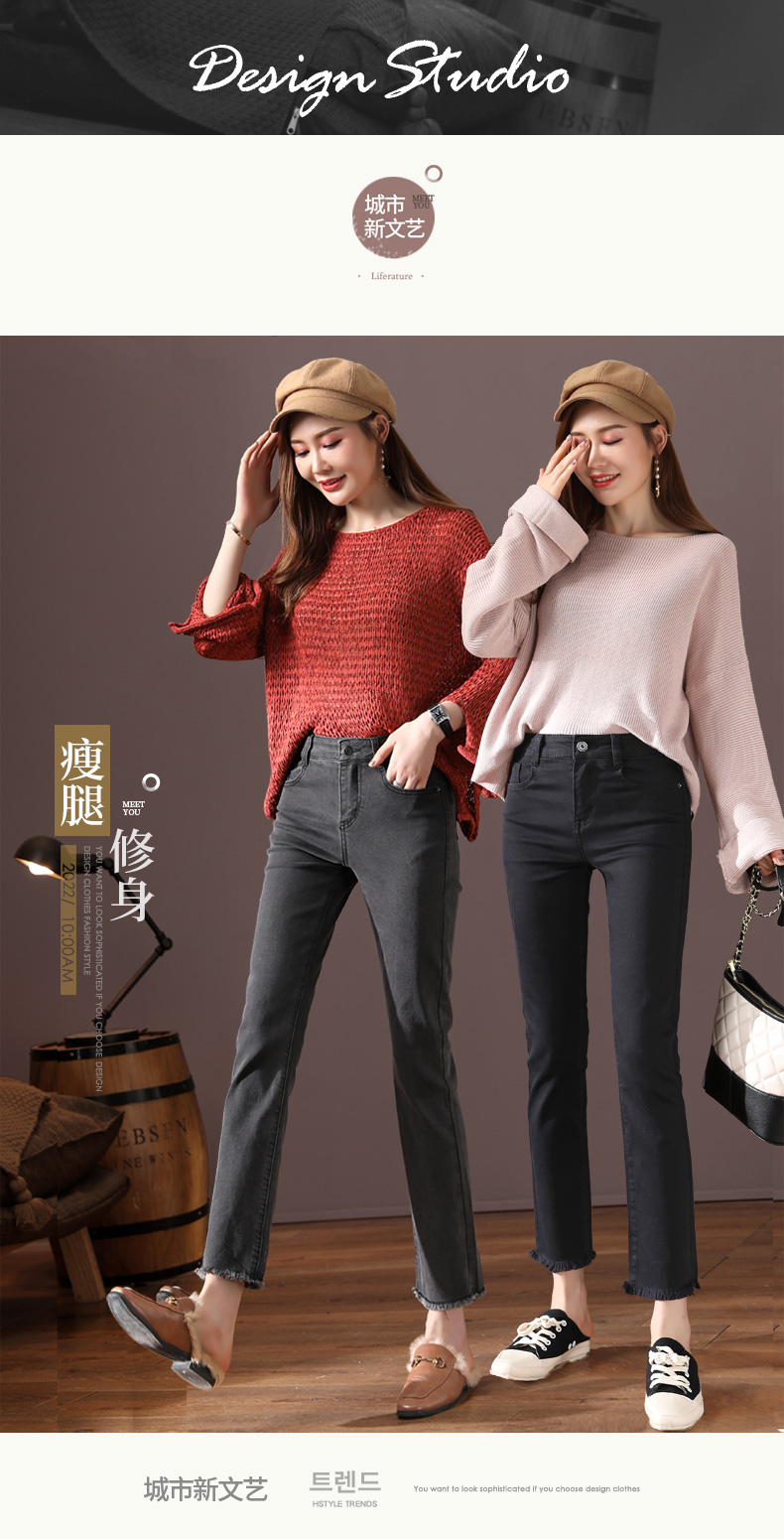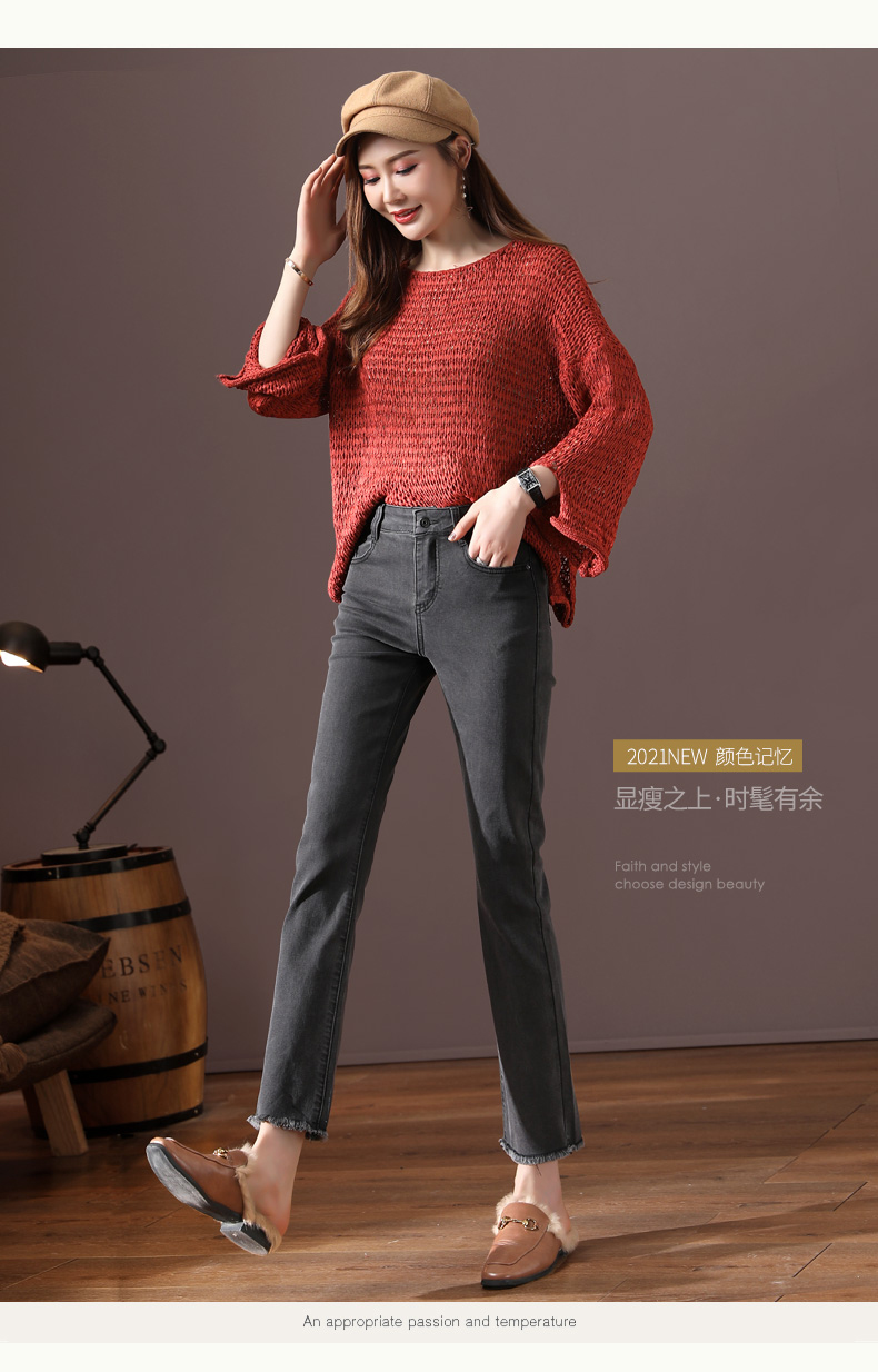 Smoky Gray Straight-Leg Jeans for Women, Autumn and Winter, Fleece-Lined, Cropped, Petite, High-Waisted, Vintage, Frayed Hem, Nine-Tenths Length Cigarette Pants