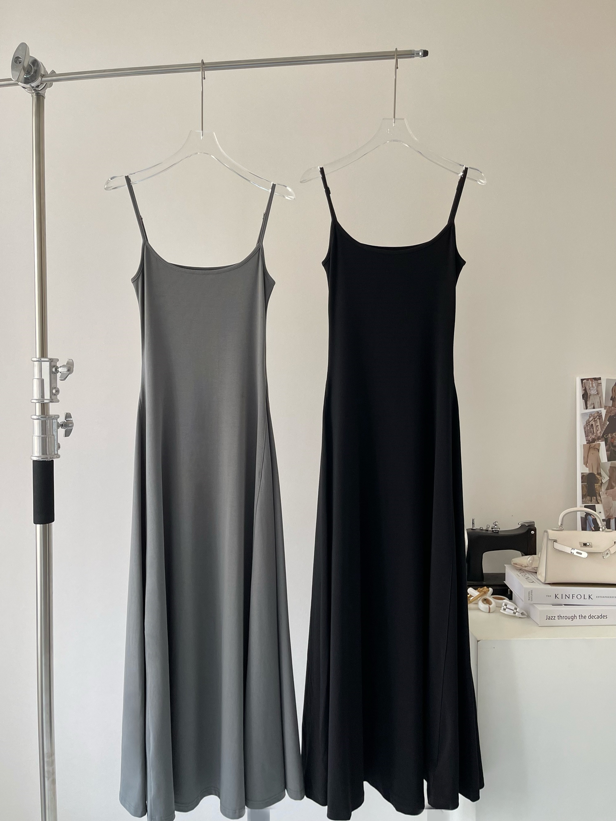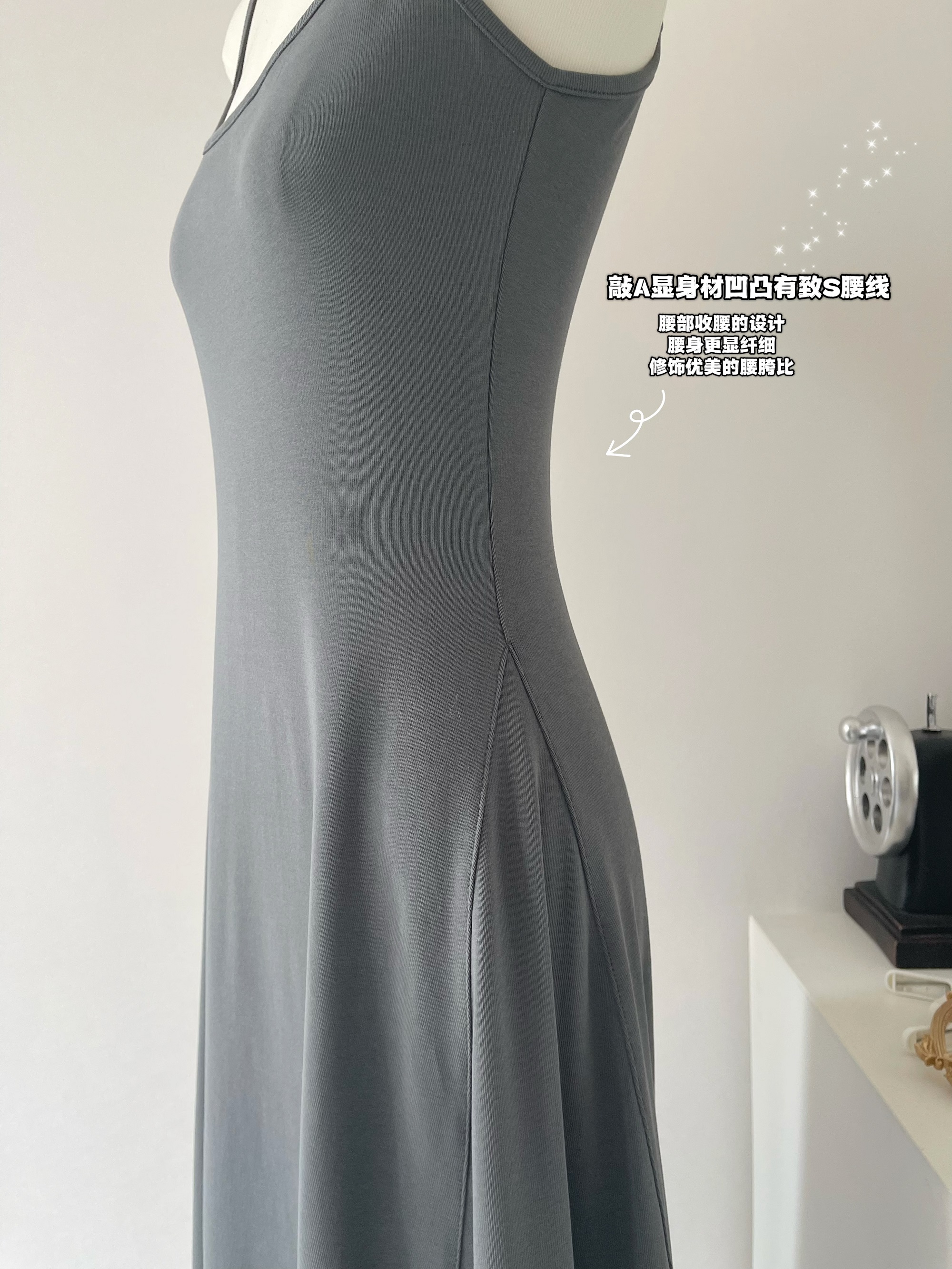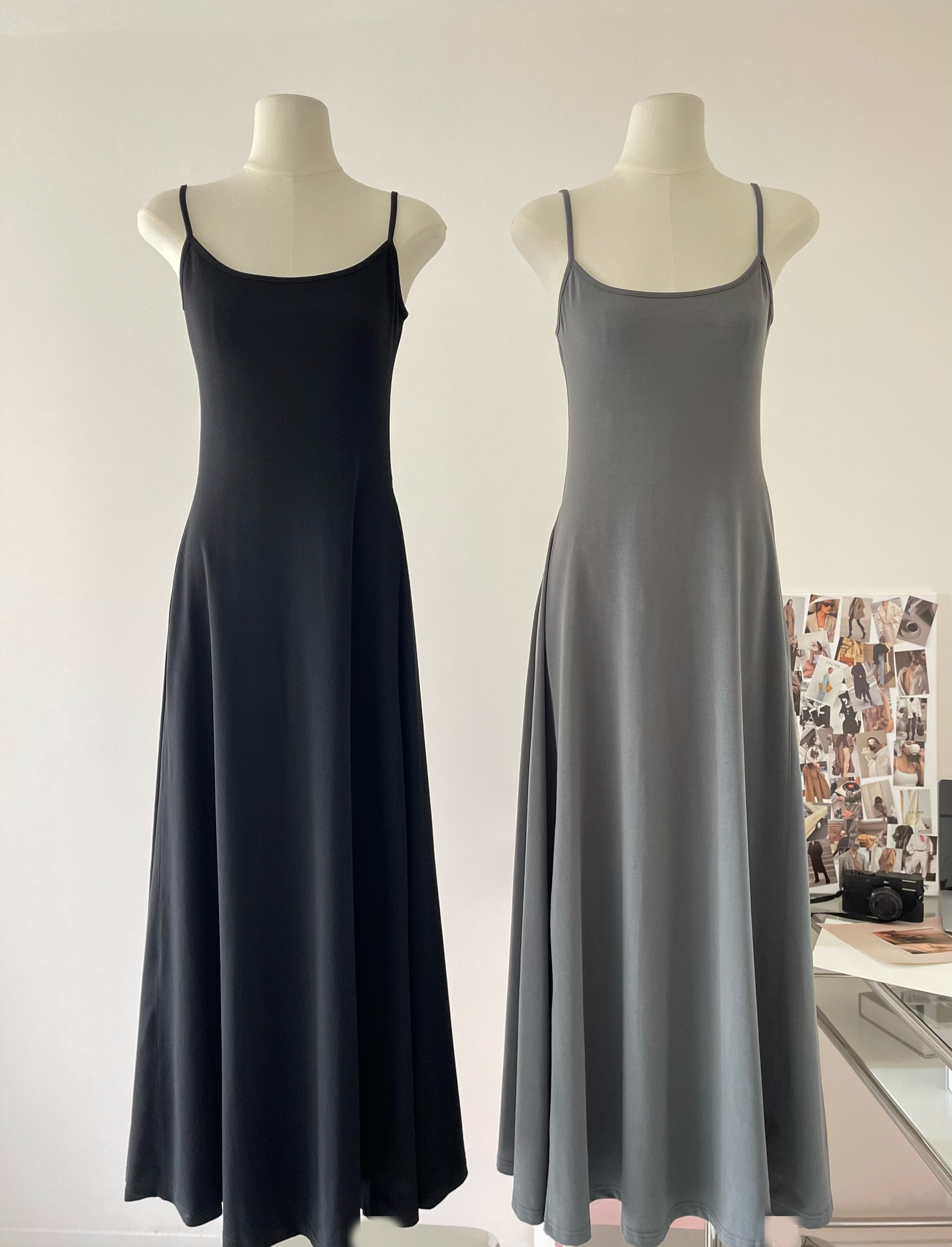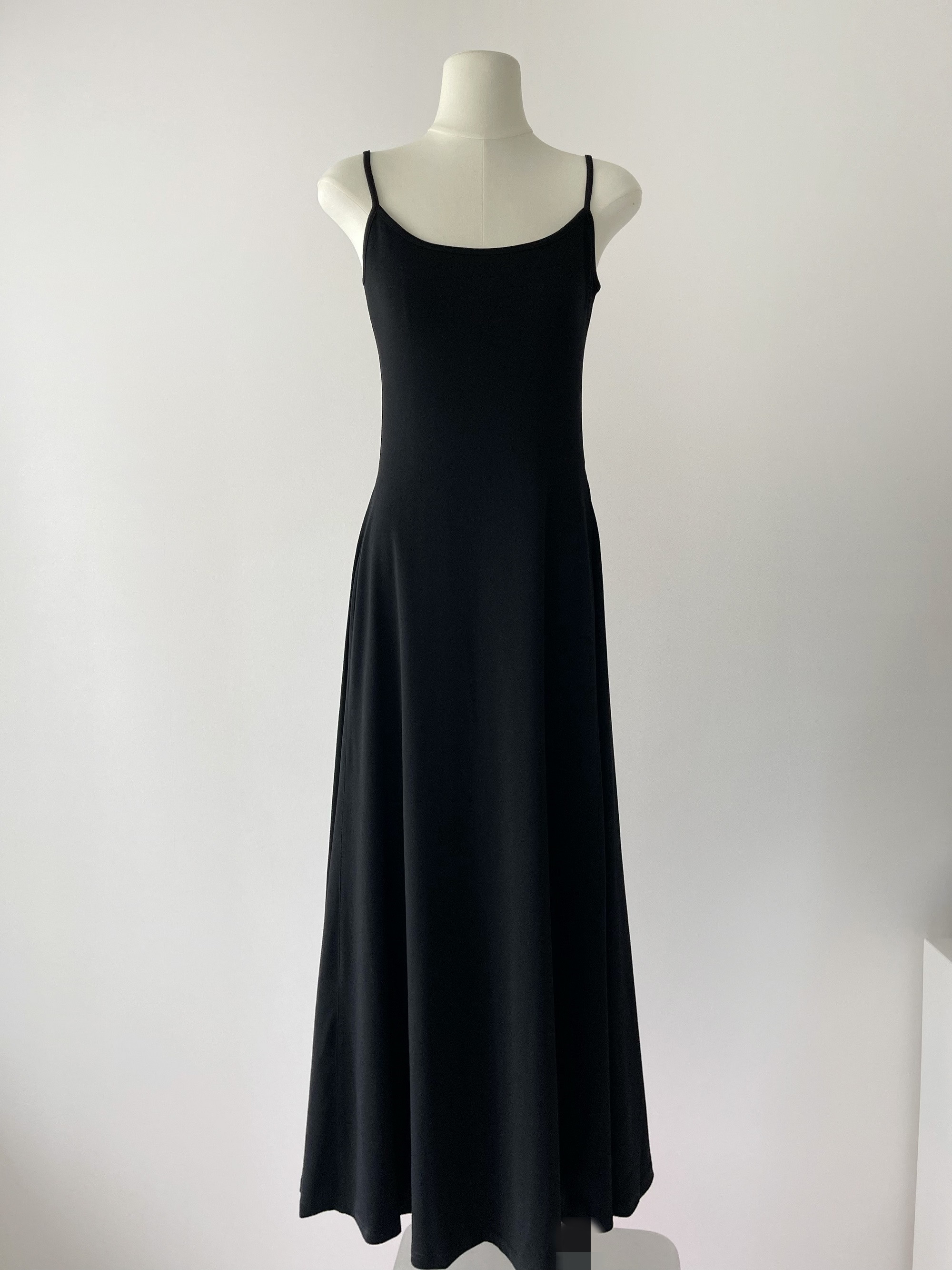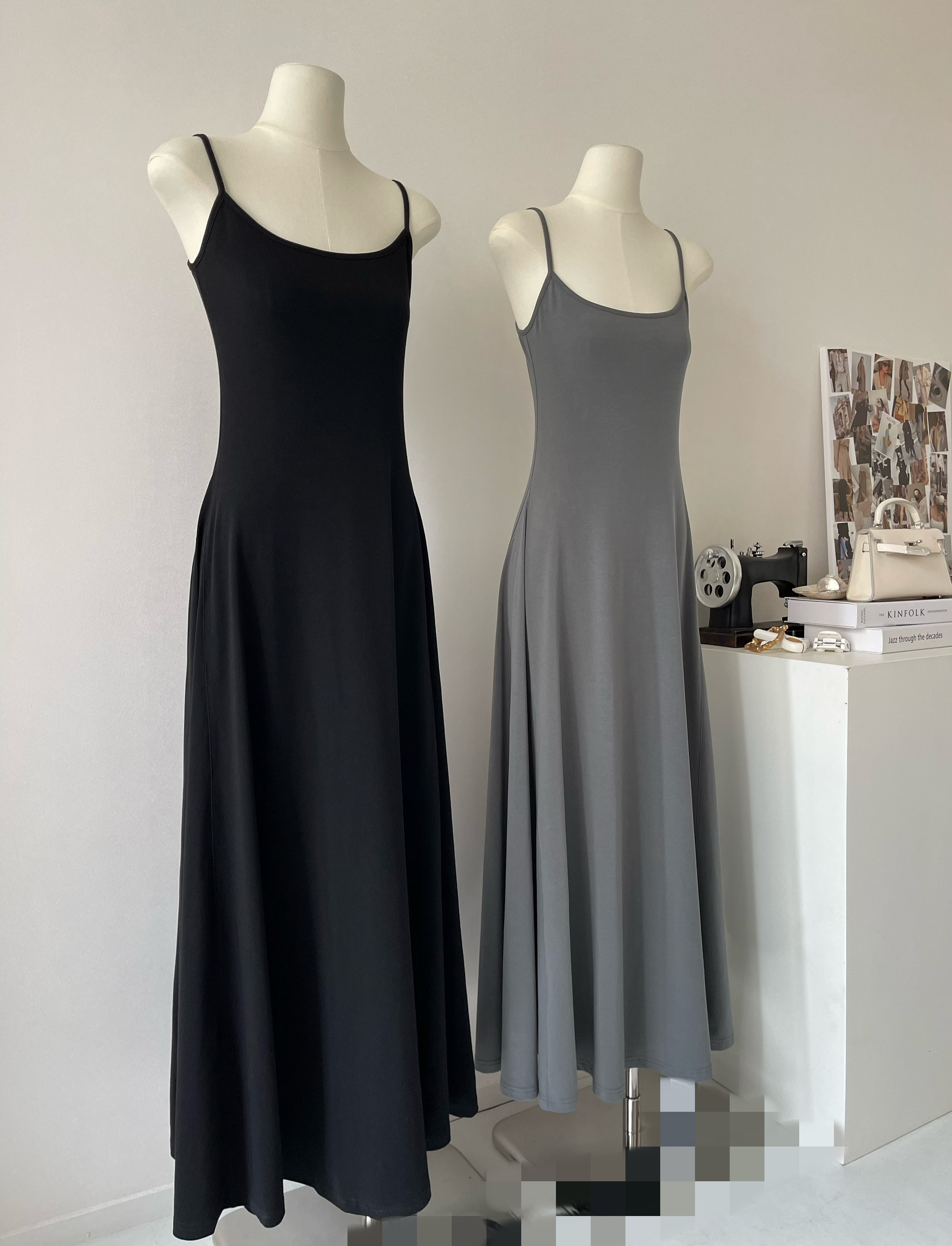 Peach LAOSHU Dance Student Black and Gray Simple Waist-Cinching Slimming U-Neck Elegant Long Spaghetti Strap Dress for Women