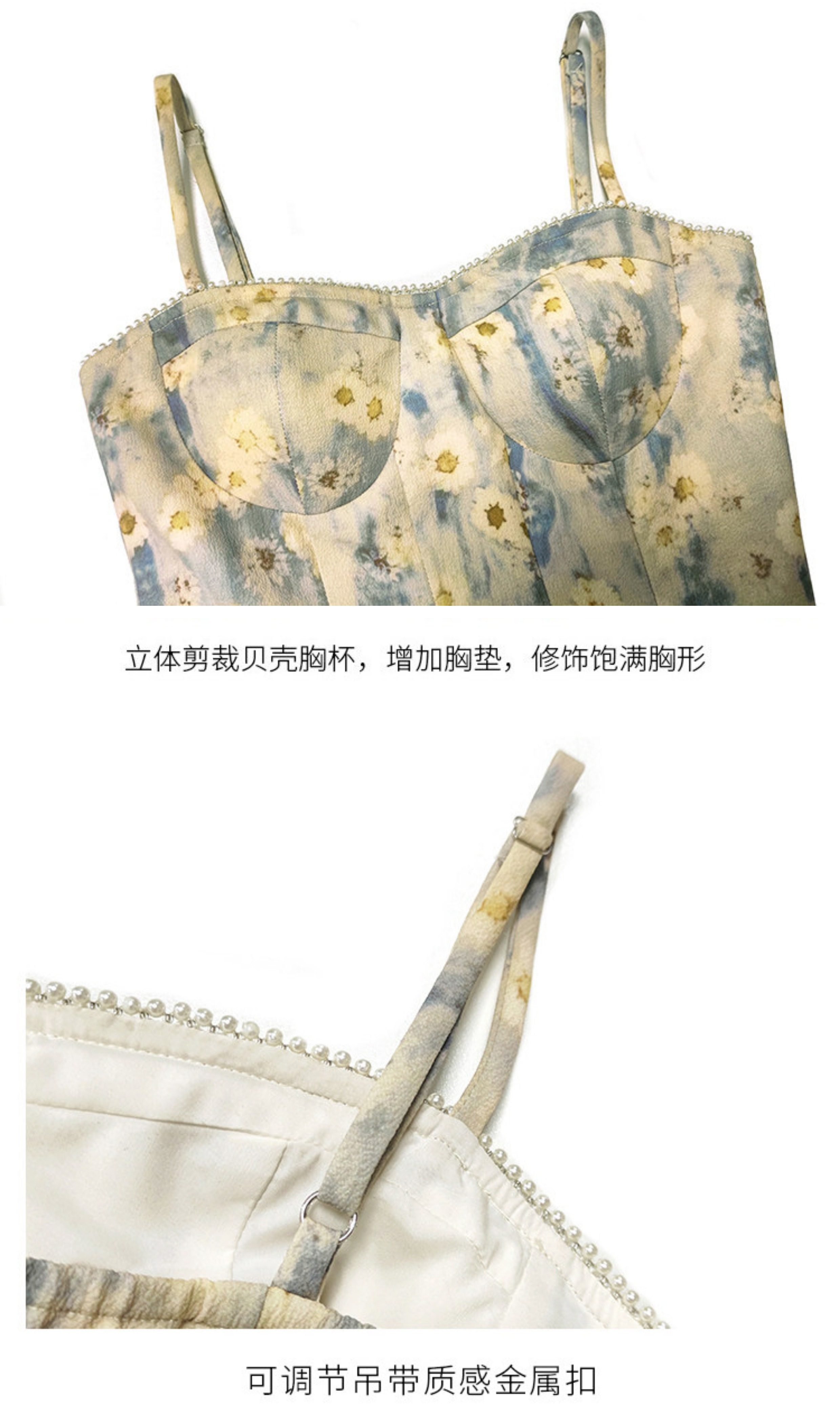 Deng Liuli's French-Style Blue Oil Painting Long Dress, Seaside Vacation Beach Dress, Floral Spaghetti Strap Dress for Women, Summer High-End Feel
