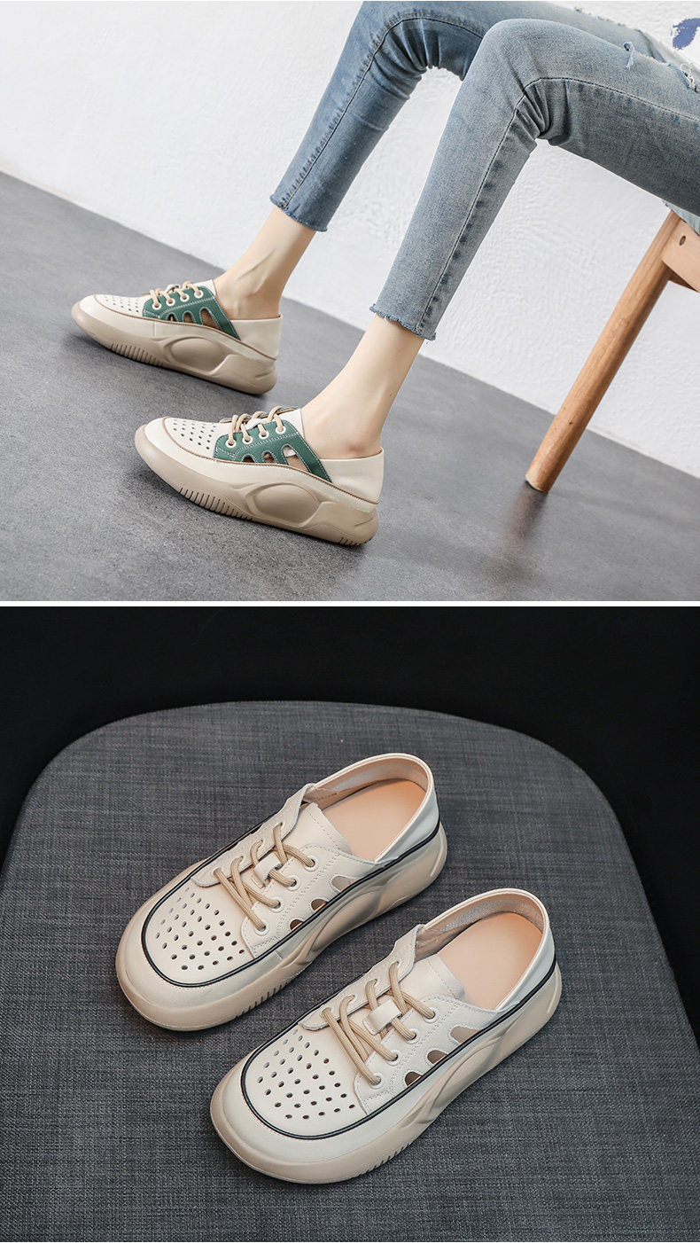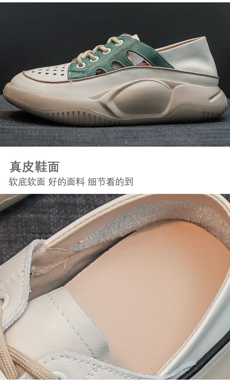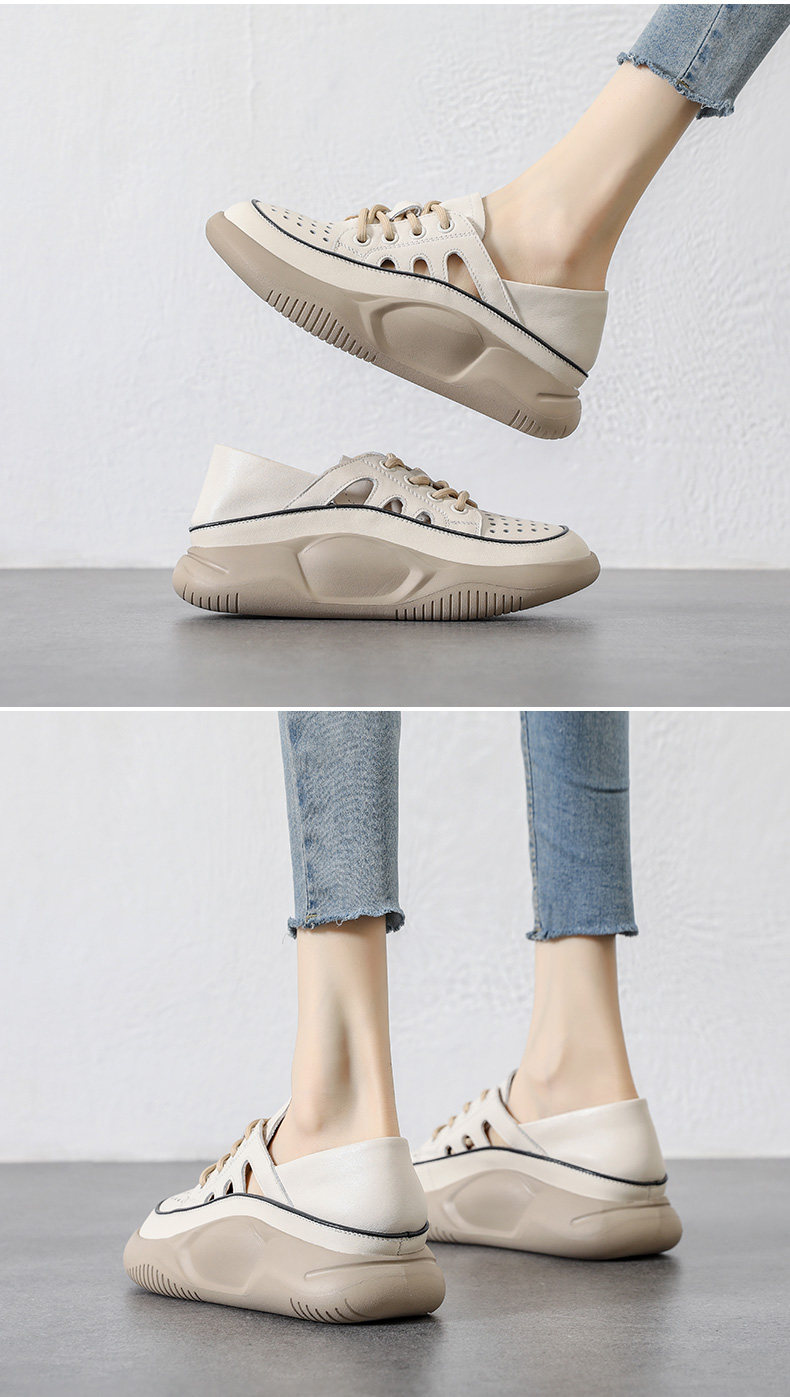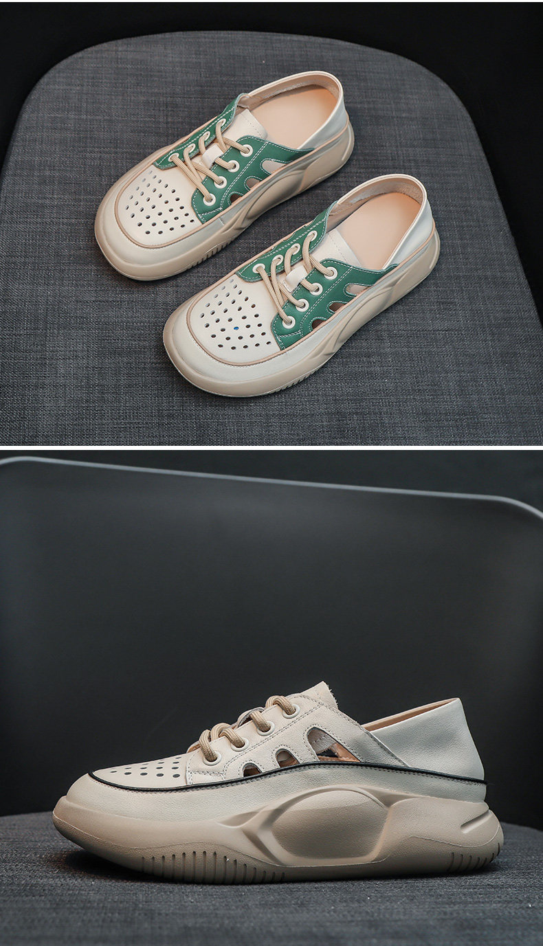Genuine Leather Sports Sandals for Women, Thick-Soled, Hollow, Breathable White Shoes, 2026 Summer New Style, Closed-Toe, Perforated Casual Sneakers