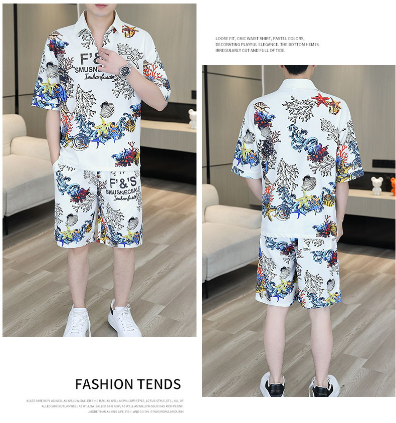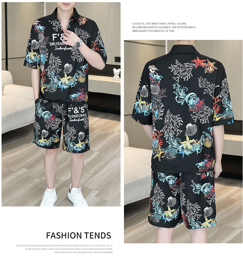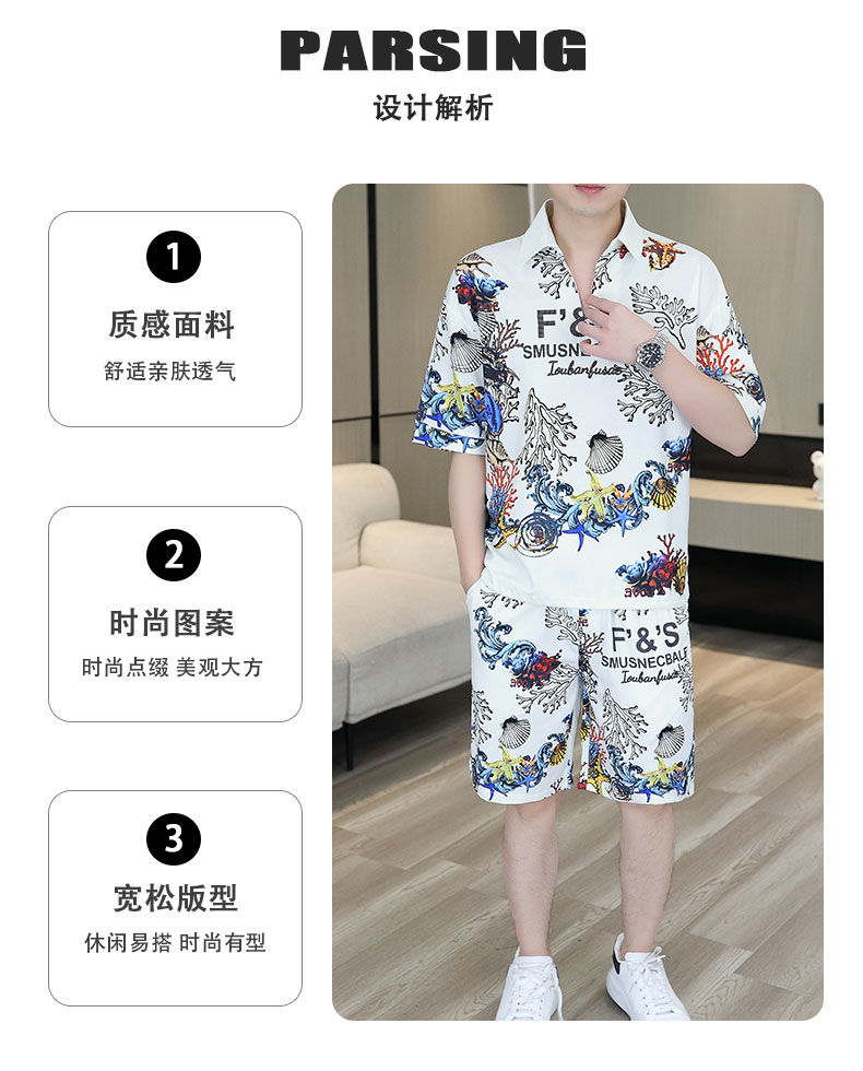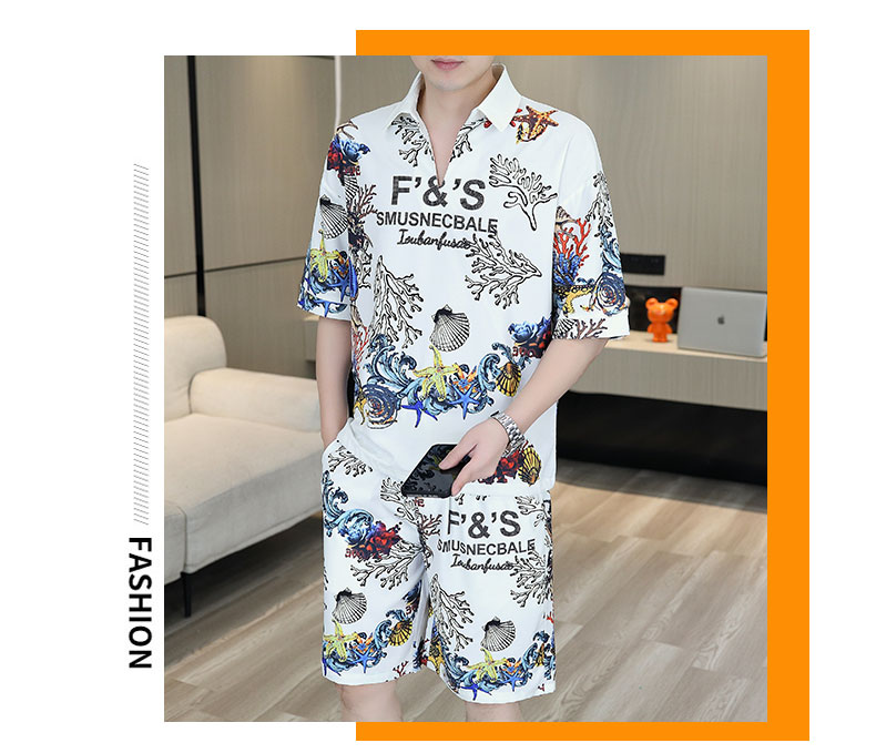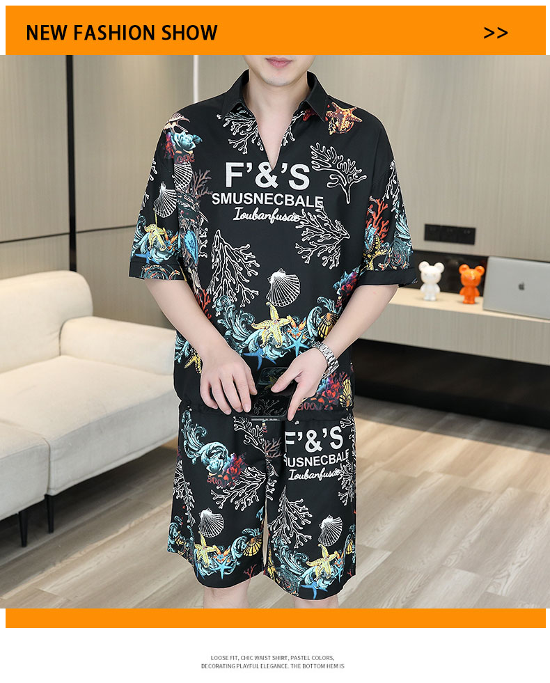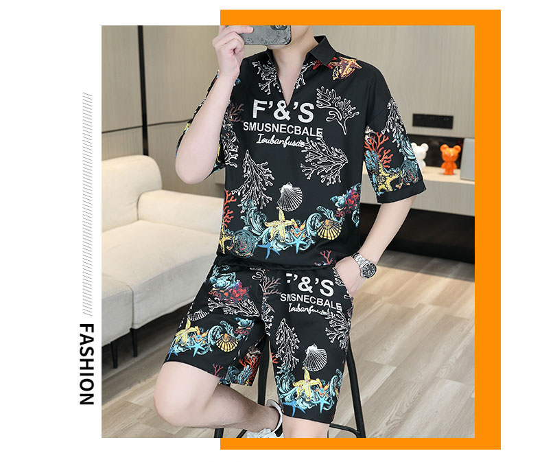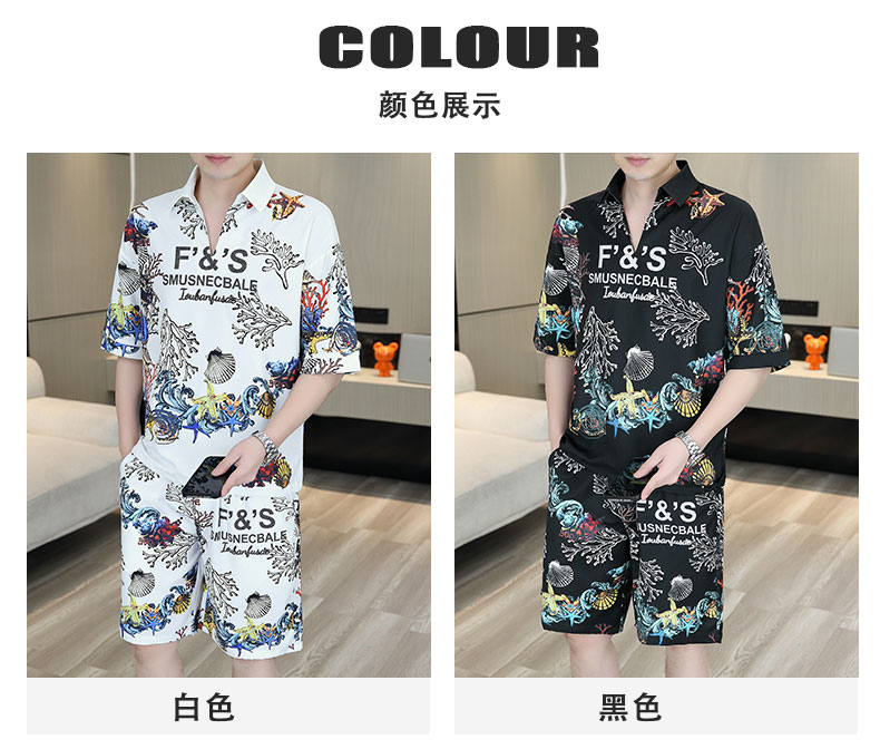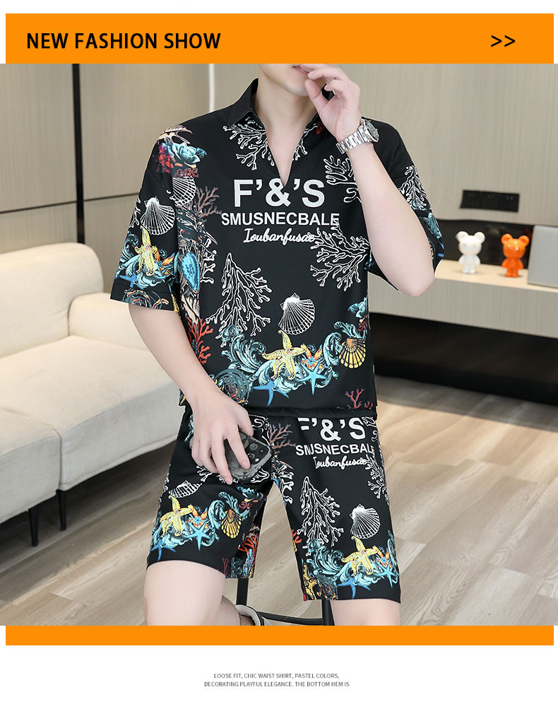 Men's V-Neck Casual Suit Trendy Brand Ice-Feel Thin Short-Sleeve T-Shirt and Shorts Set Cool Shirt Collar Two-Piece Set for Summer