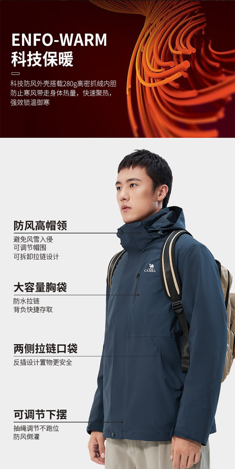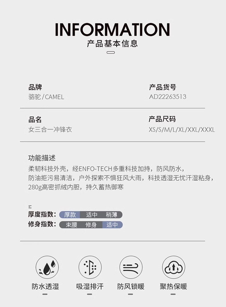 3514系列含有AD12263514X/AD12263514D/AD22263513X/AD22263513A5/AD22263513B5是情侣款三合一抓绒内胆;AD12263514A/AD12263514B,AD22263513A/AD12263514Y/AD22263513Y是情侣款三合一羽绒内胆,皆为同款同品质,因批次不同,可能出现轻微色差,仓库随机发货,骆驼粉丝们介意慎拍!