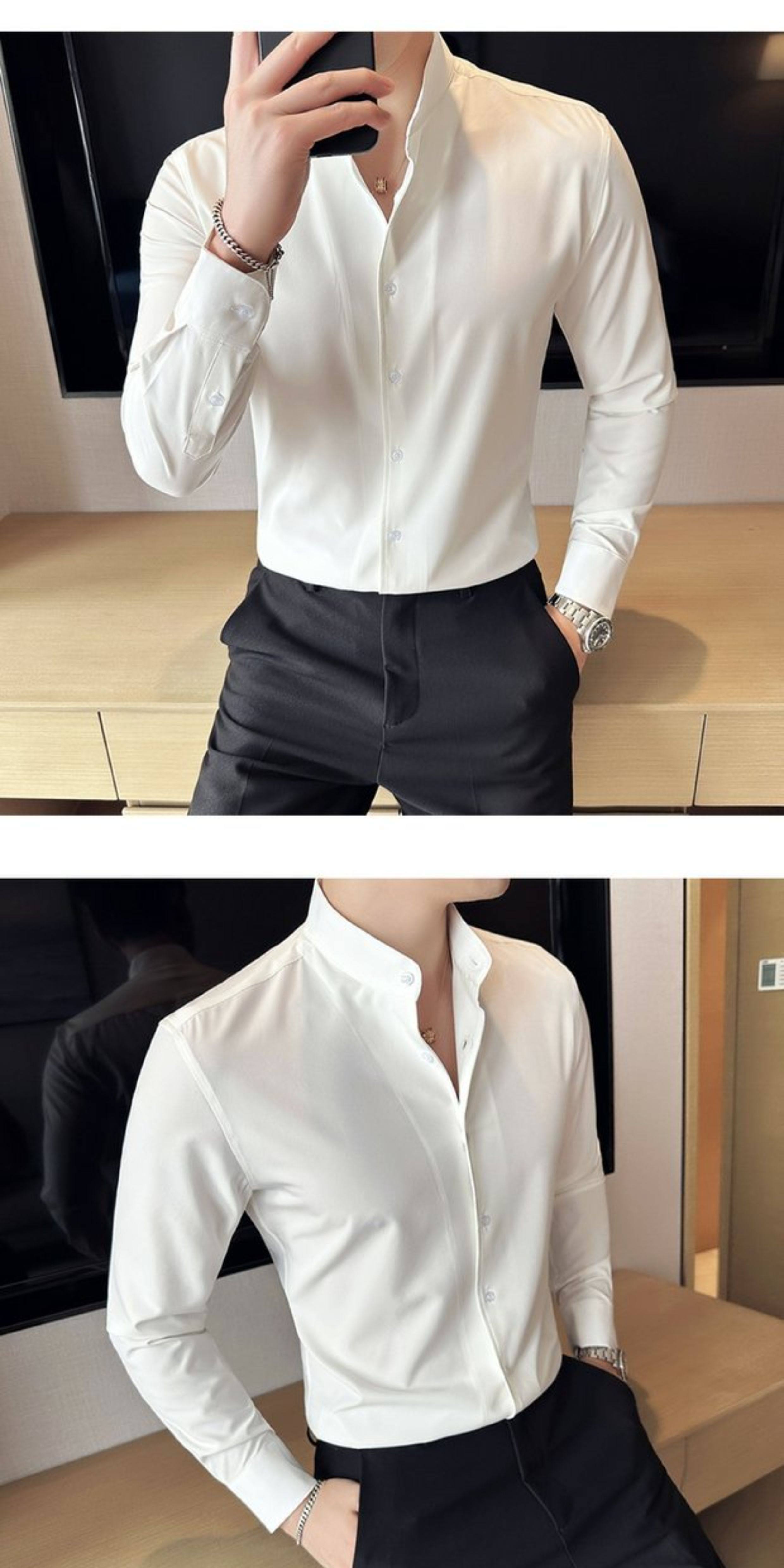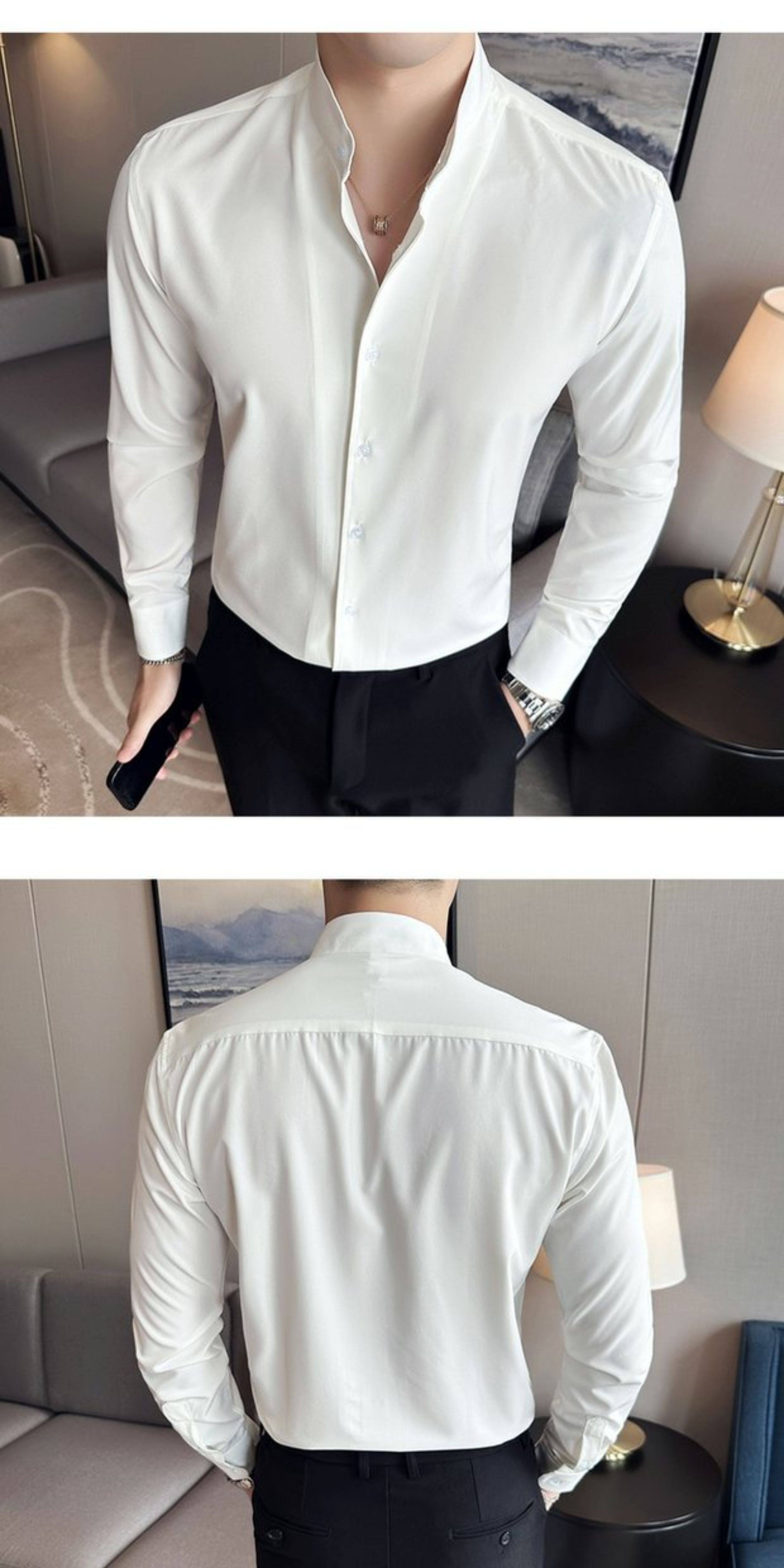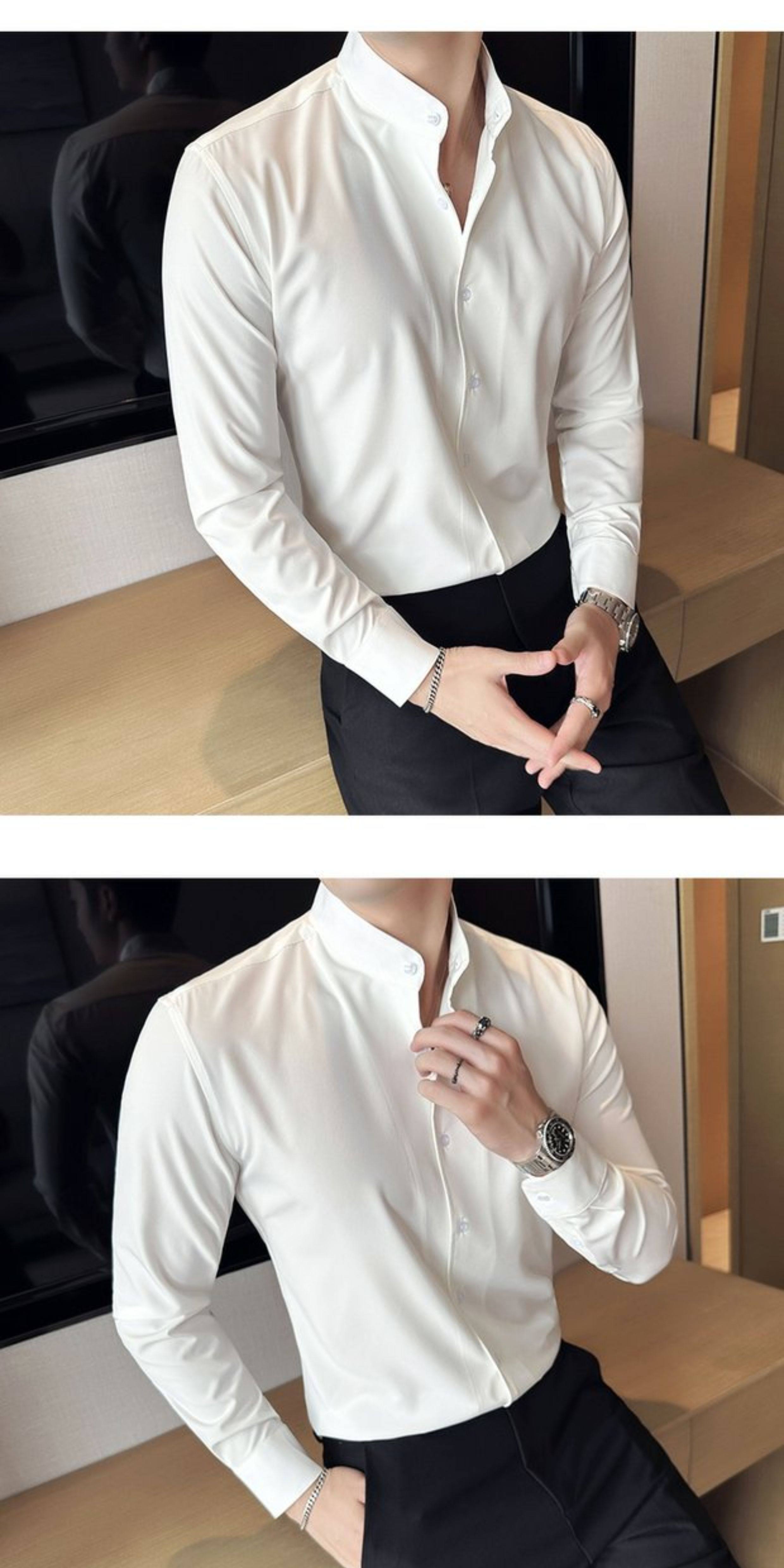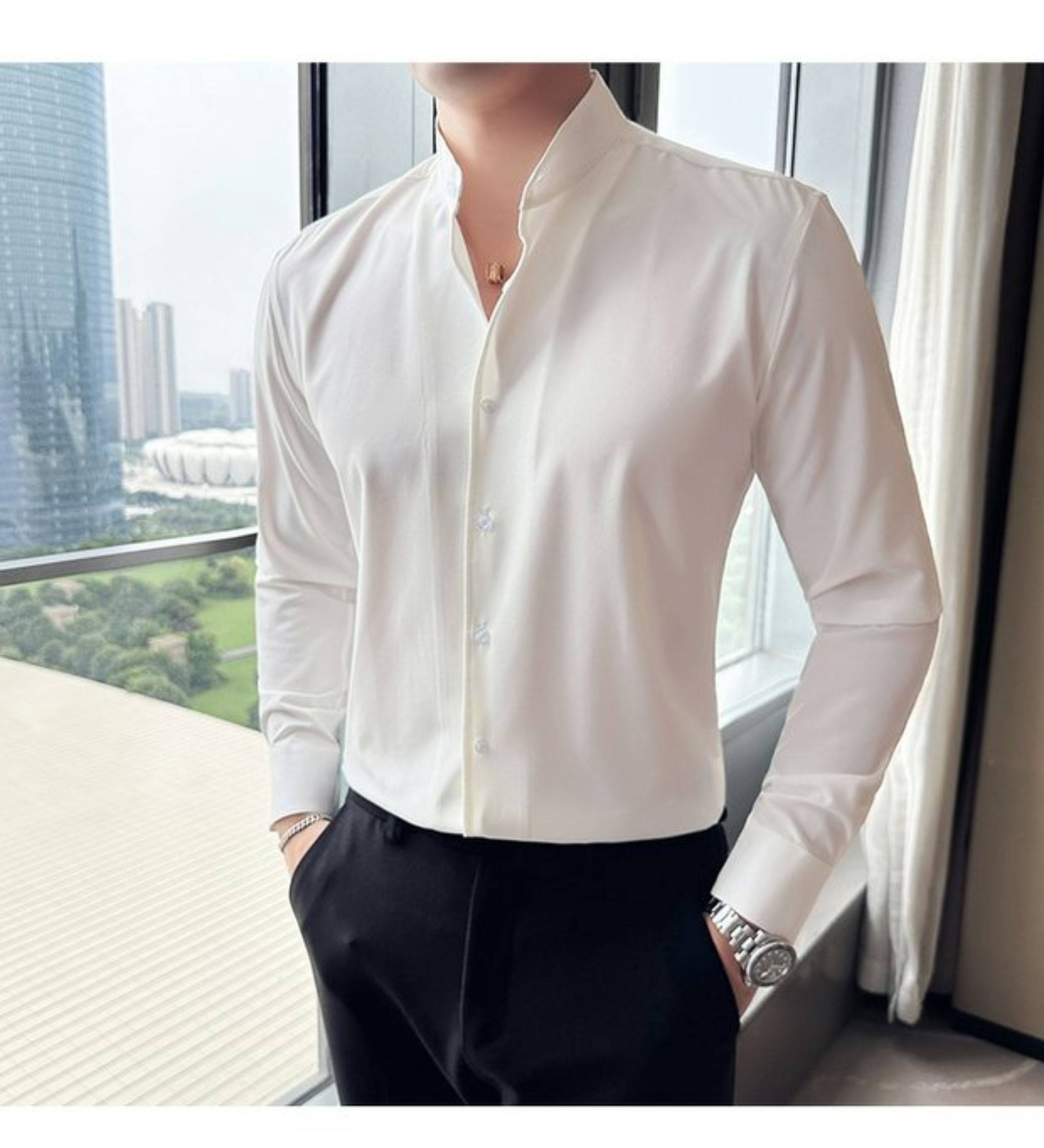 New Chinese-Style Stretchable Zhongshan Suit Men's Long-Sleeve Shirt, Thickened Business Fleece-Lined White Chinese Stand-Up Collar Shirt for Layering