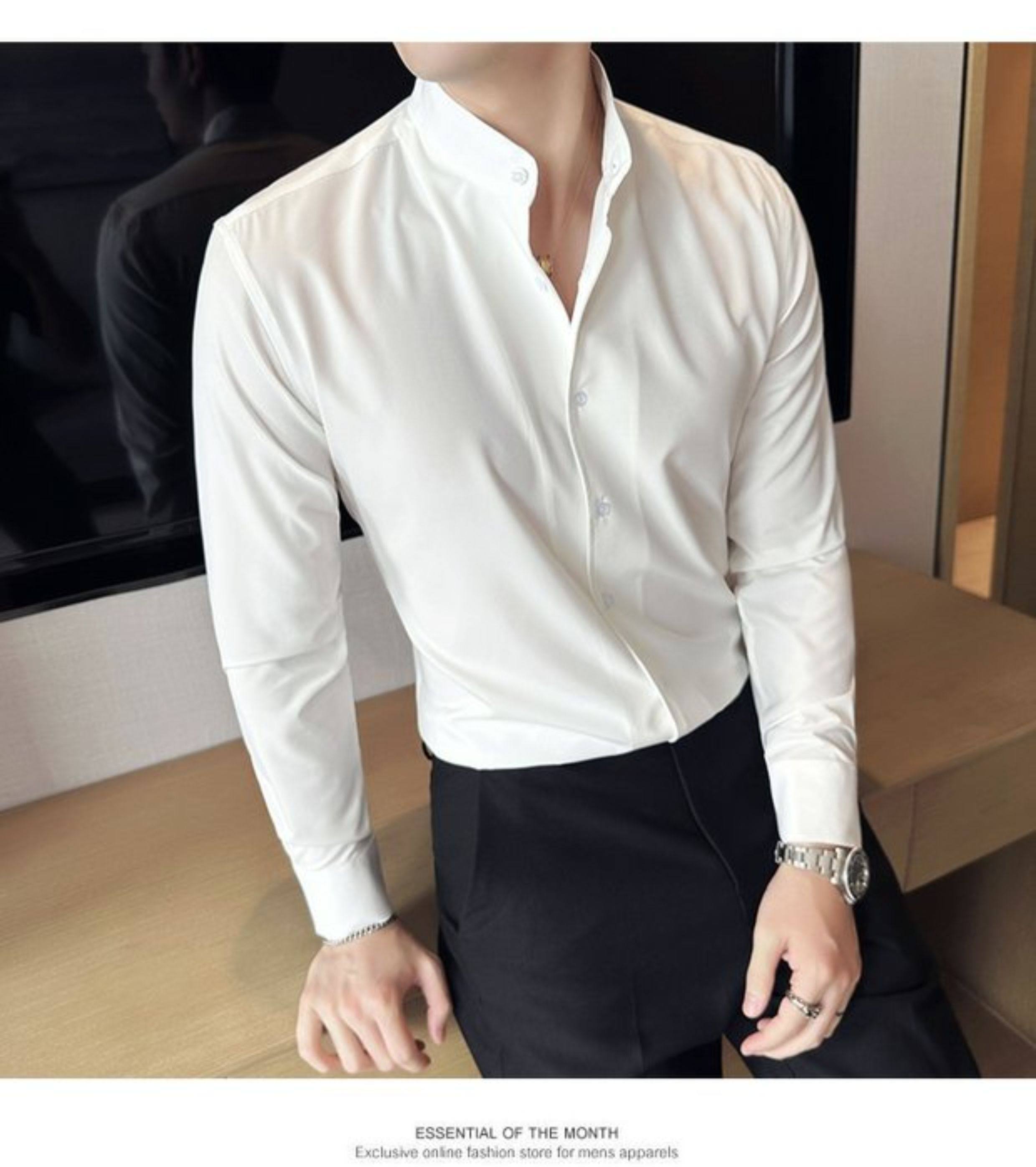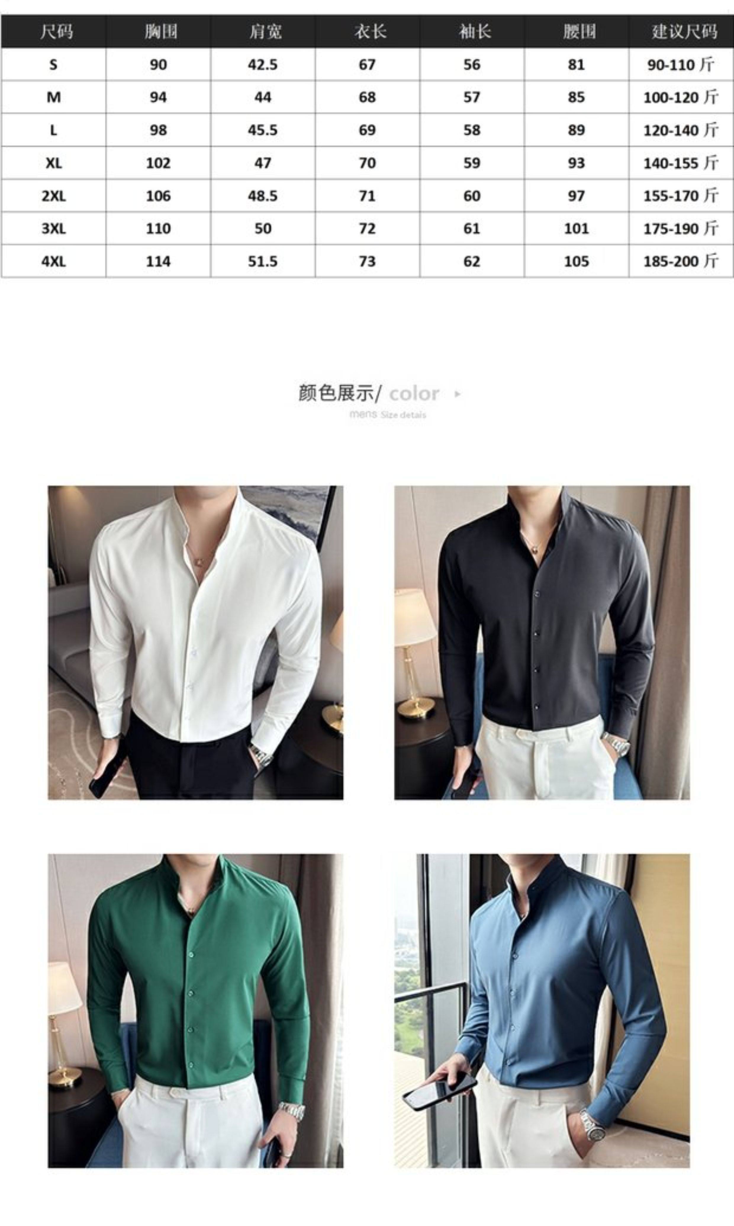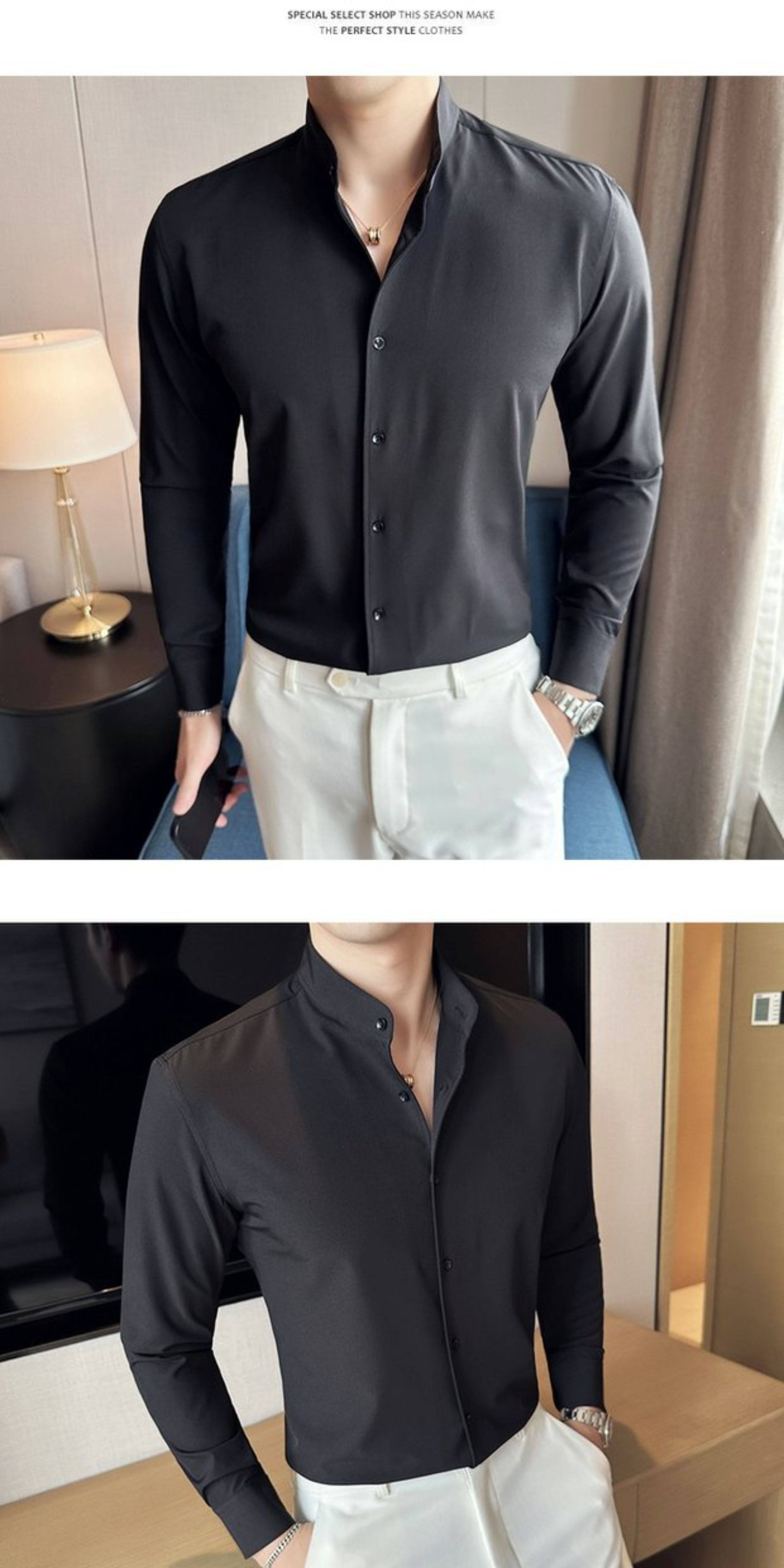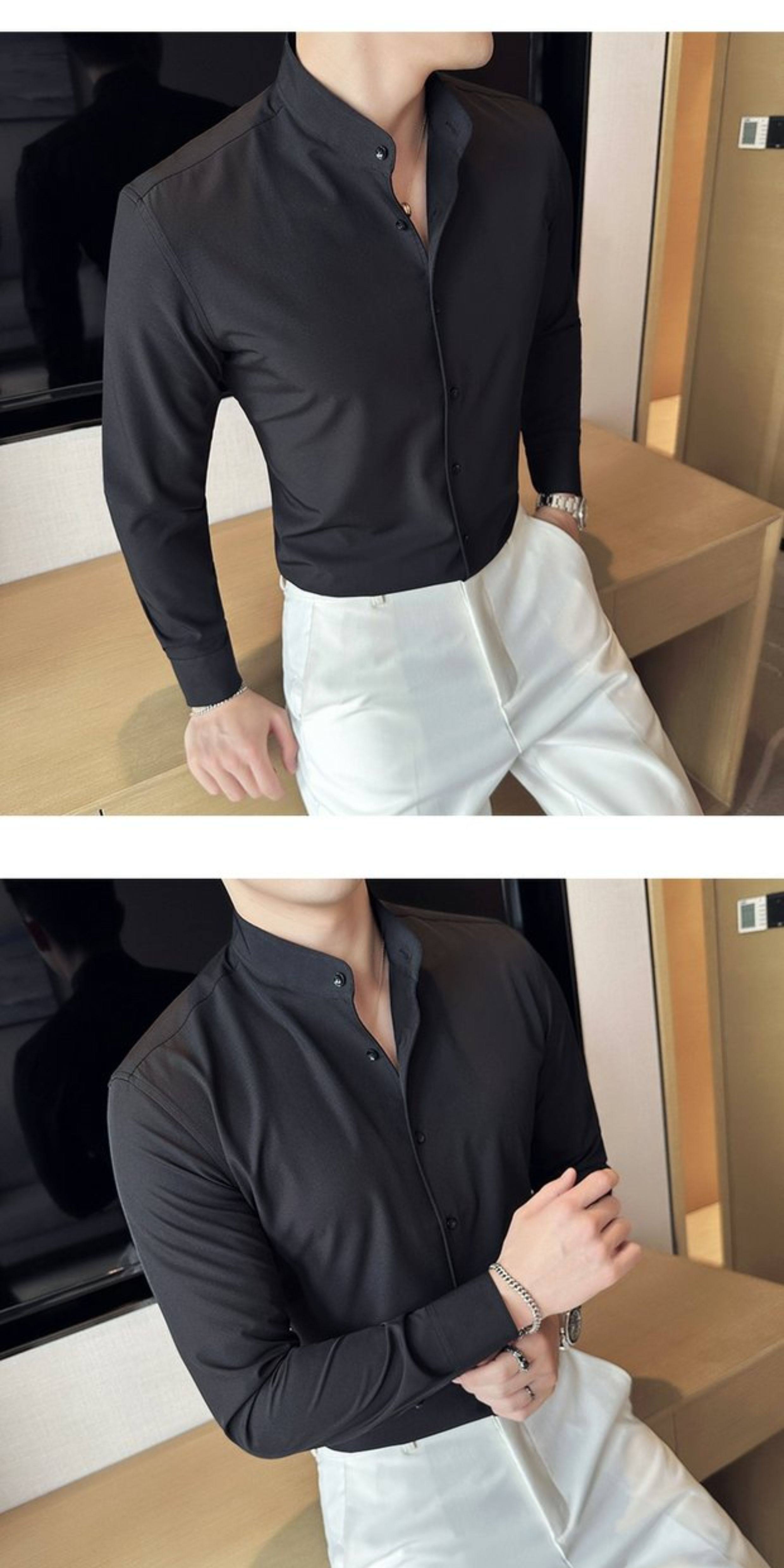 New Chinese-Style Stretchable Zhongshan Suit Men's Long-Sleeve Shirt, Thickened Business Fleece-Lined White Chinese Stand-Up Collar Shirt for Layering