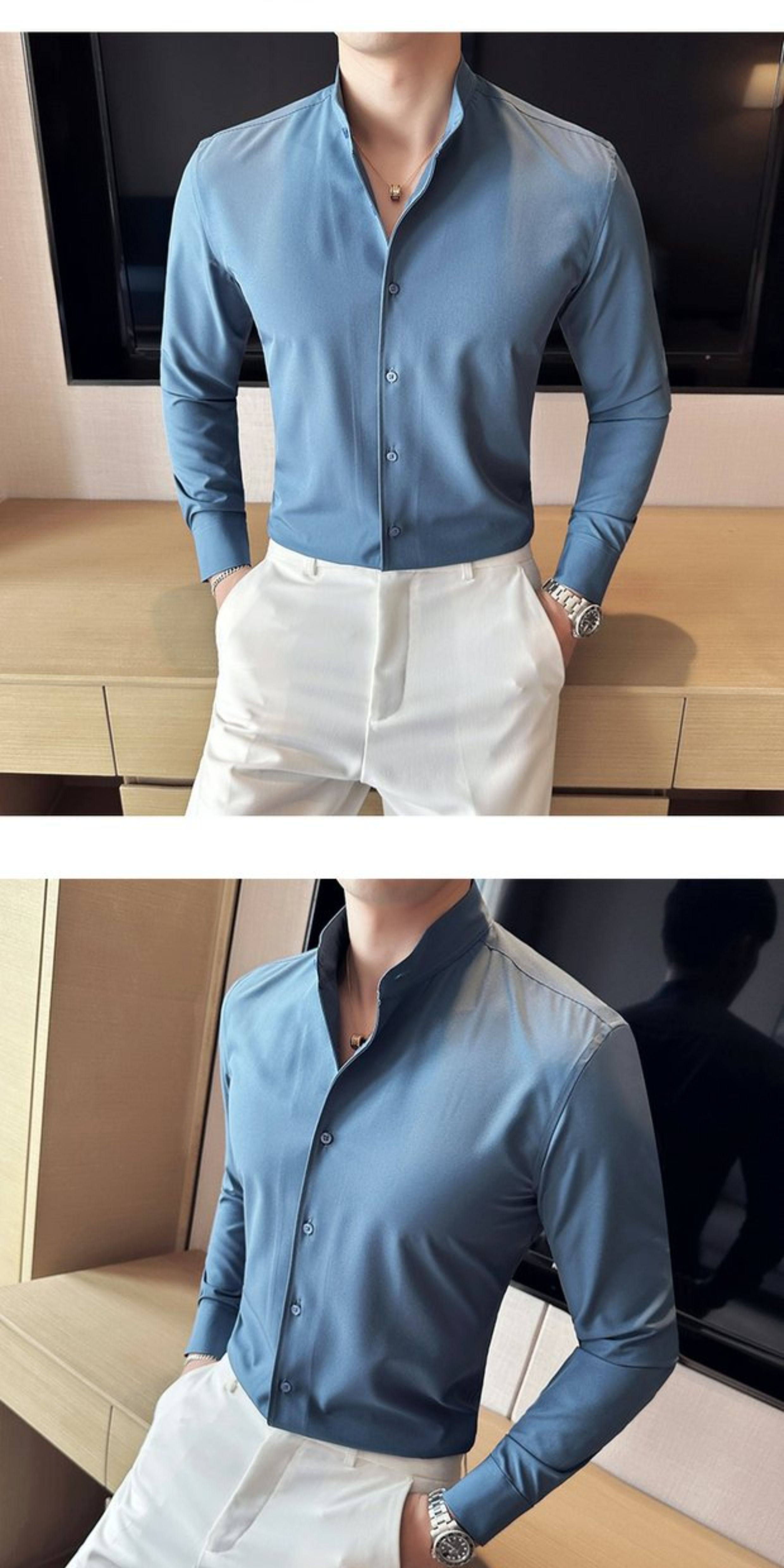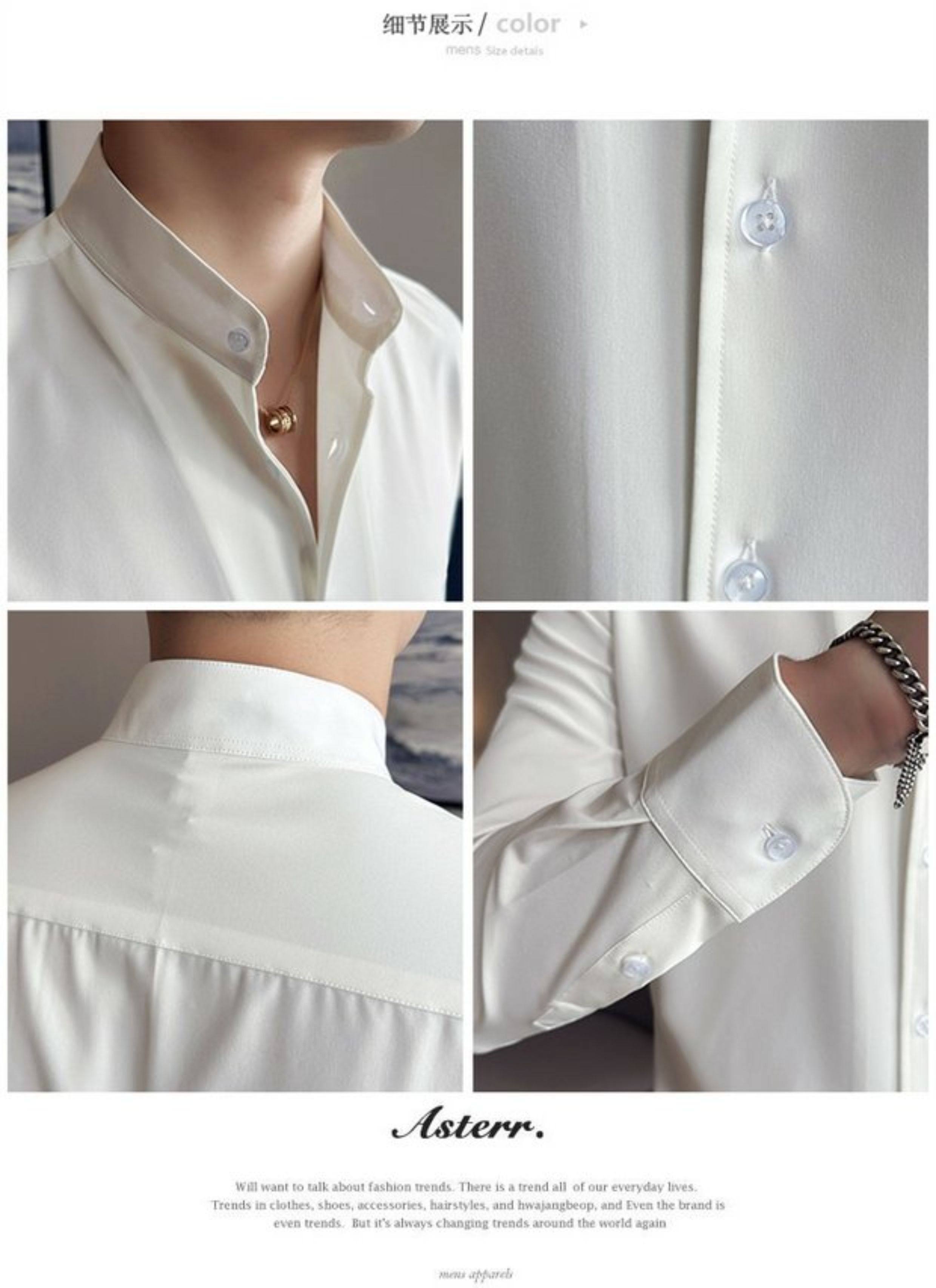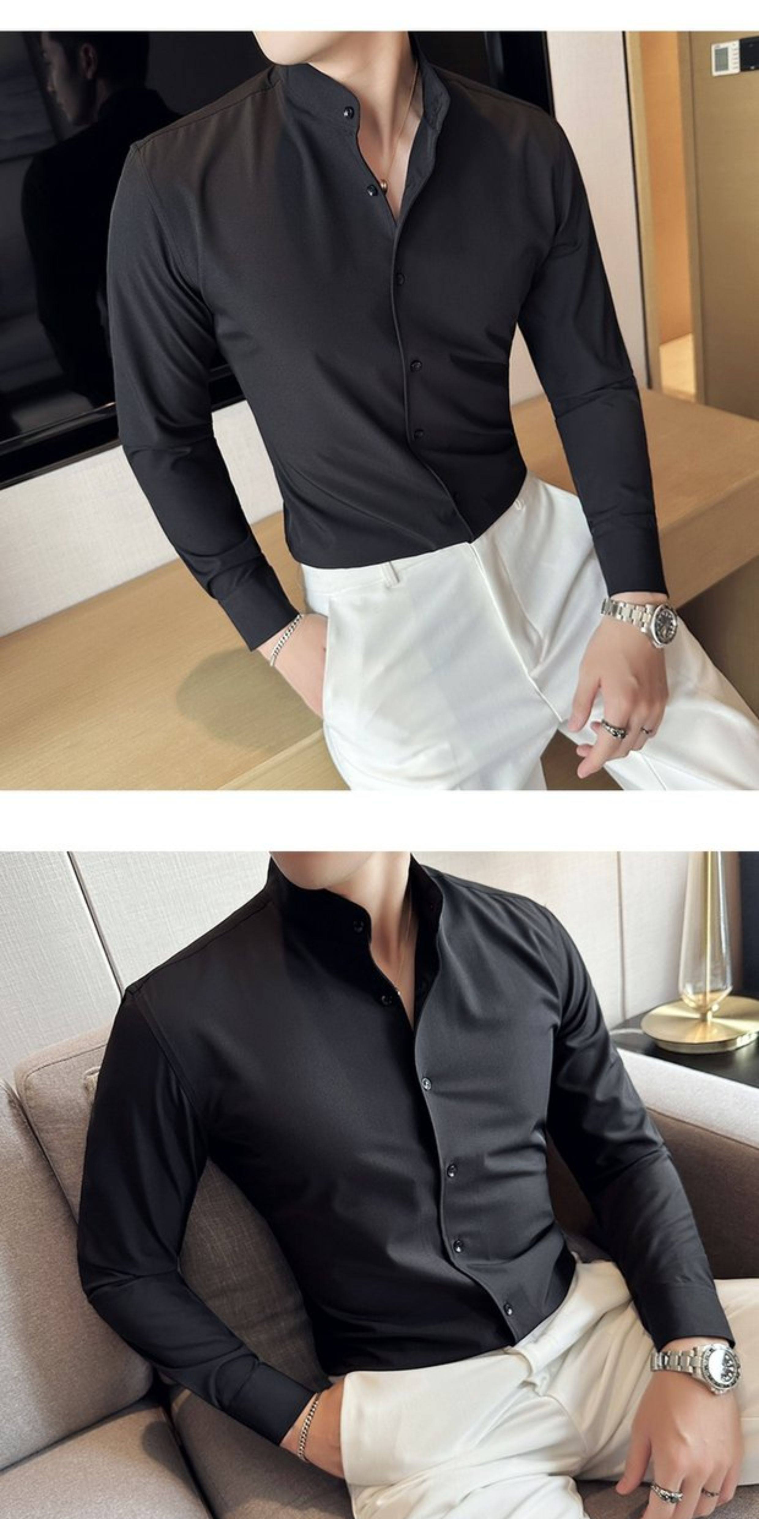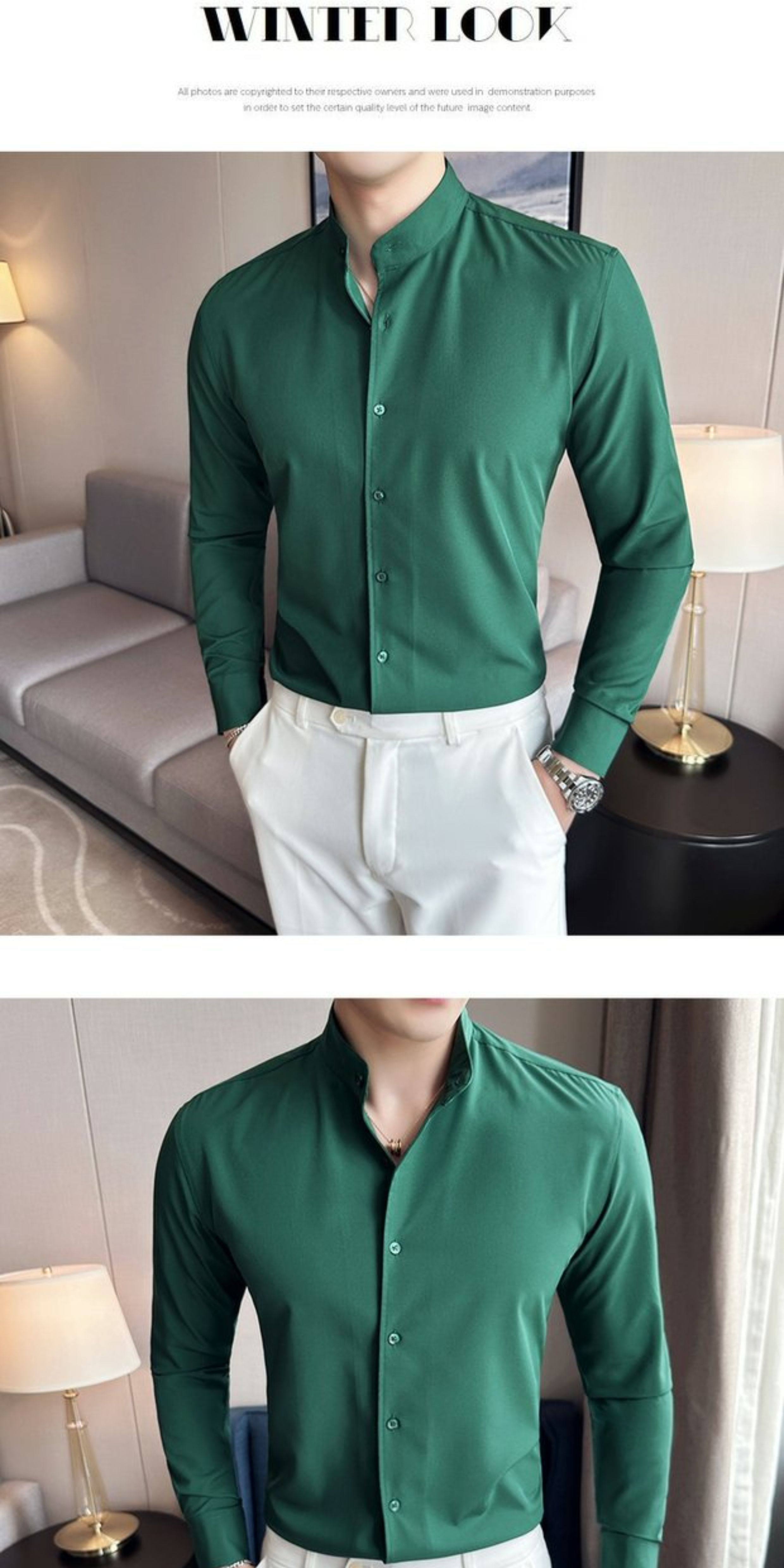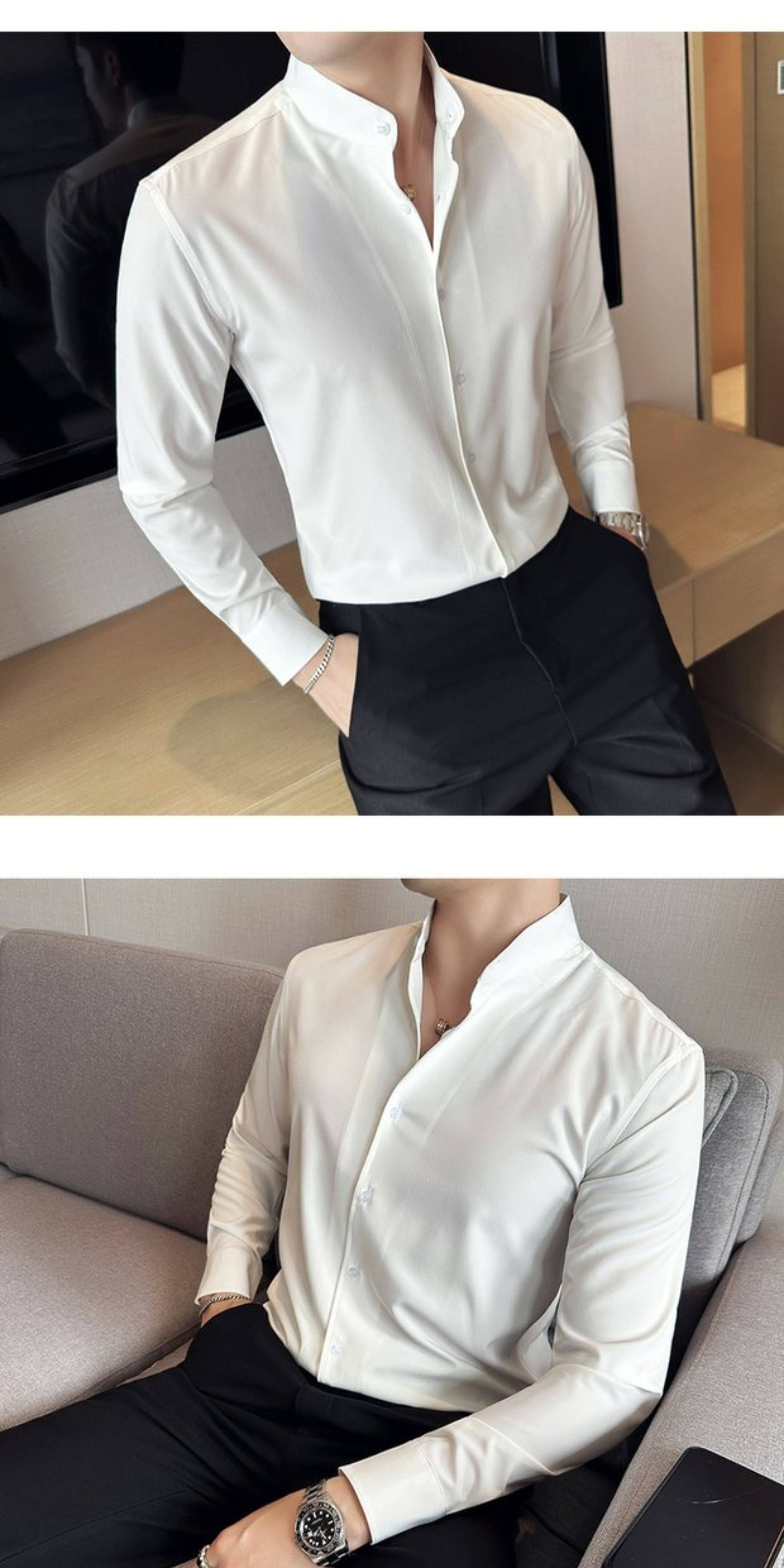 New Chinese-Style Stretchable Zhongshan Suit Men's Long-Sleeve Shirt, Thickened Business Fleece-Lined White Chinese Stand-Up Collar Shirt for Layering
