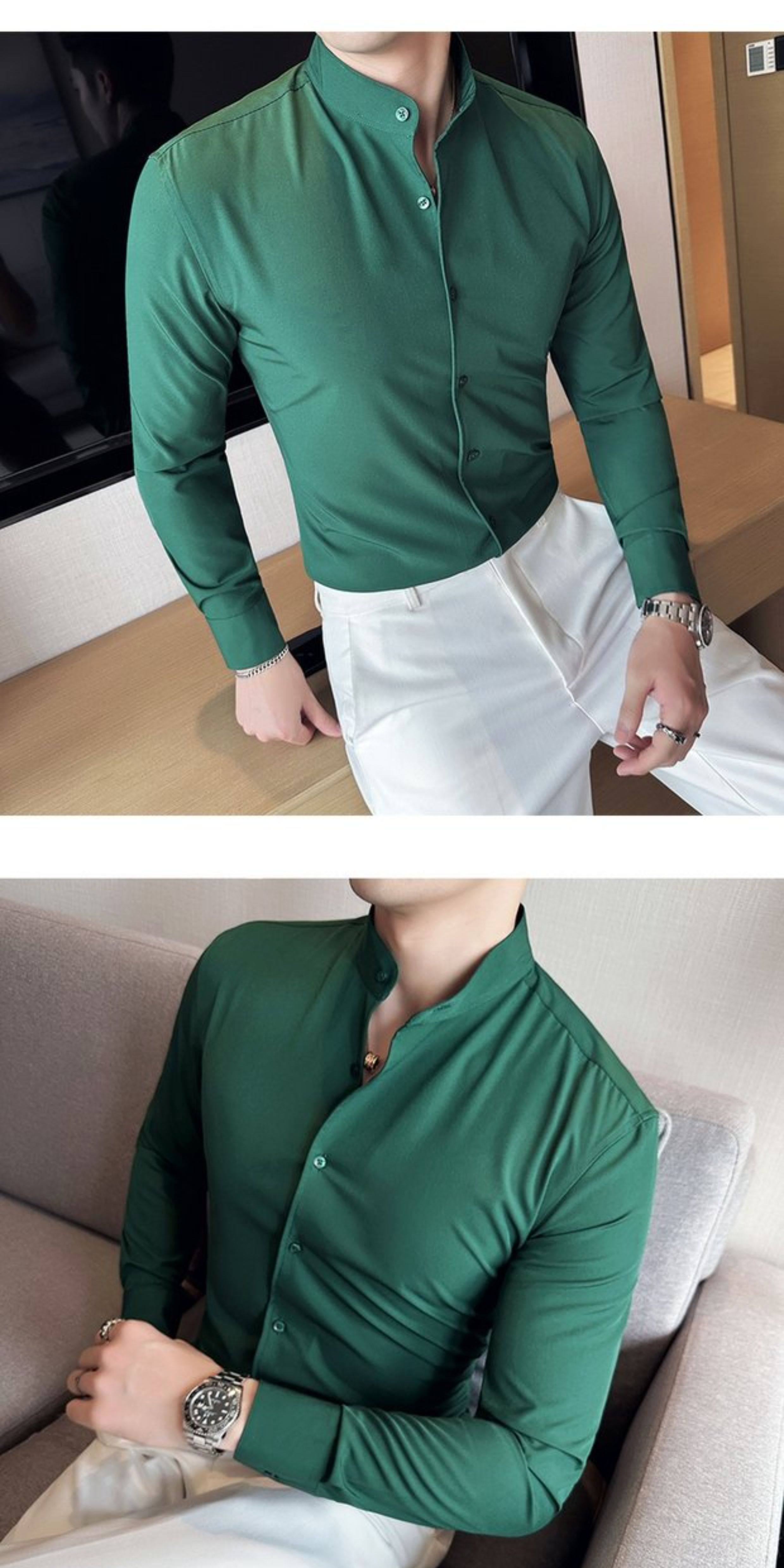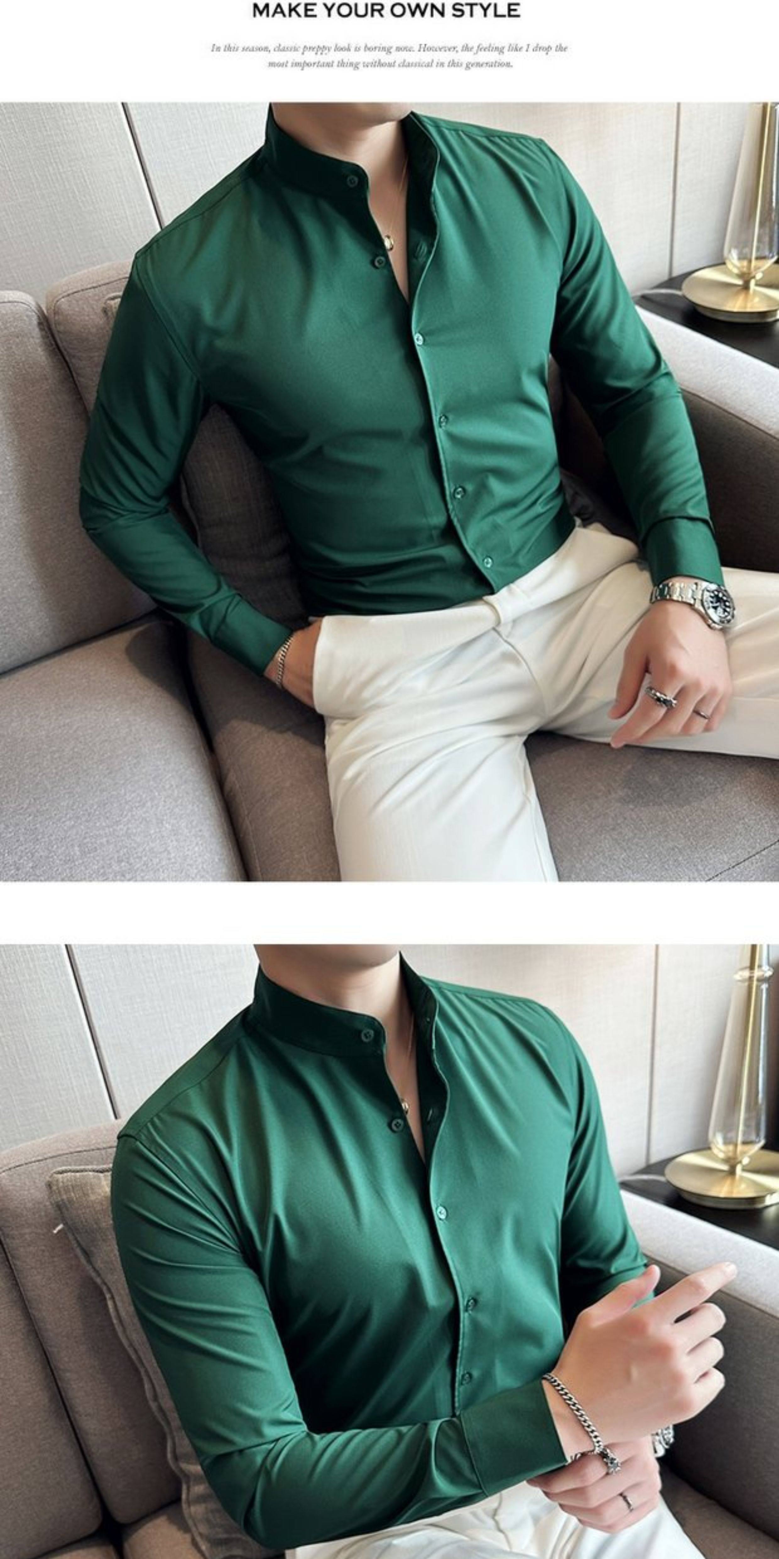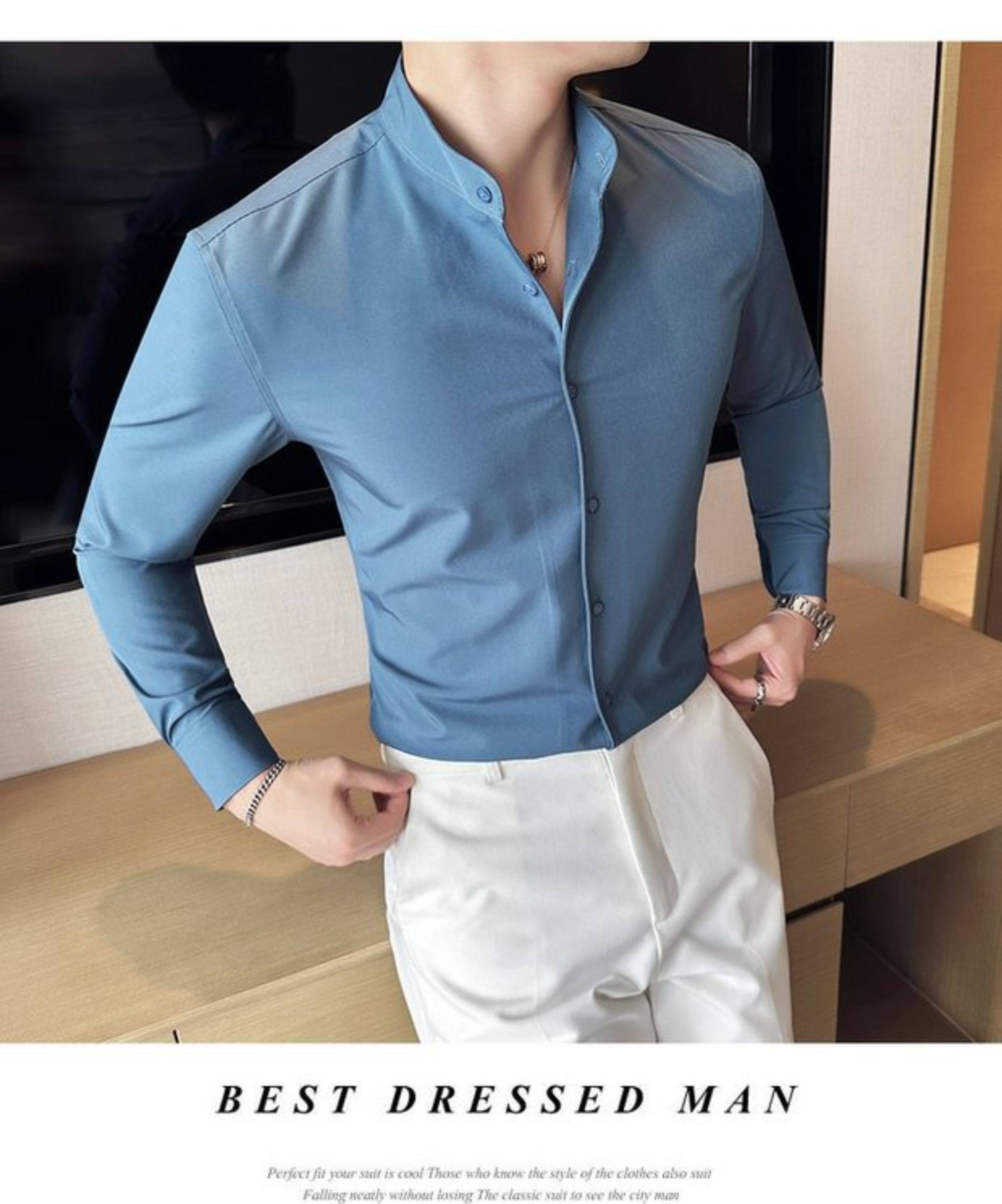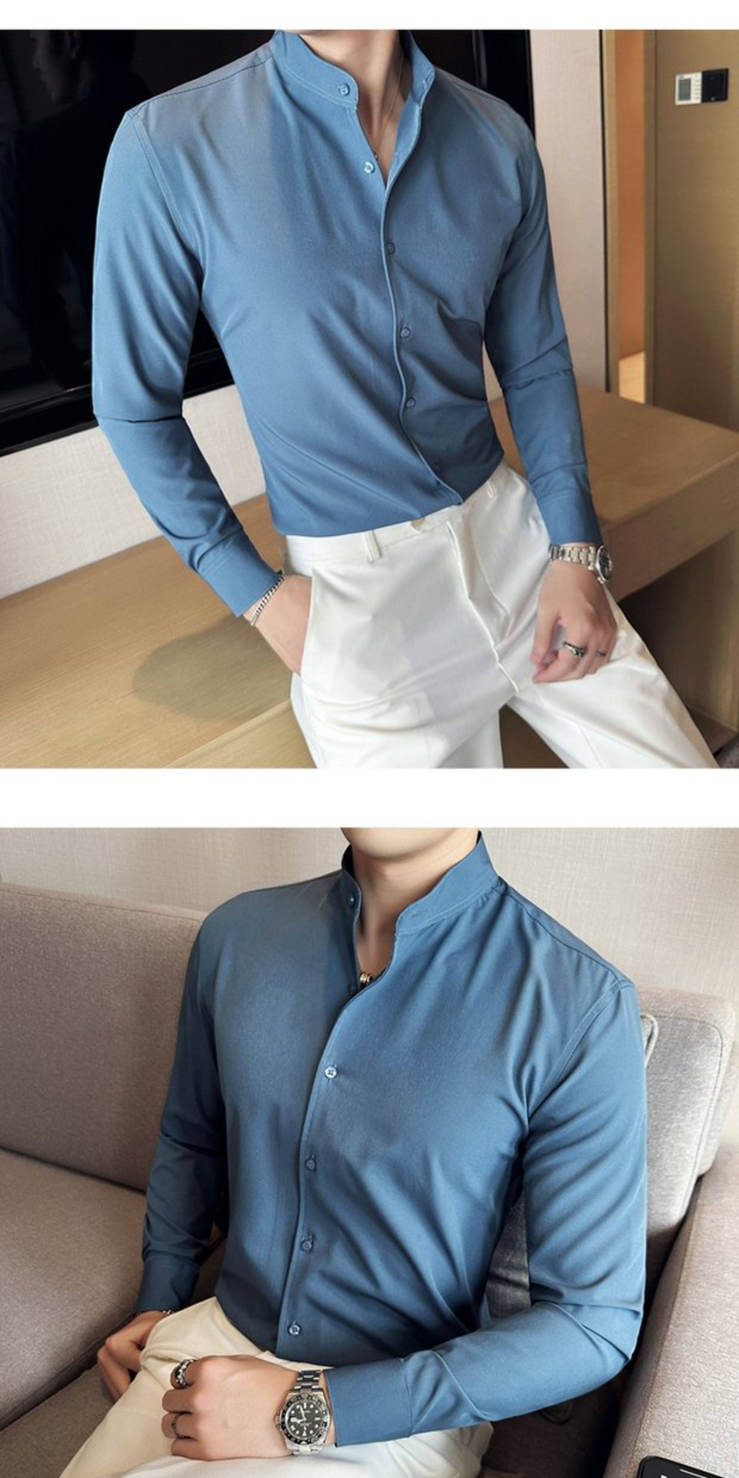 New Chinese-Style Stretchable Zhongshan Suit Men's Long-Sleeve Shirt, Thickened Business Fleece-Lined White Chinese Stand-Up Collar Shirt for Layering