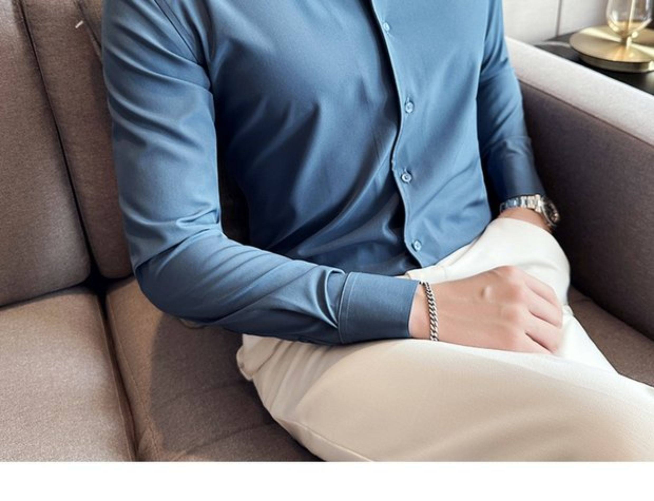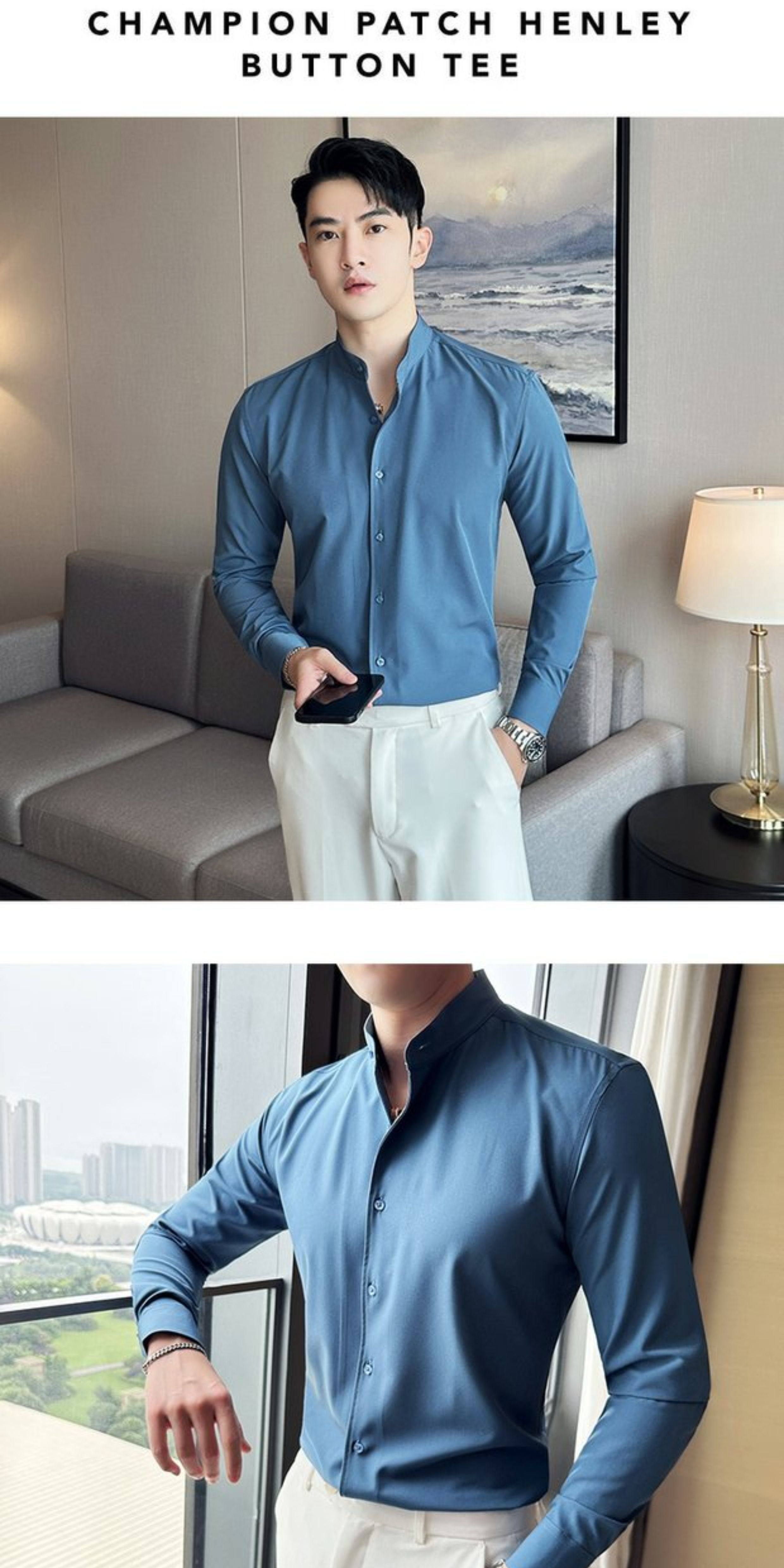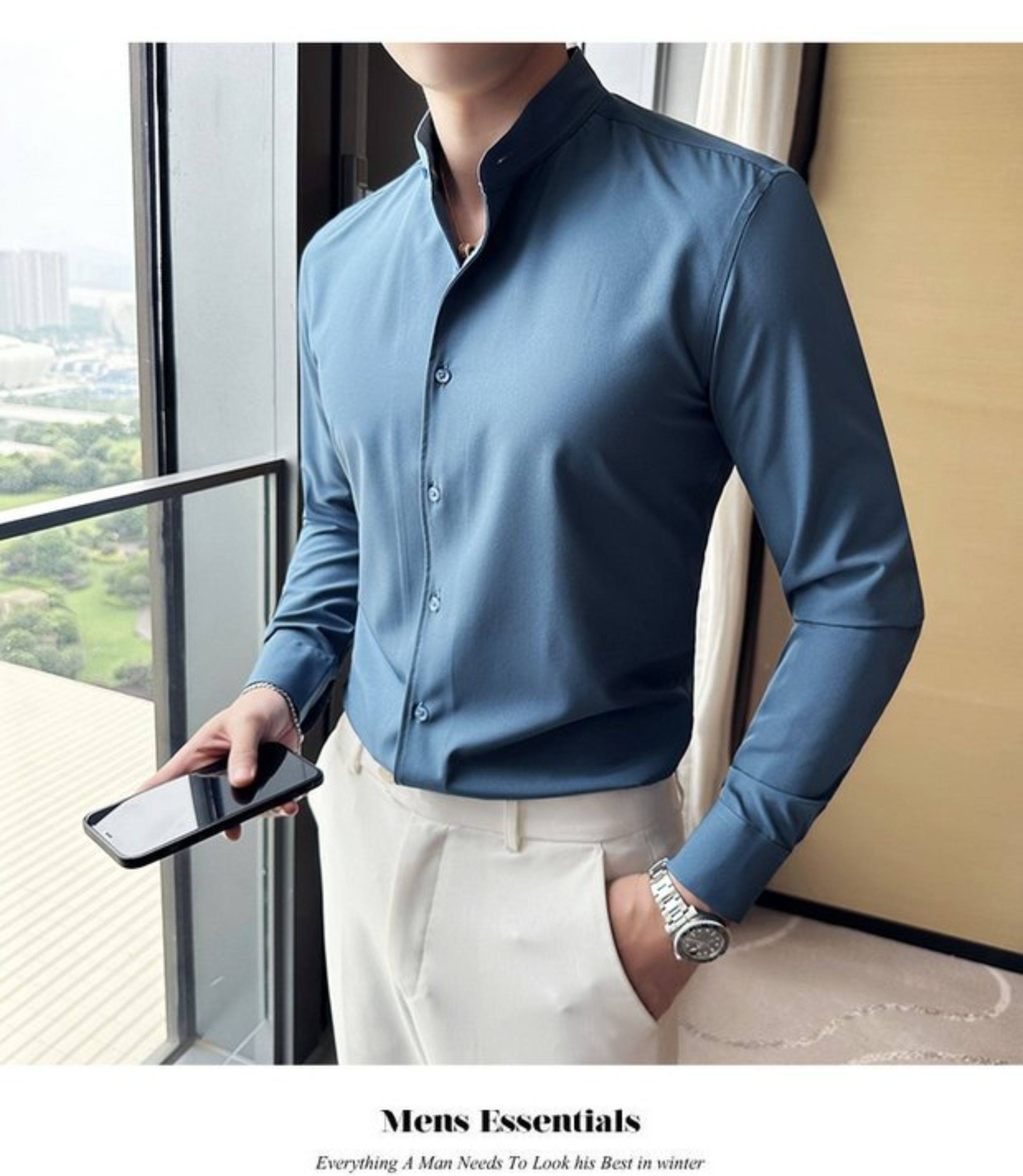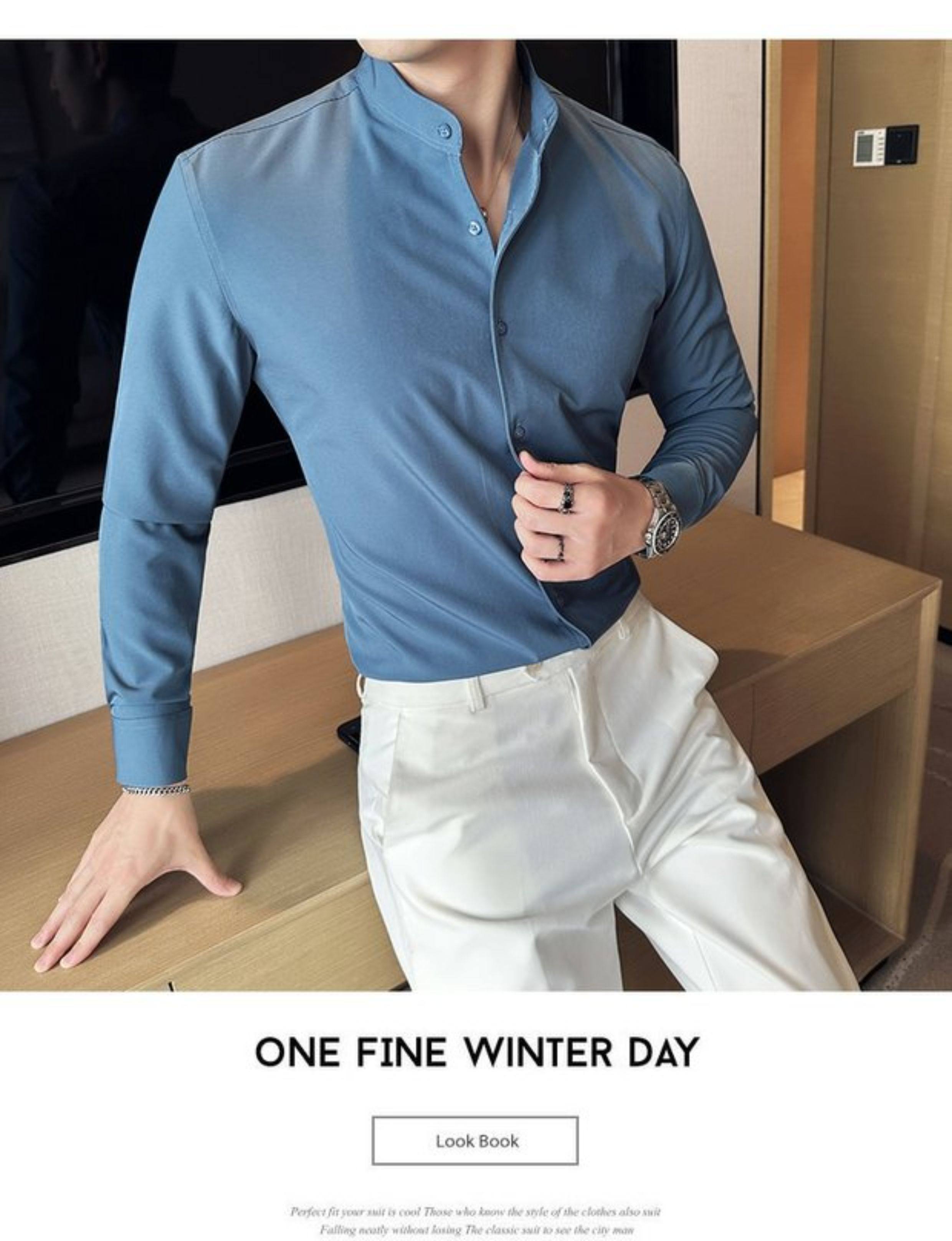 New Chinese-Style Stretchable Zhongshan Suit Men's Long-Sleeve Shirt, Thickened Business Fleece-Lined White Chinese Stand-Up Collar Shirt for Layering