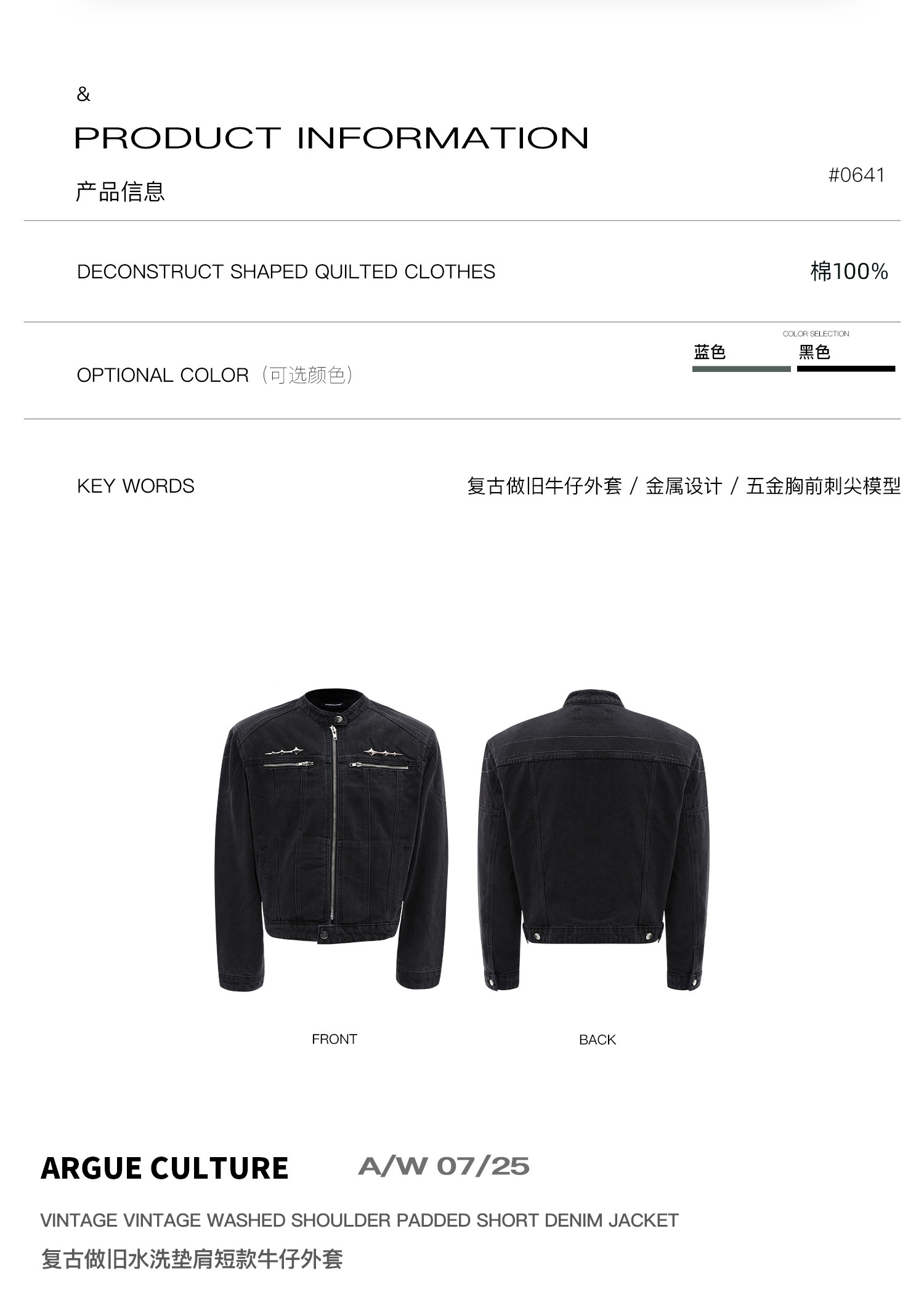 Argue24S Early Spring Vintage Distressed Washed Shoulder-Padded Short Denim Jacket with Metal Design Collarless Jacket for Men