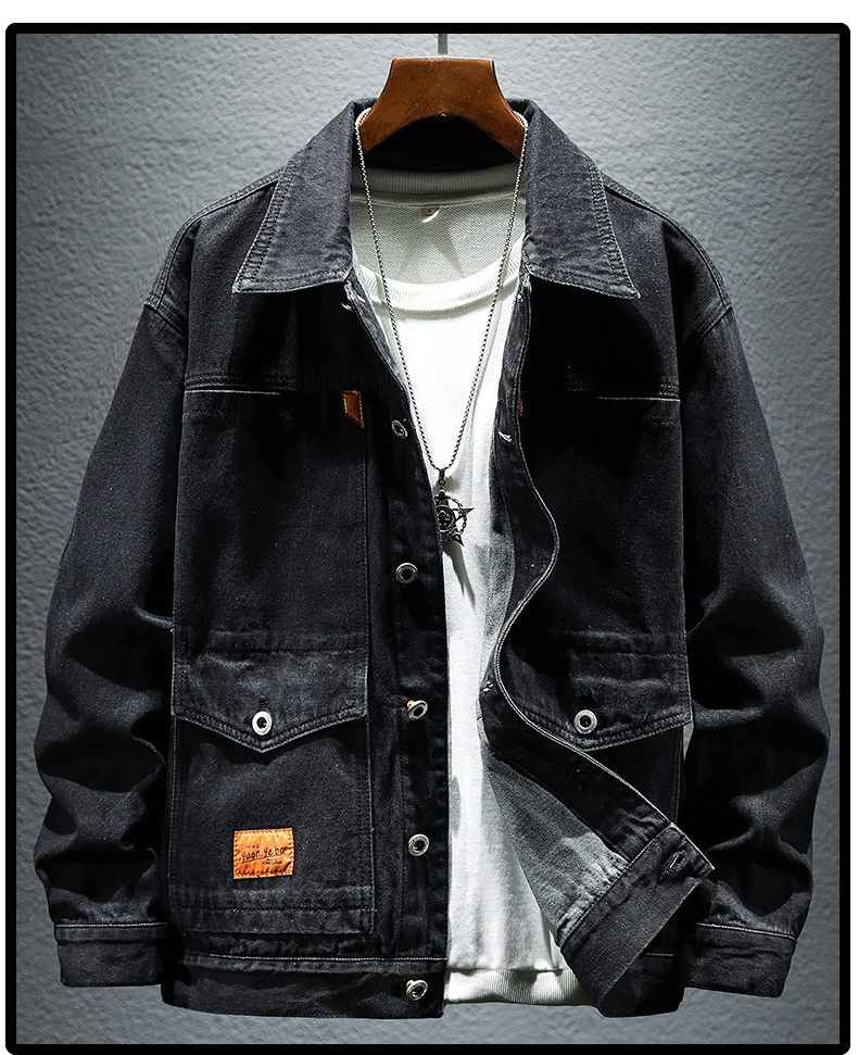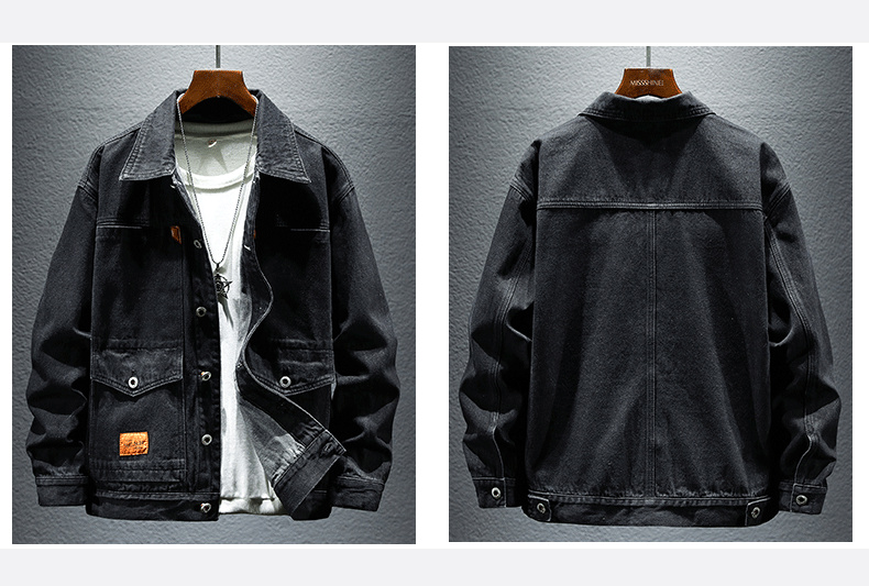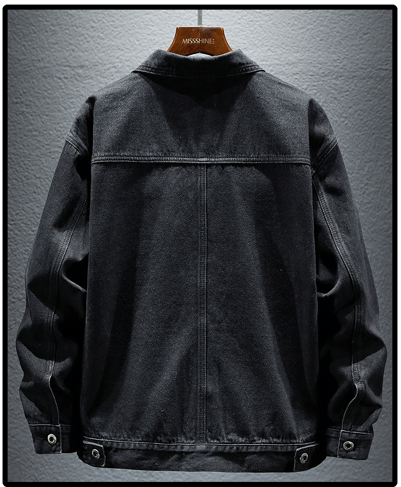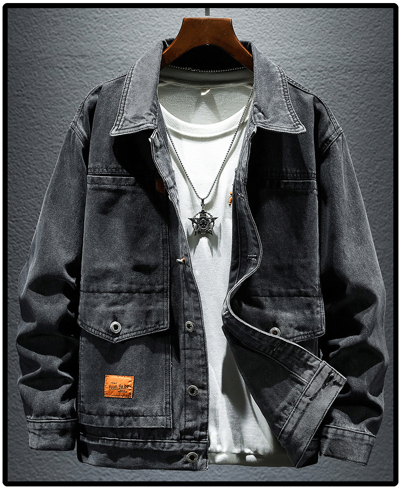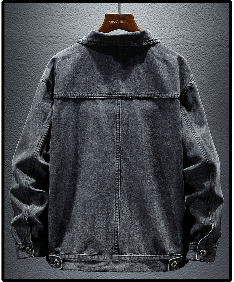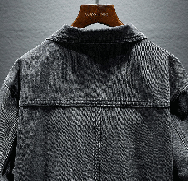 Trendy Retro High-End Black and Gray Denim Jacket for Men, Spring and Autumn, Trendy Casual Loose Large Size Workwear Jacket