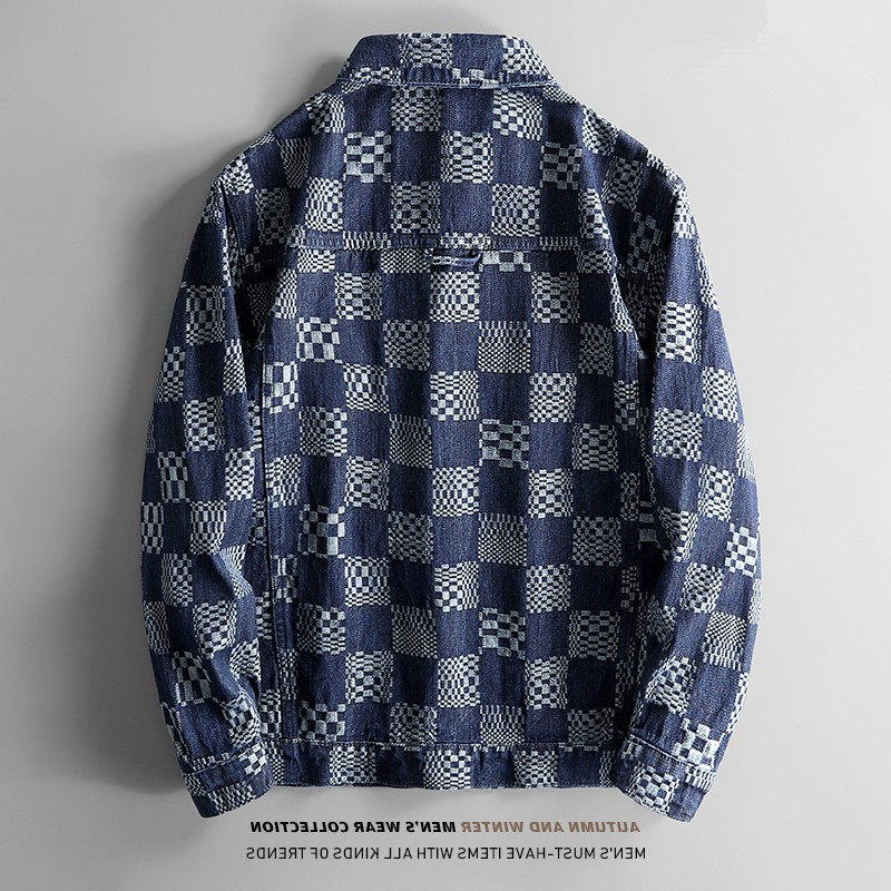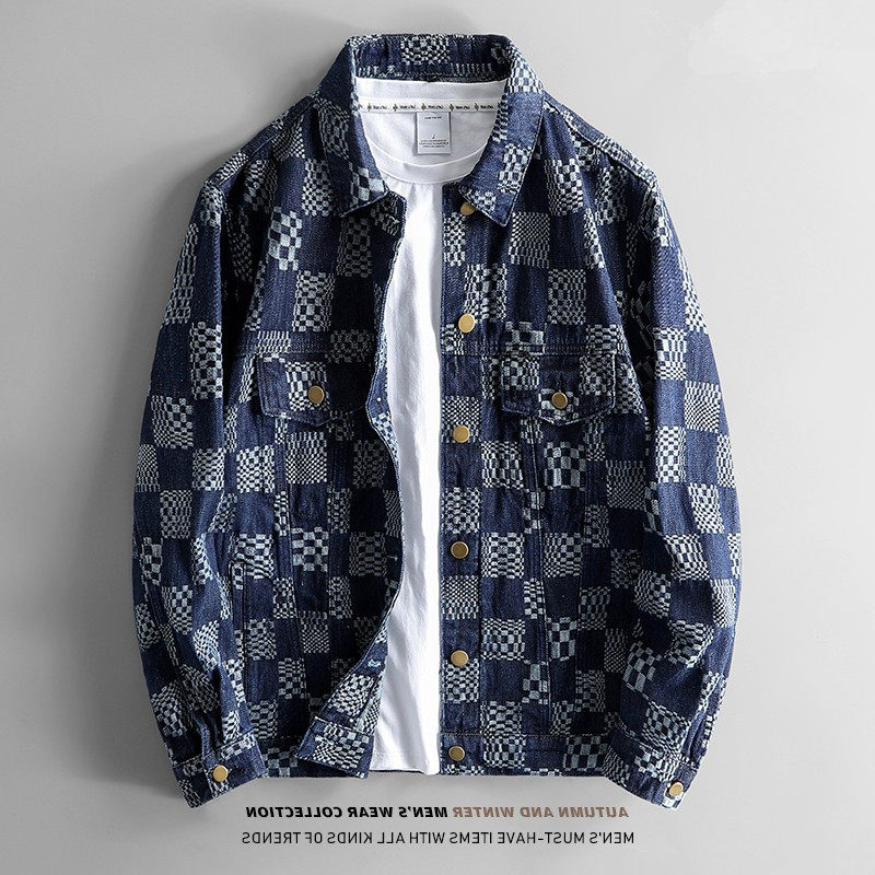 Trendy Brand High-End Jacquard Denim Jacket for Men, Spring and Autumn Loose Checkerboard Pattern Couple's Casual Jacket
