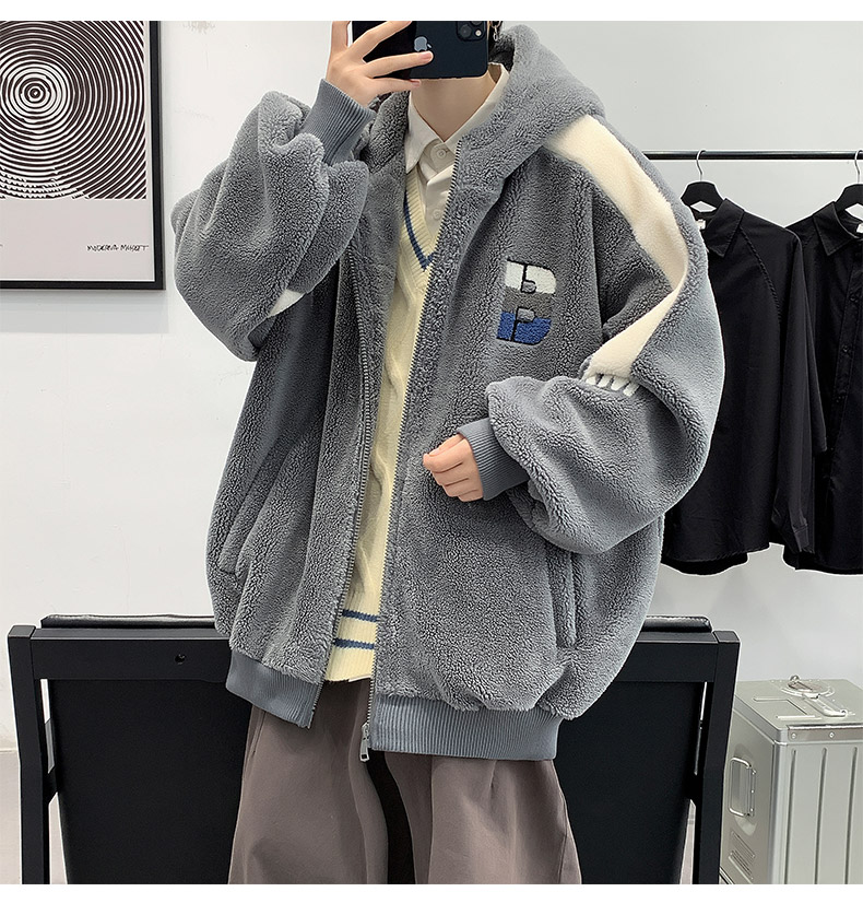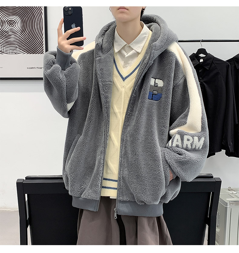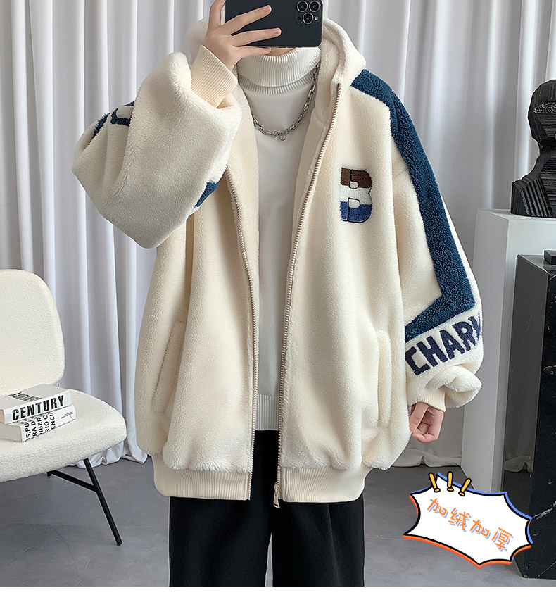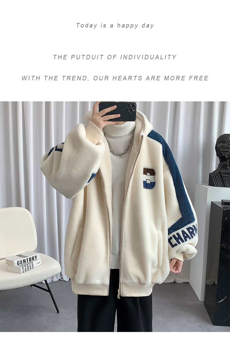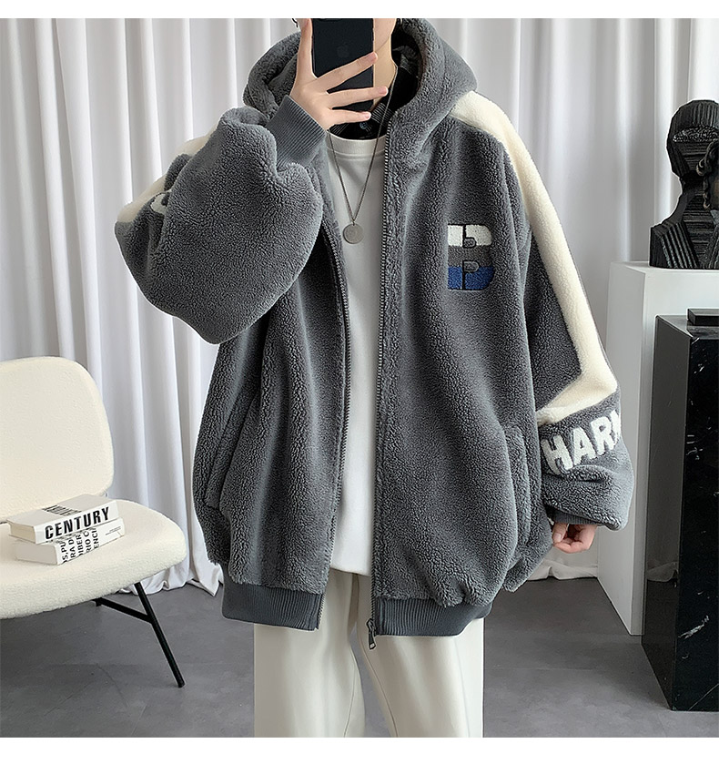 Teenager's Lamb Wool Plush Jacket for Men, Winter Thickened with Fleece, Hooded, Trendy, Warm, Suitable for Middle and High School Students and College Students, Cotton Clothing