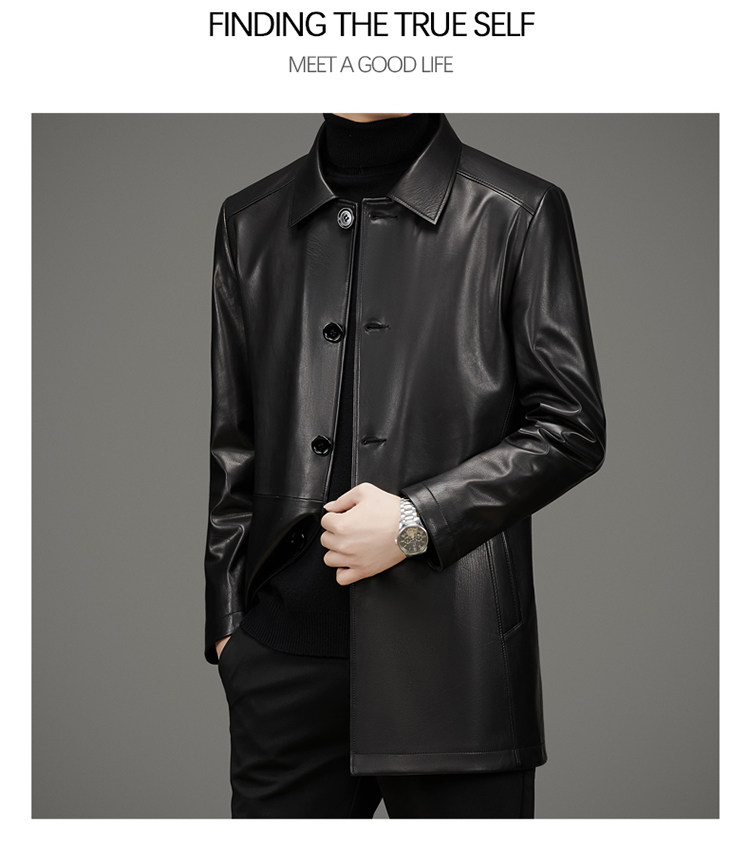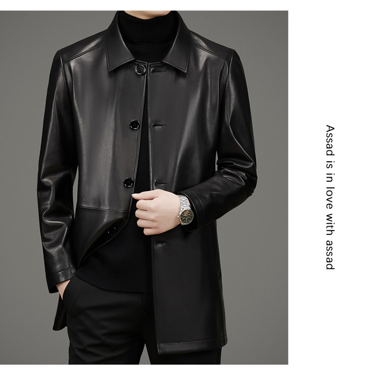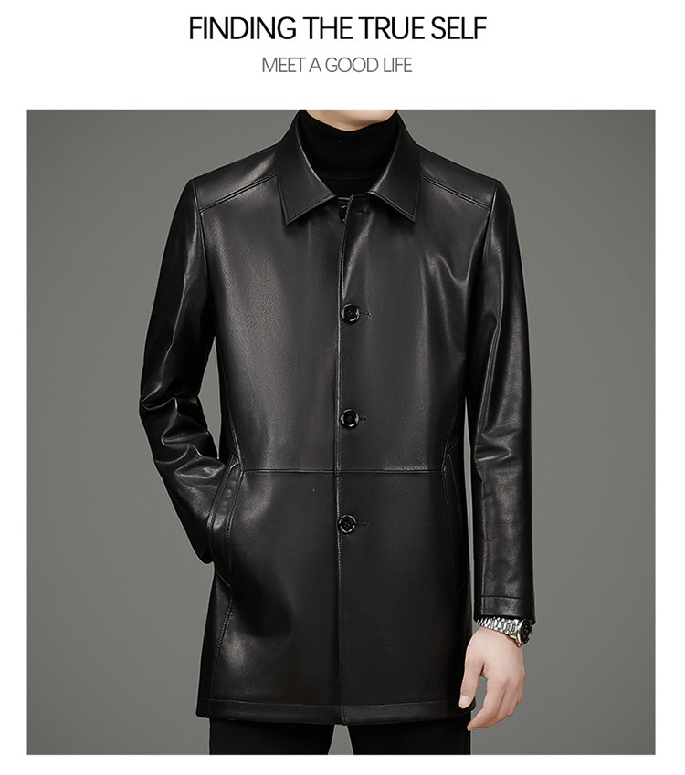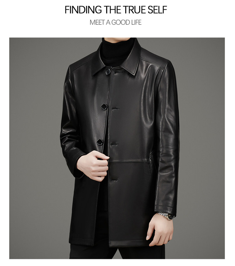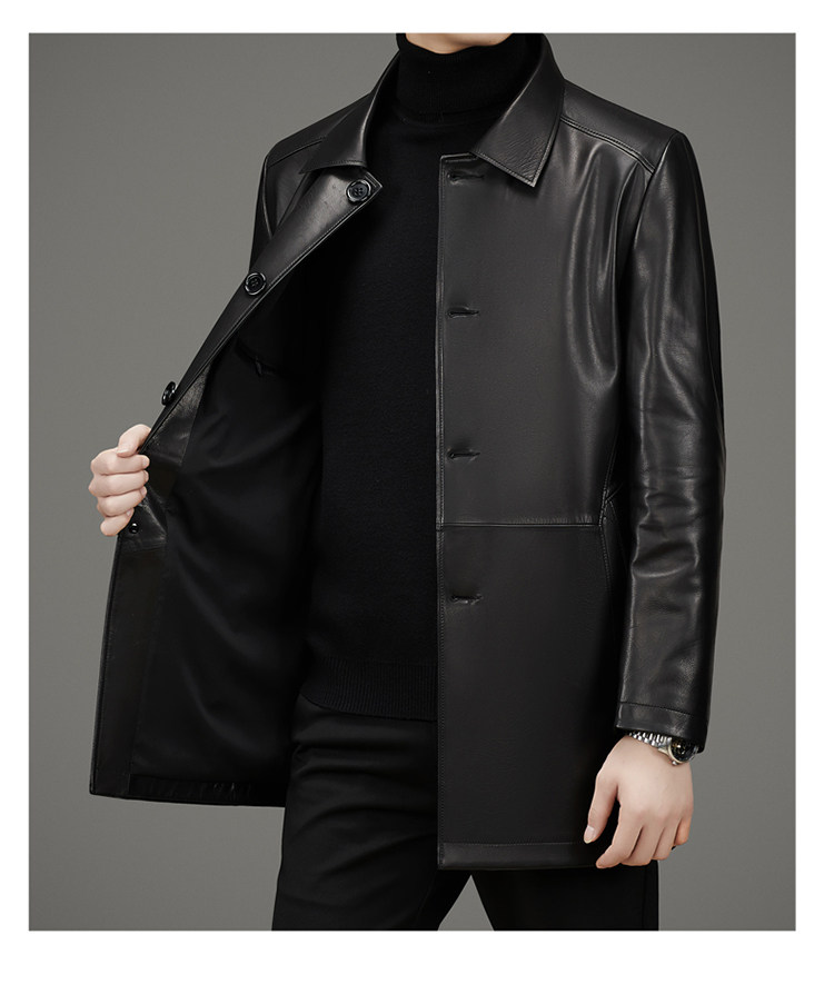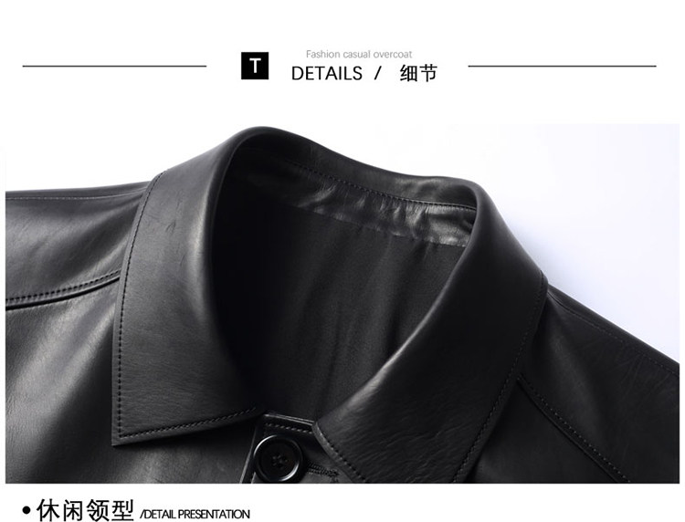 Pierre Cardin Autumn Collection First Layer Calfskin Genuine Leather Men's Mid-Length Trench Coat with Turn-Down Collar Leather Jacket