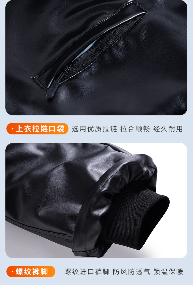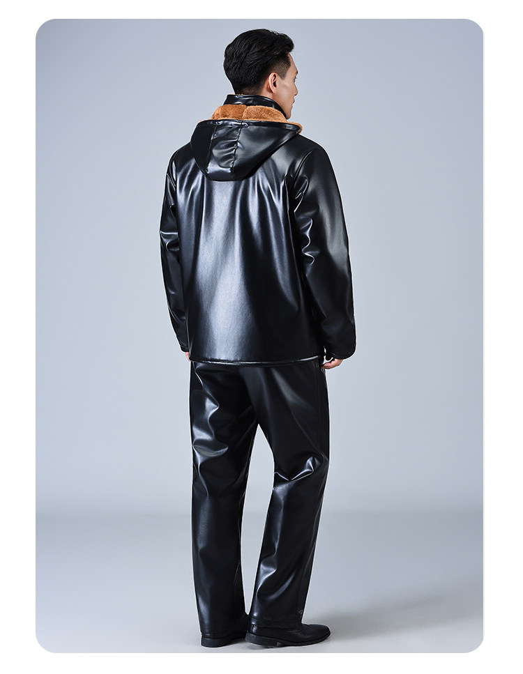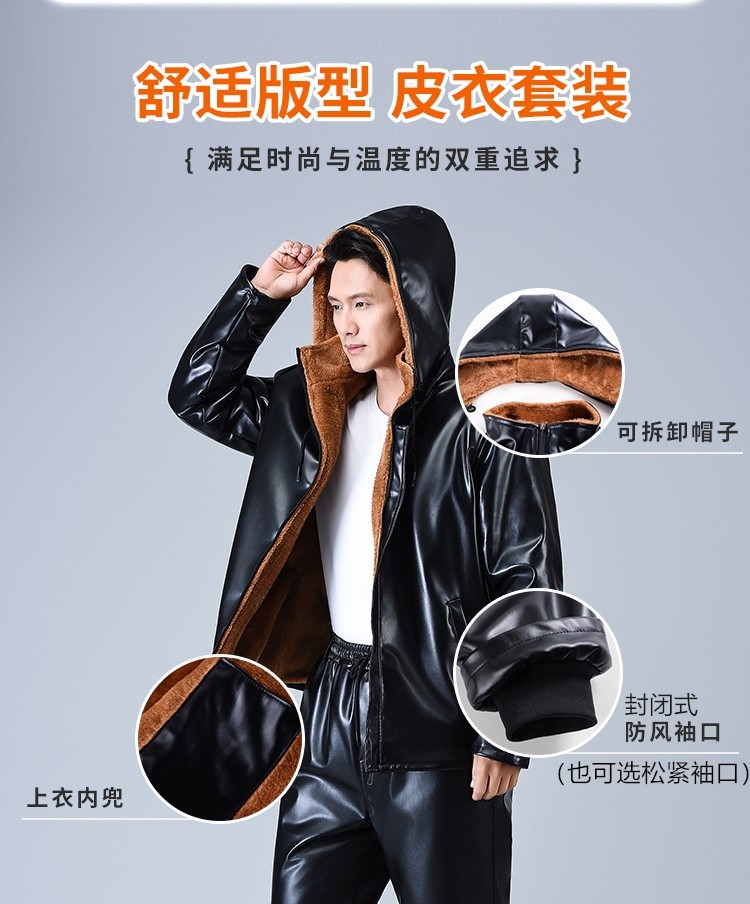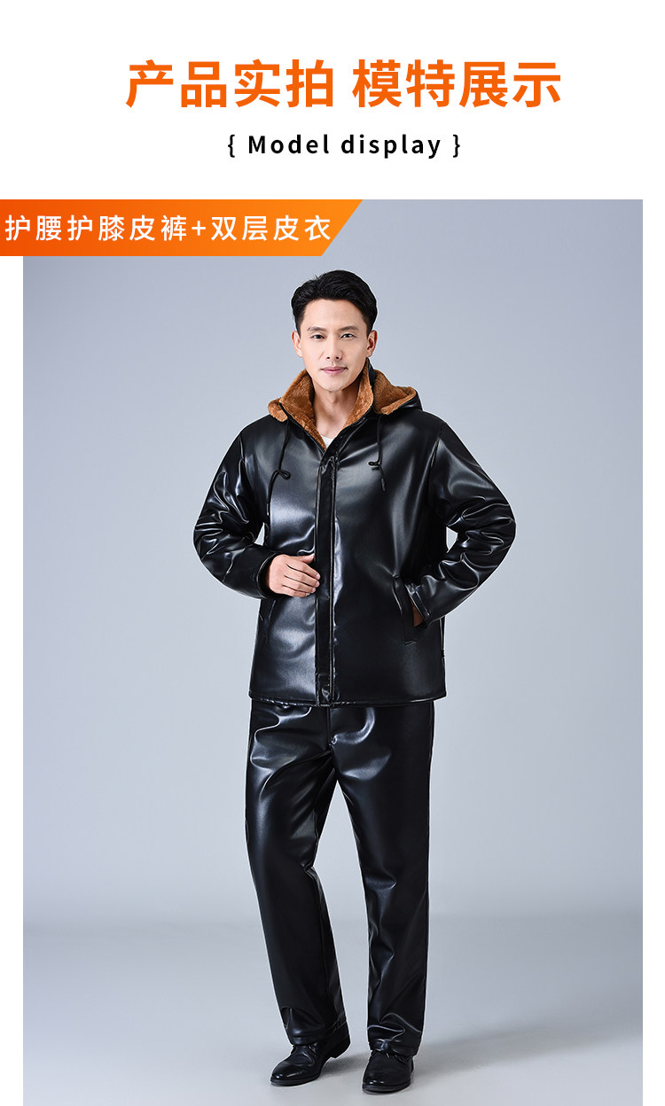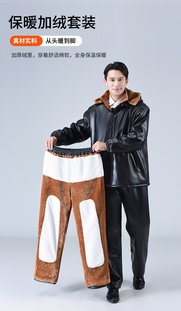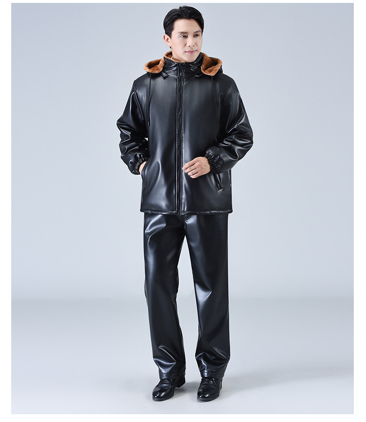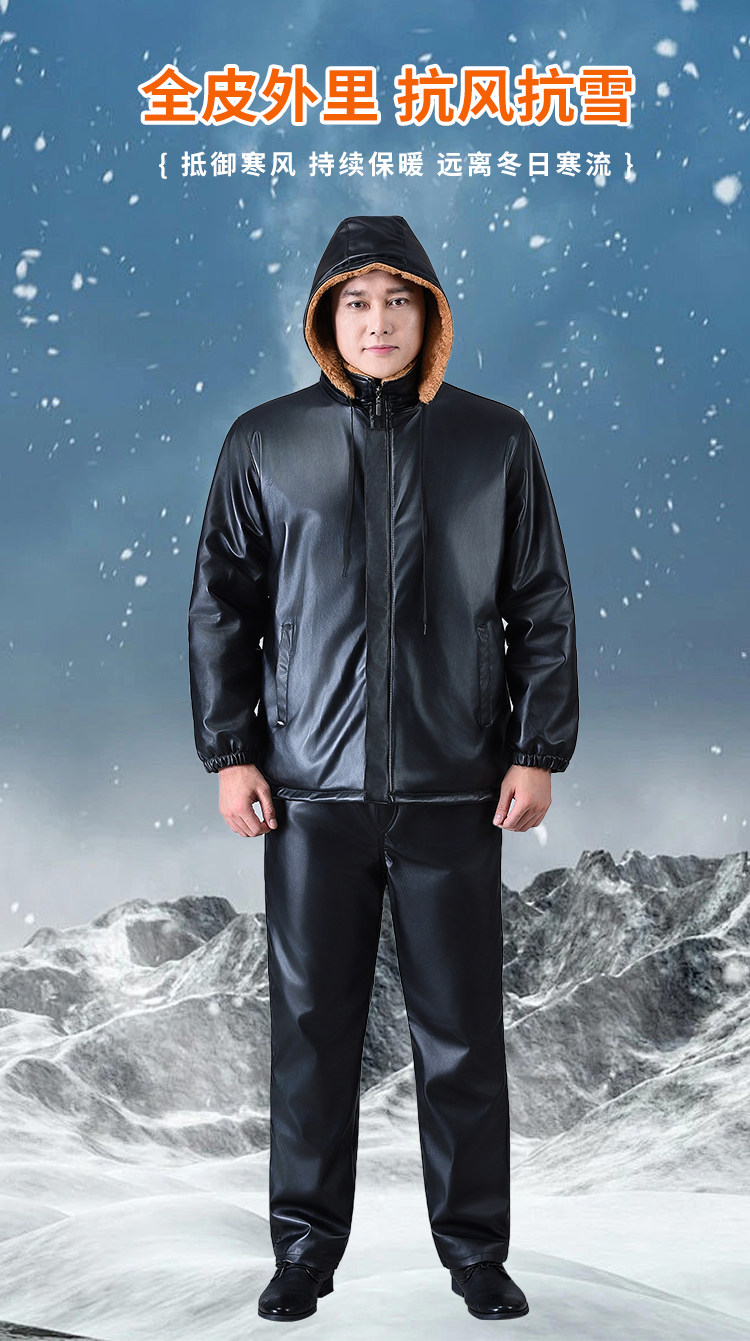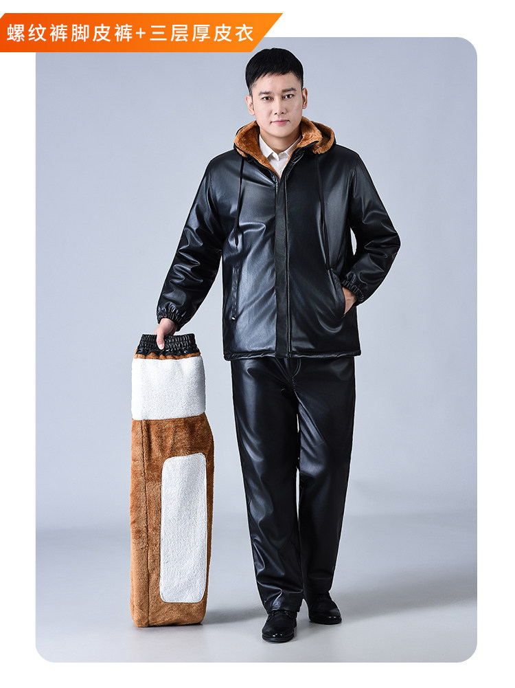Men's Leather Jacket and Pants Set, Fleece-Lined and Thickened, for Delivery Riders and Driving Services, Windproof, Waterproof, Warm, Cold-Resistant Workwear Leather Cotton Jacket