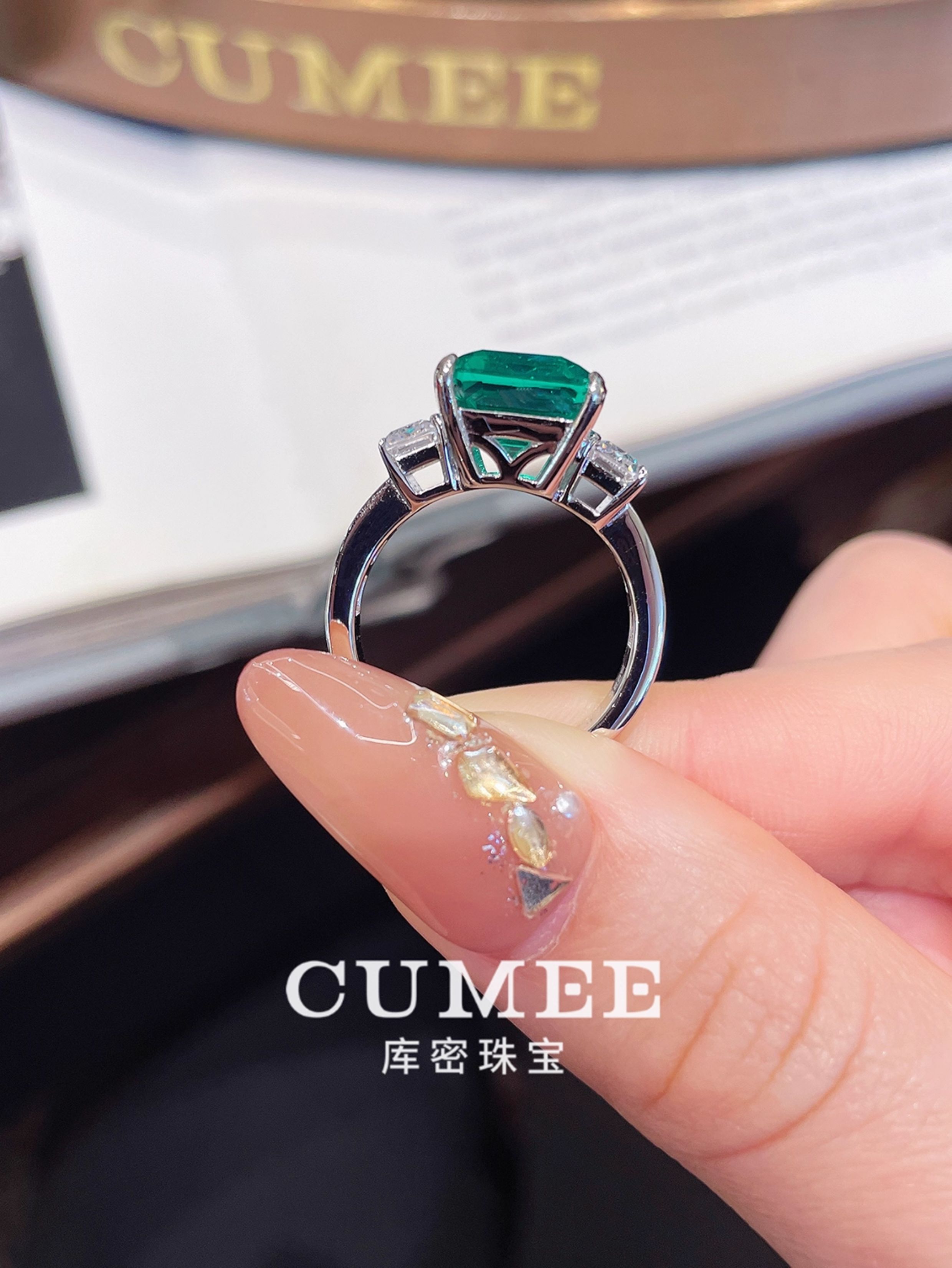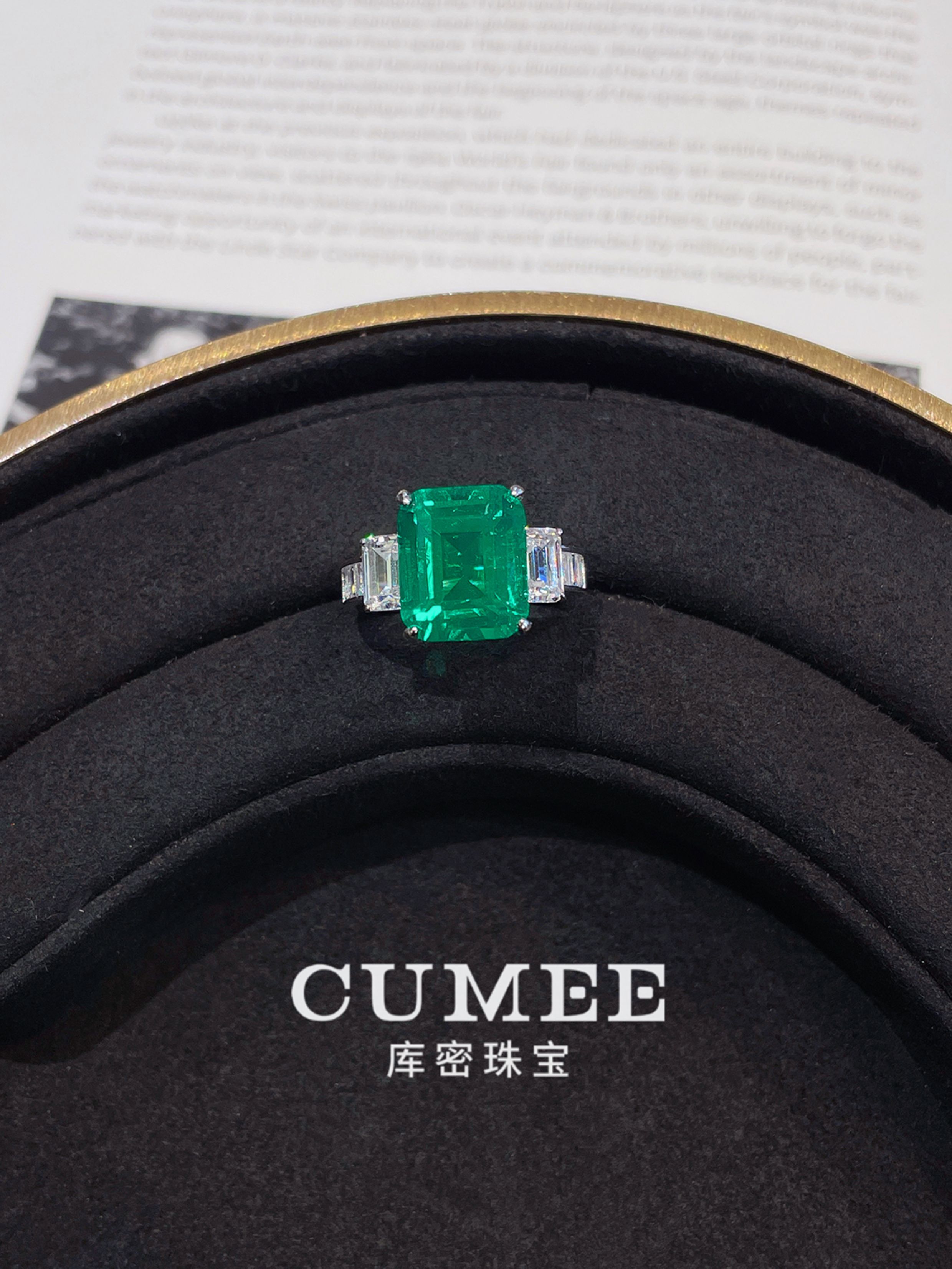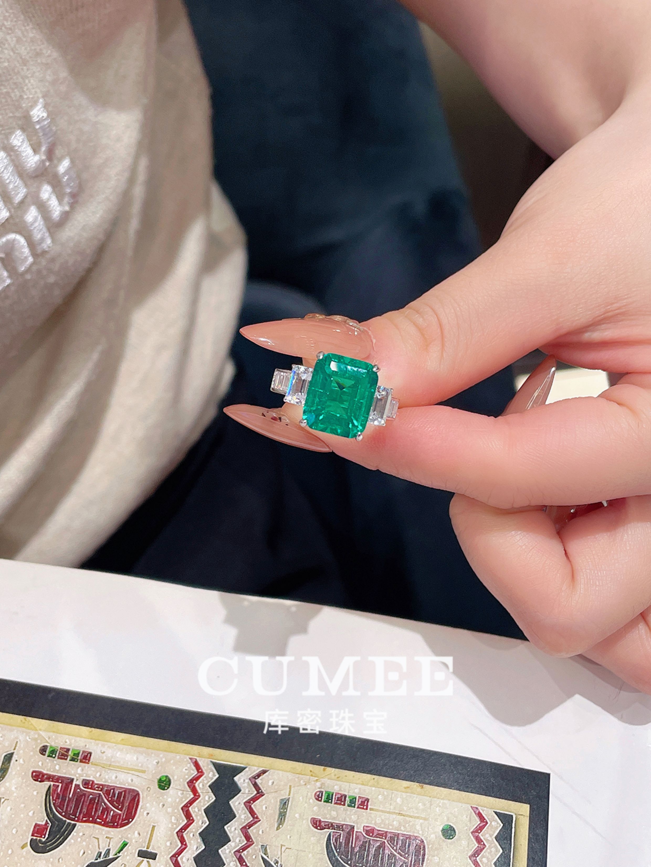 Cumee Three-Stone Simple Style High-End Synthetic Simulated Emerald Green Women's Ring. Silver Gold-Plated