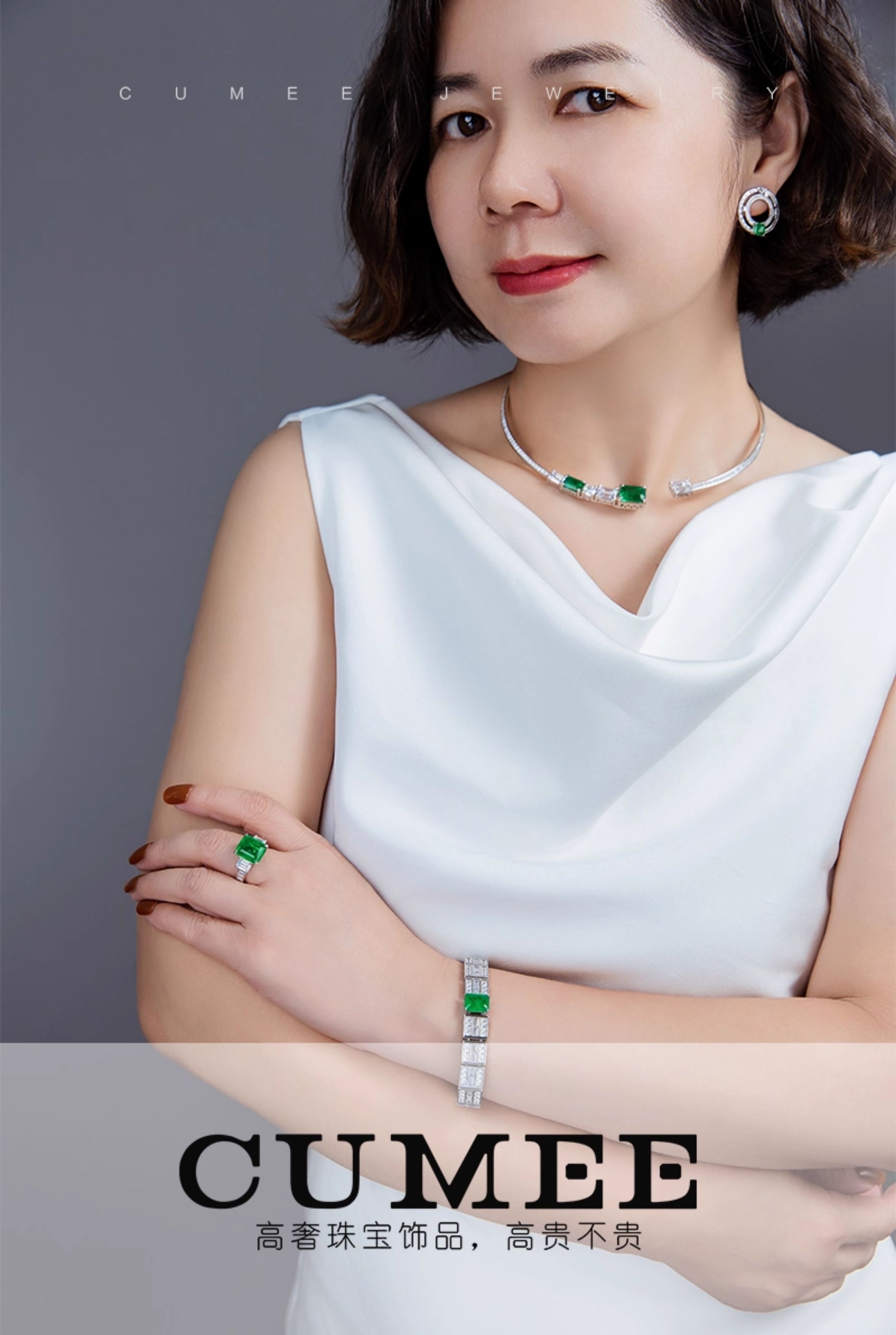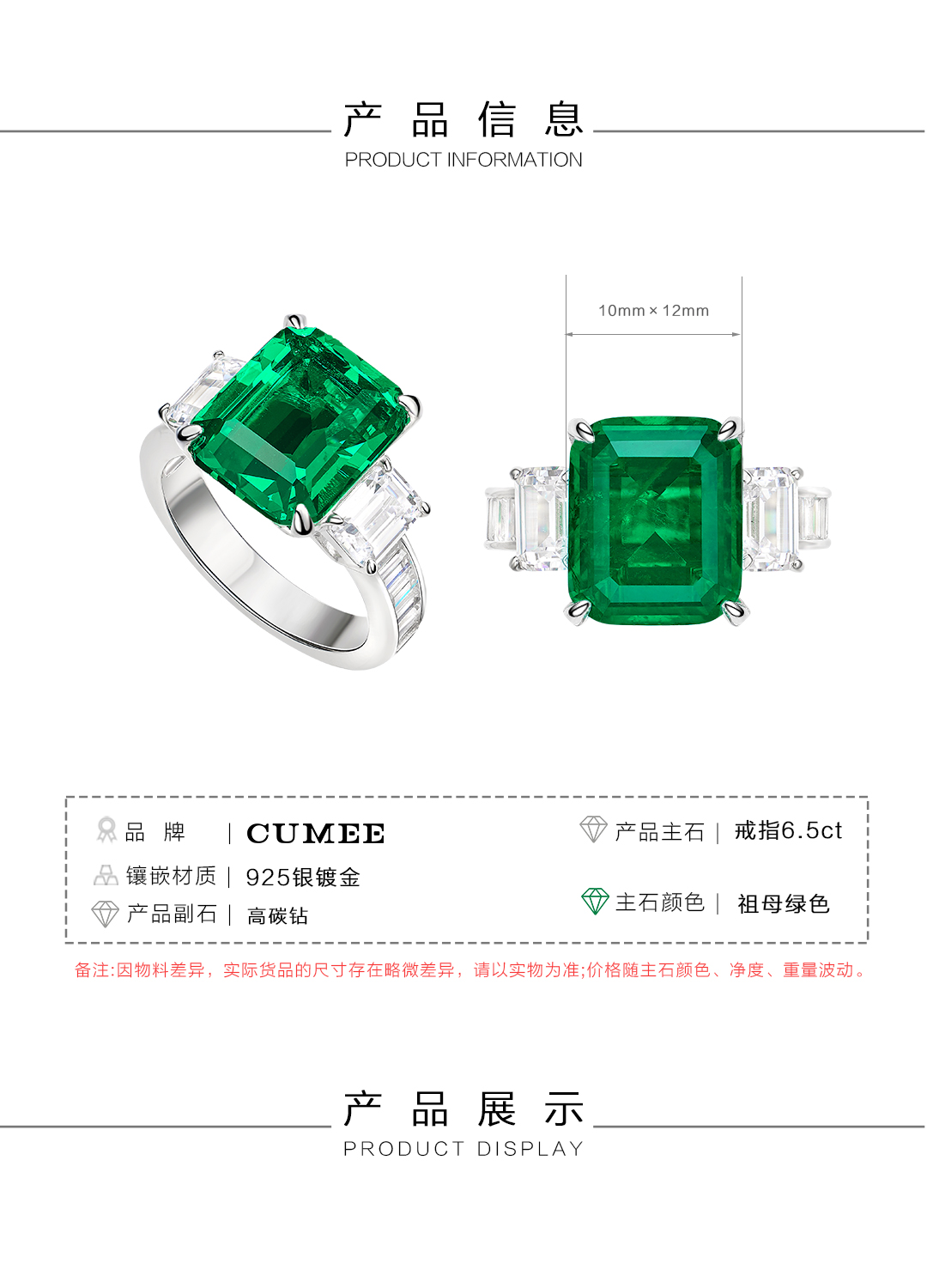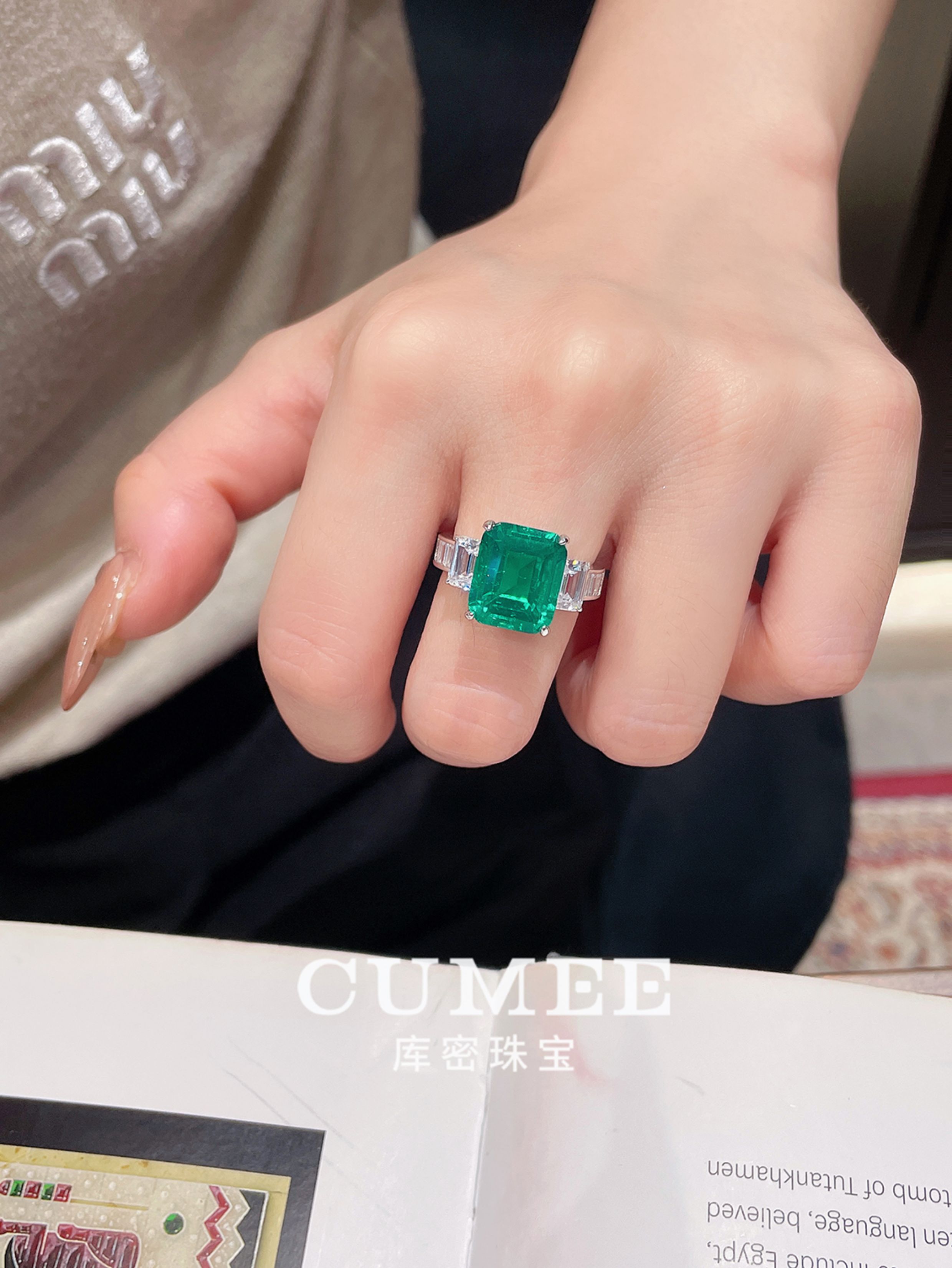 Cumee Three-Stone Simple Style High-End Synthetic Simulated Emerald Green Women's Ring. Silver Gold-Plated