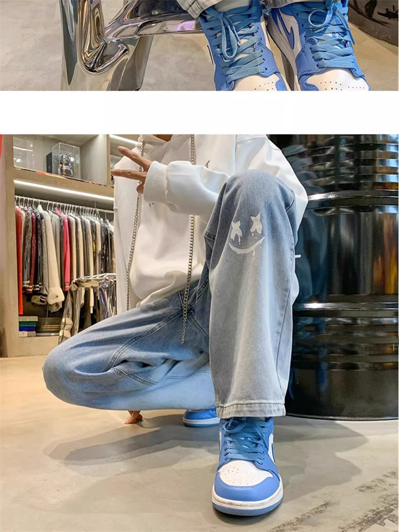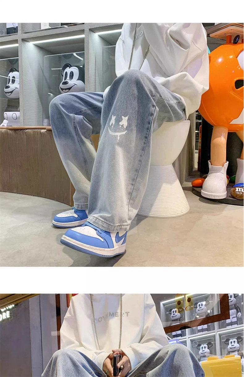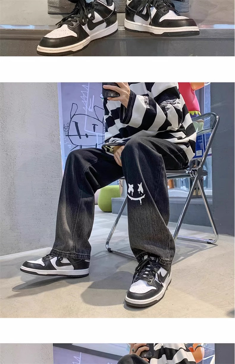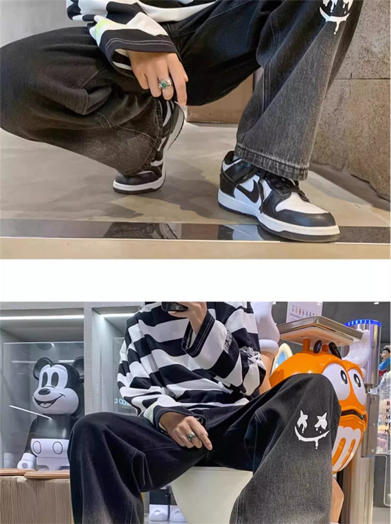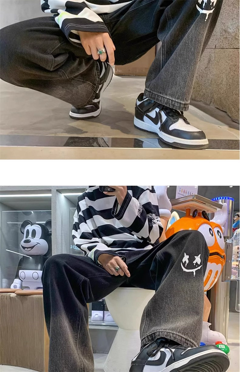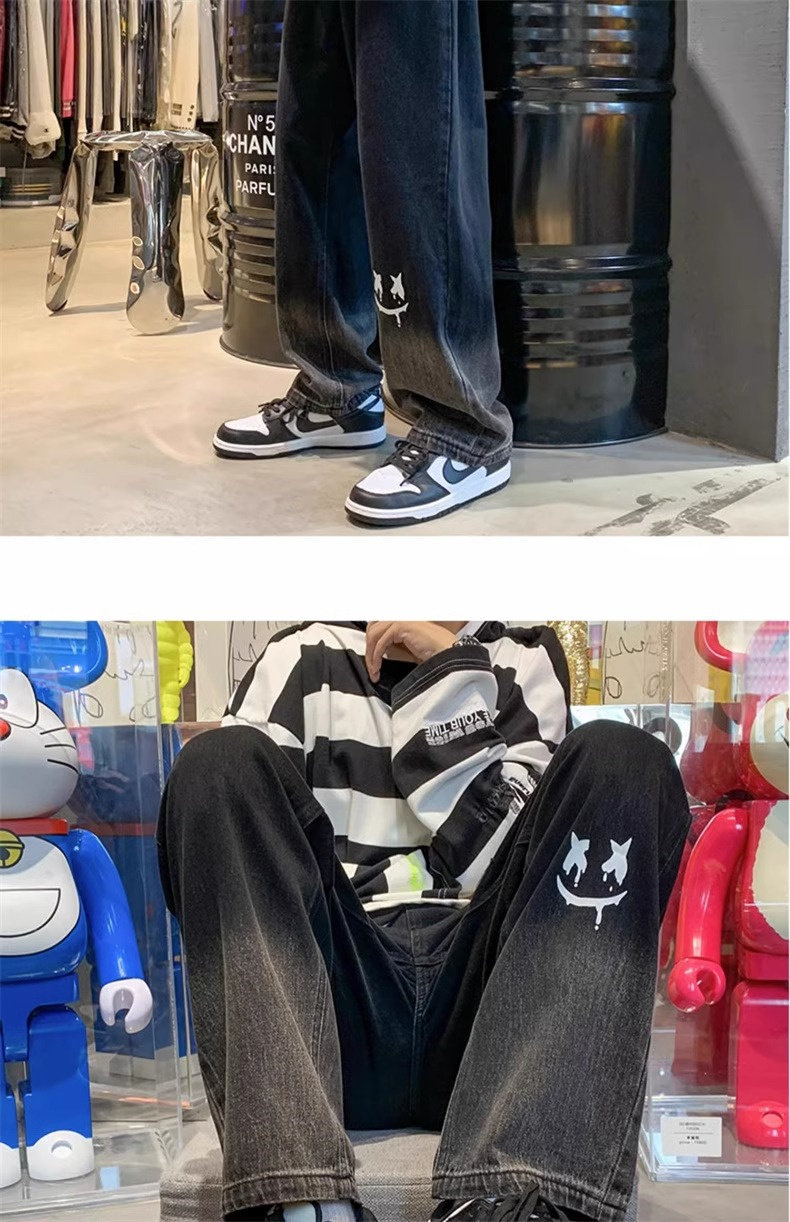 Woodpecker Print Pants for Boys, Autumn and Winter Trendy Brand Smiley Face Graffiti Jeans, Loose Straight-Leg Trousers for Teenagers