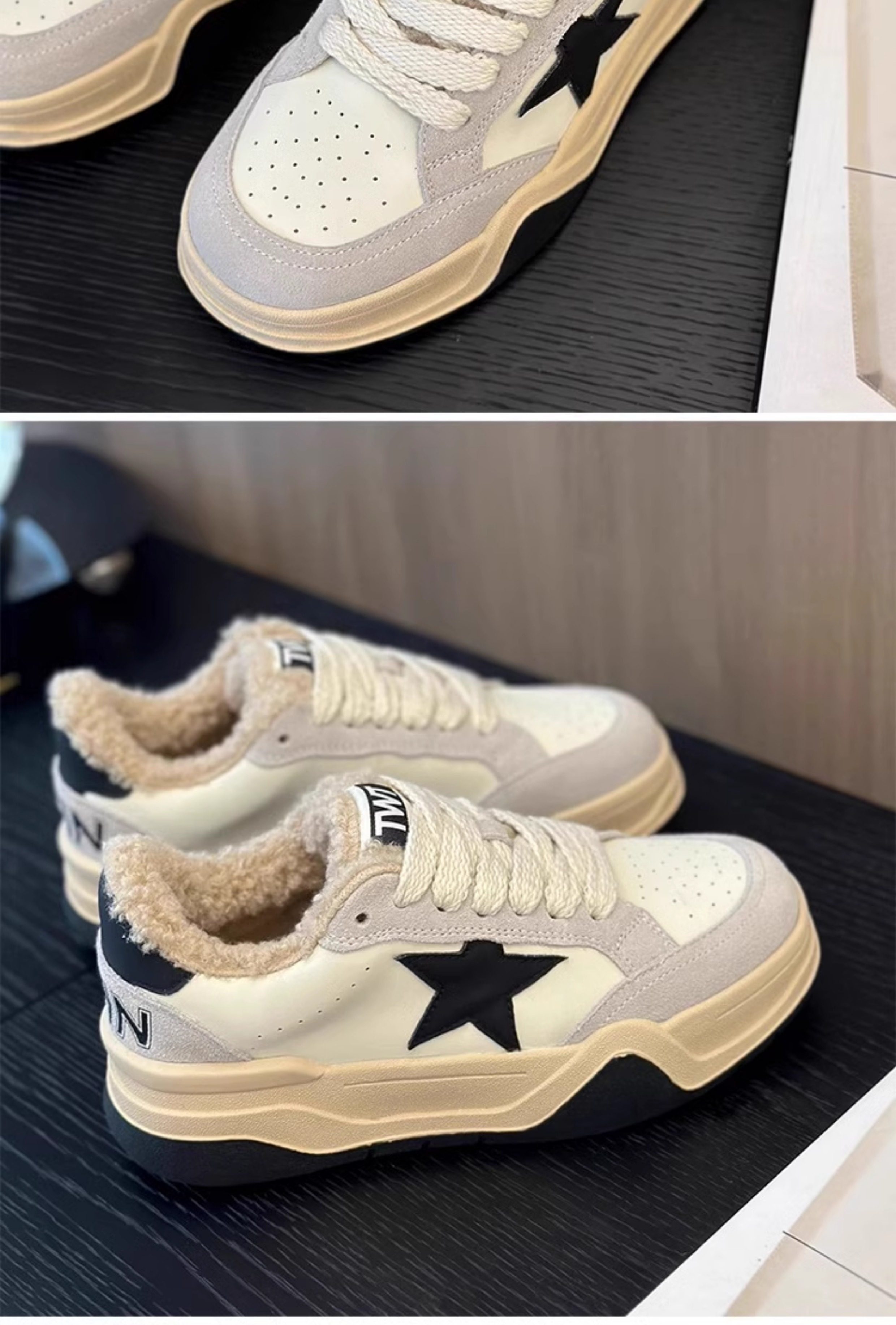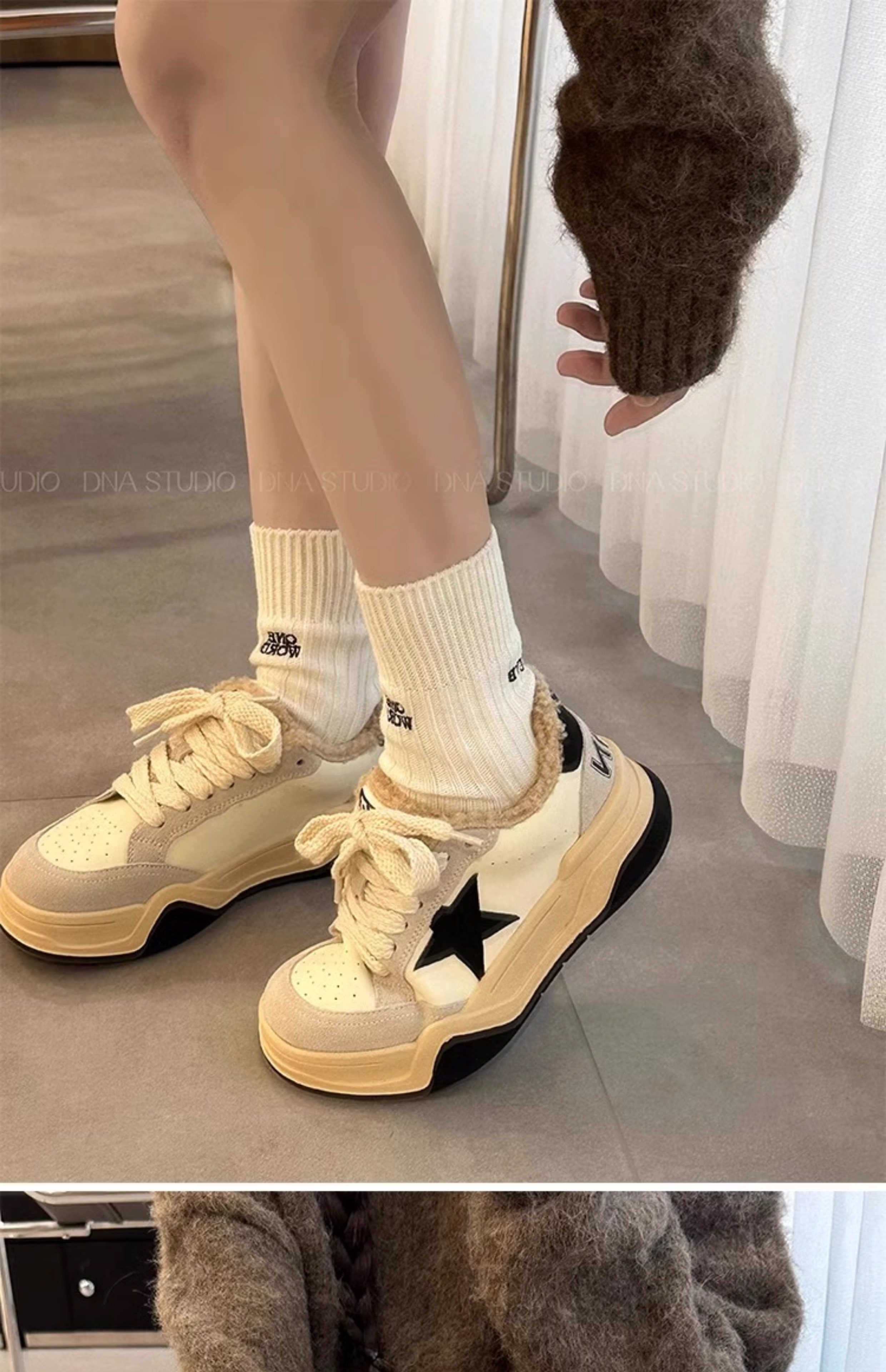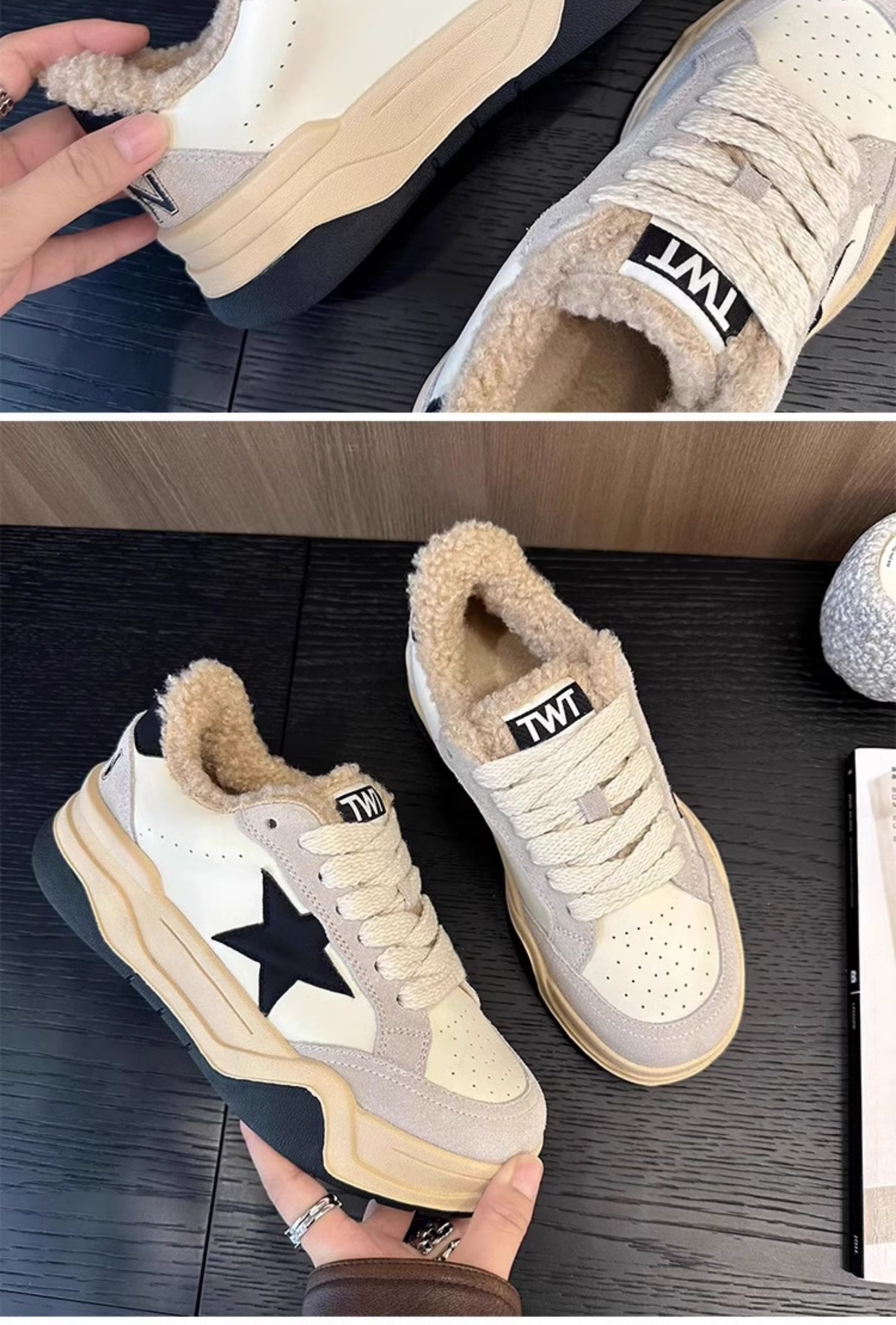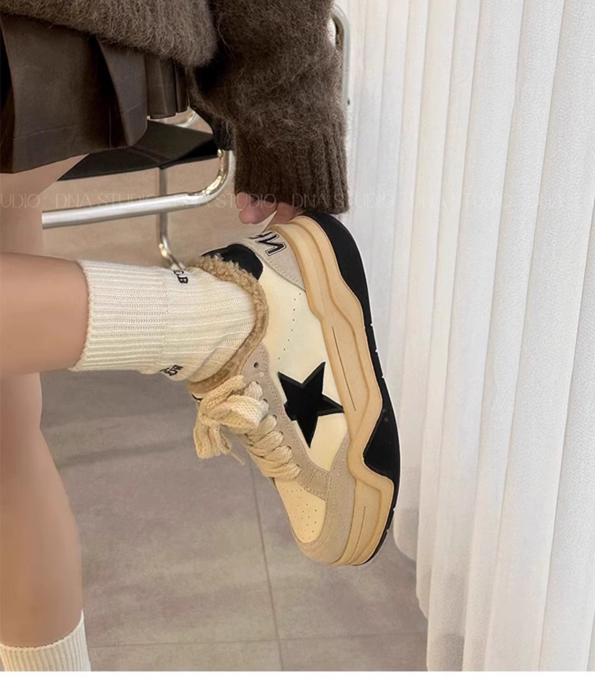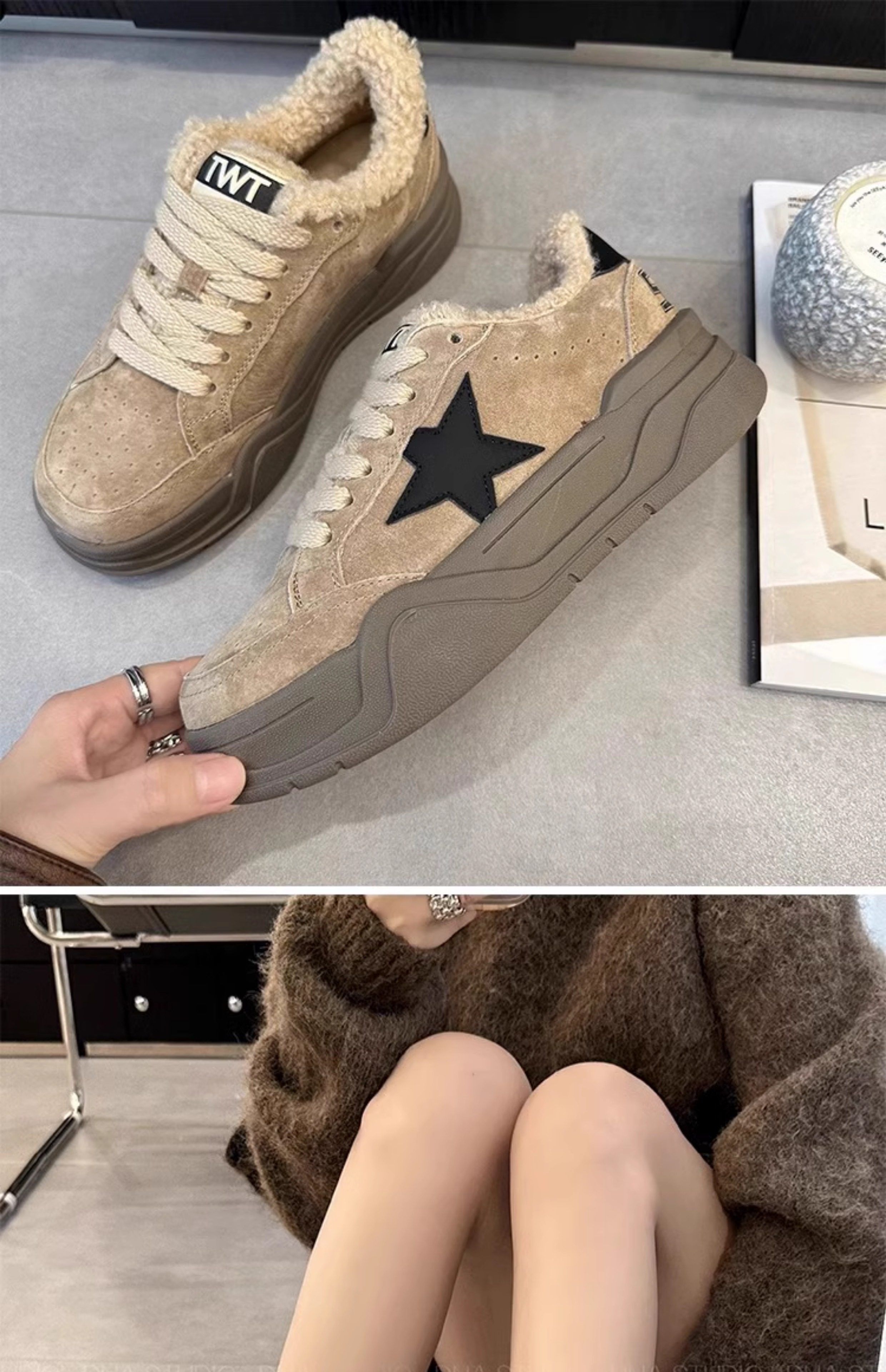 Hong Kong Thick-Soled Genuine Leather Plush Star Shoes for Women 2025 Winter Casual Sports Shoes Lace-Up Warm Sneakers Cotton Shoes for Women