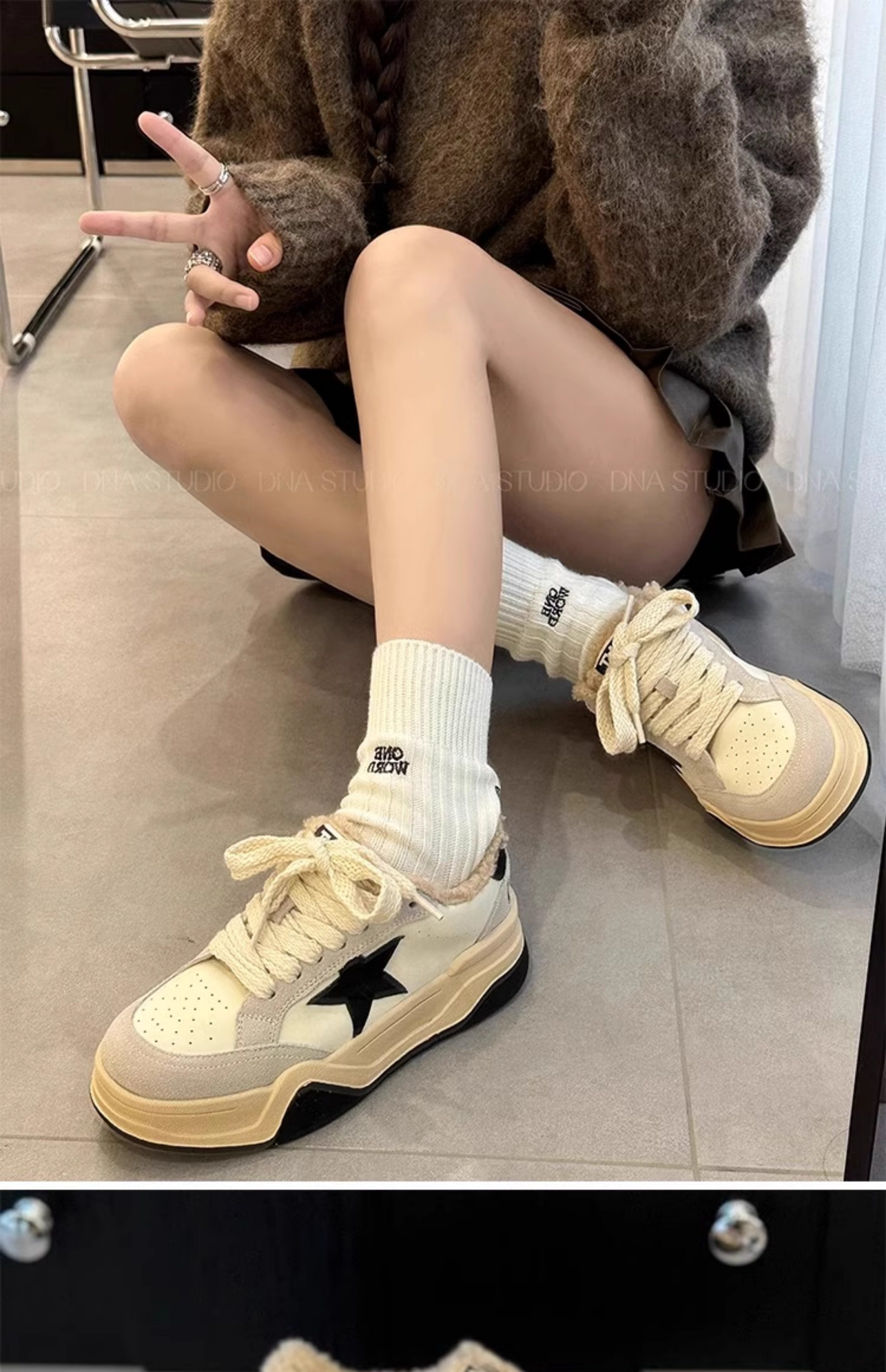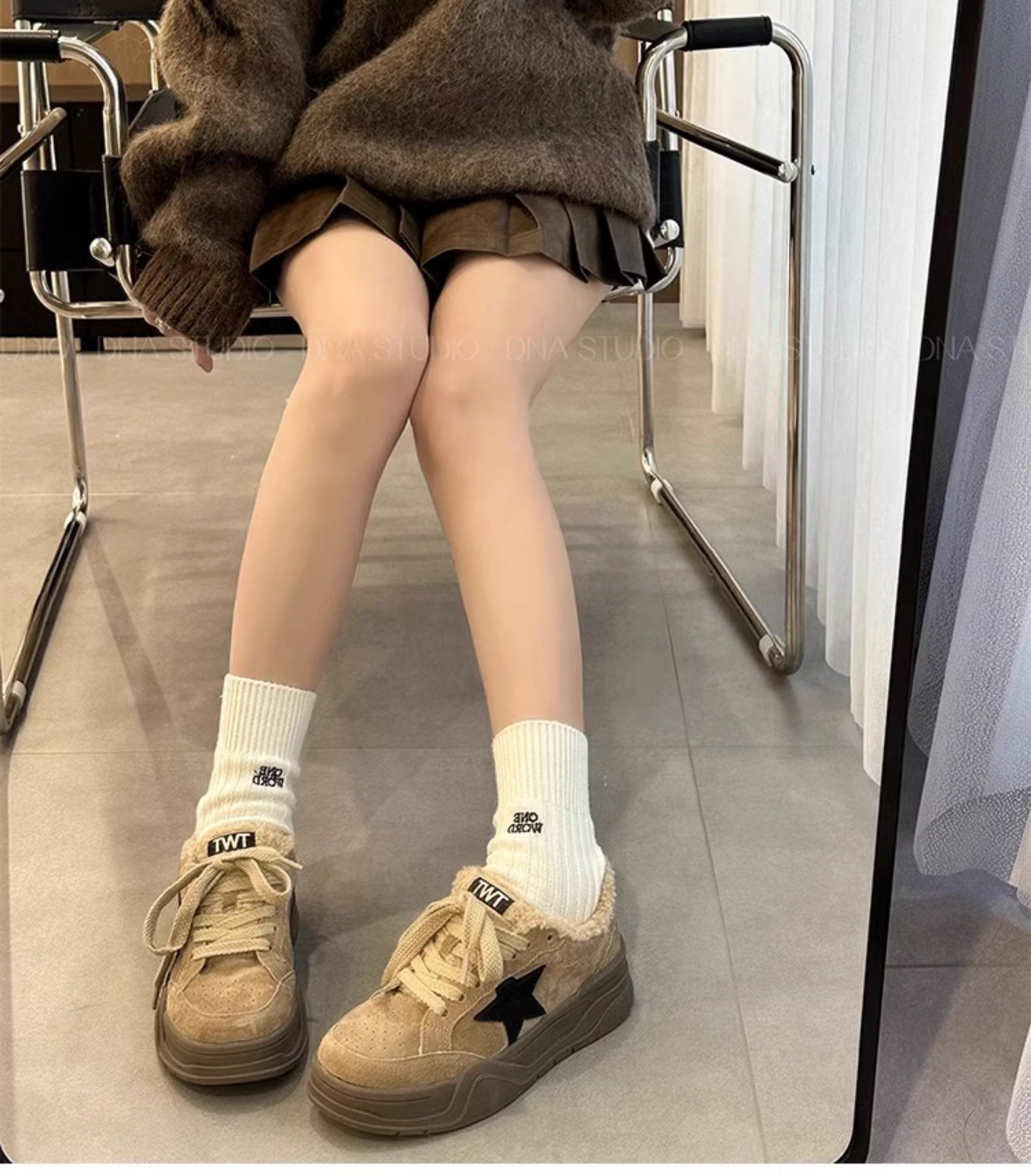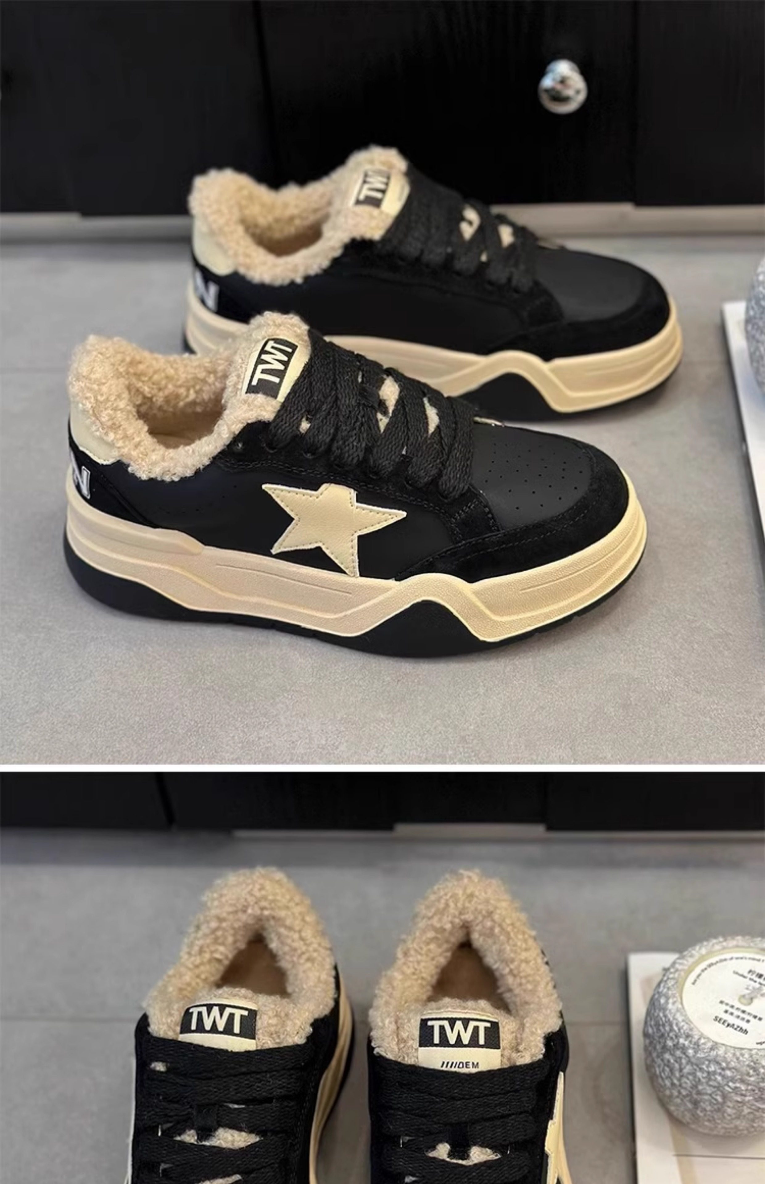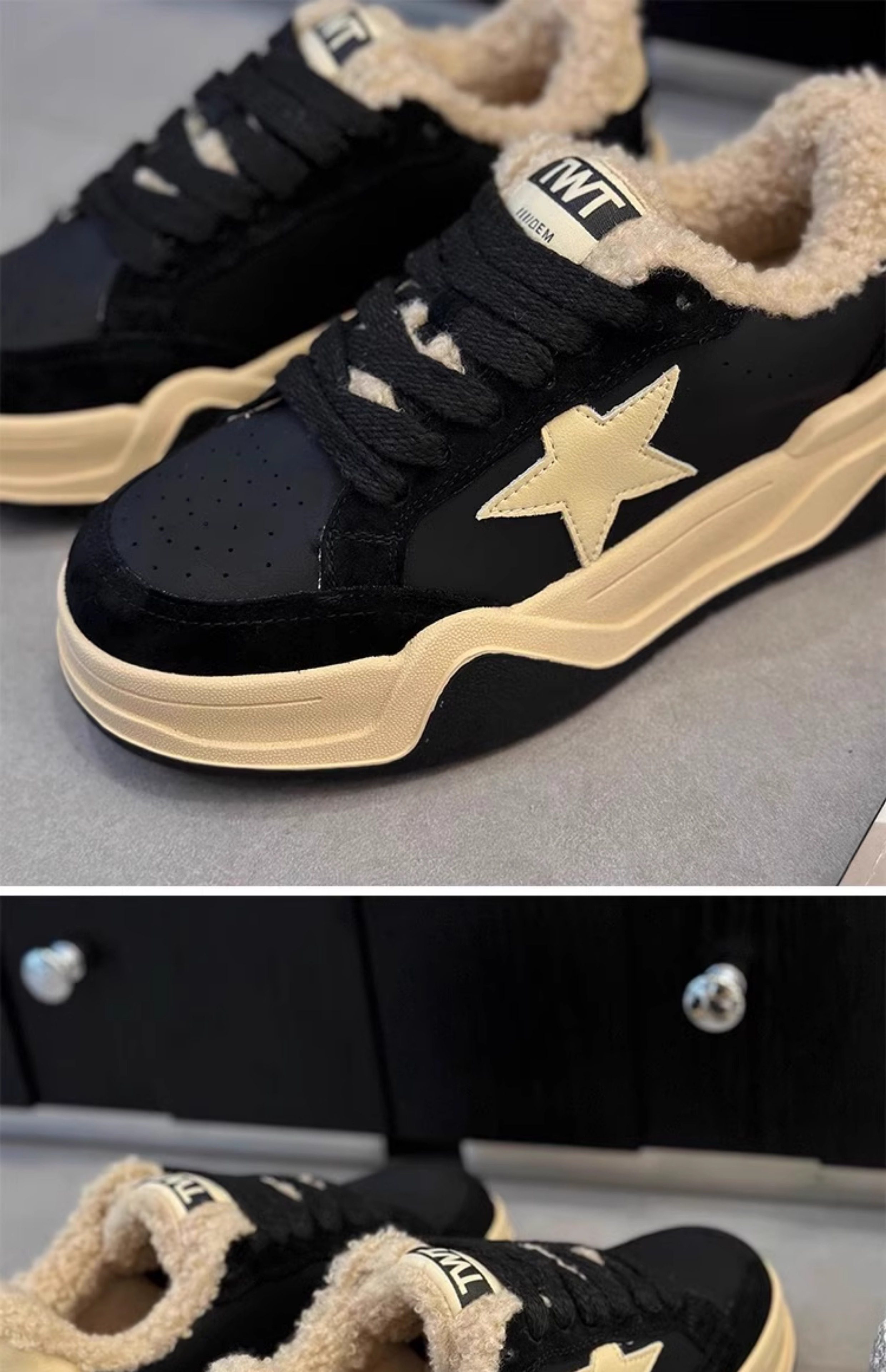 Hong Kong Thick-Soled Genuine Leather Plush Star Shoes for Women 2025 Winter Casual Sports Shoes Lace-Up Warm Sneakers Cotton Shoes for Women