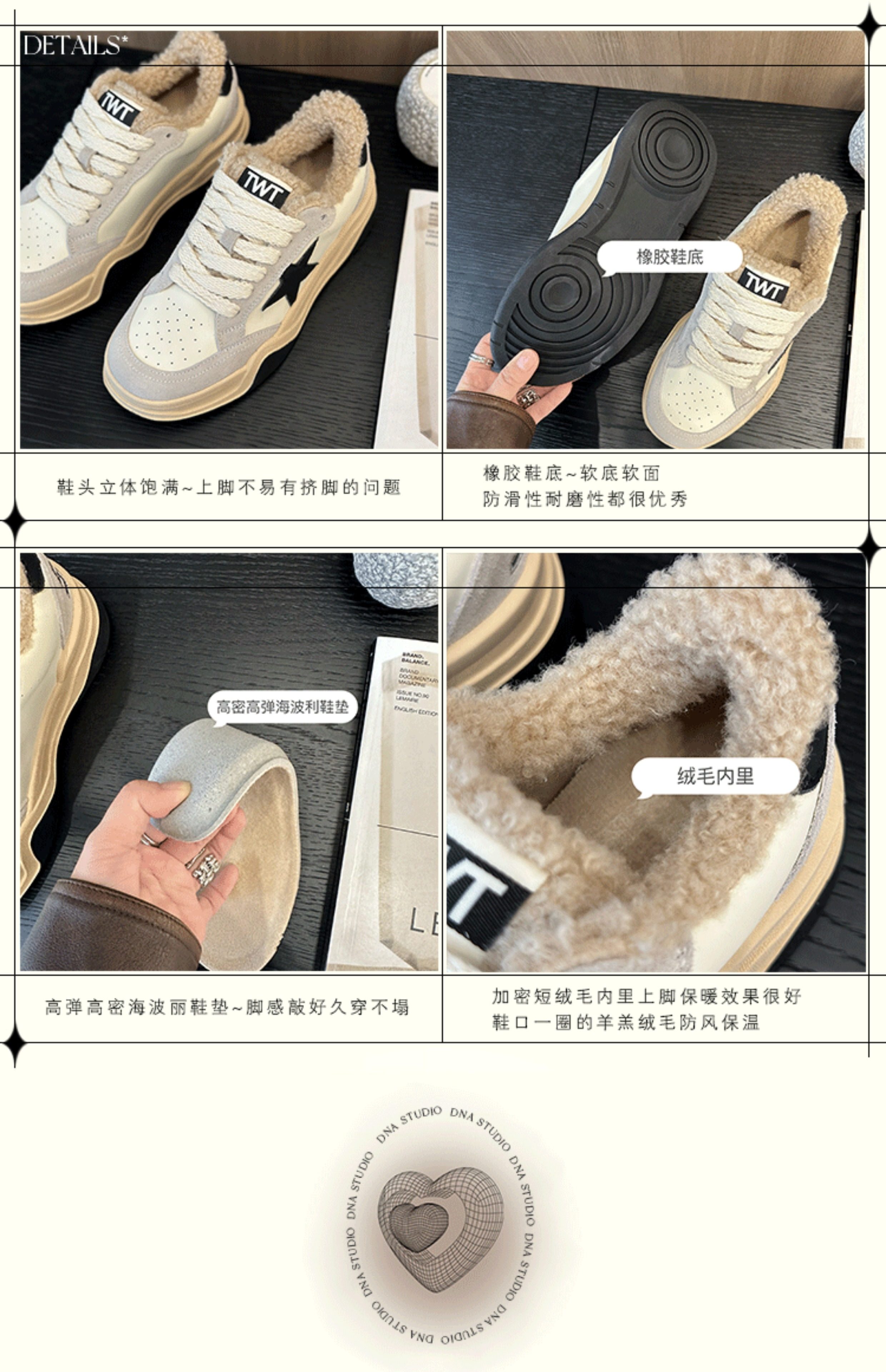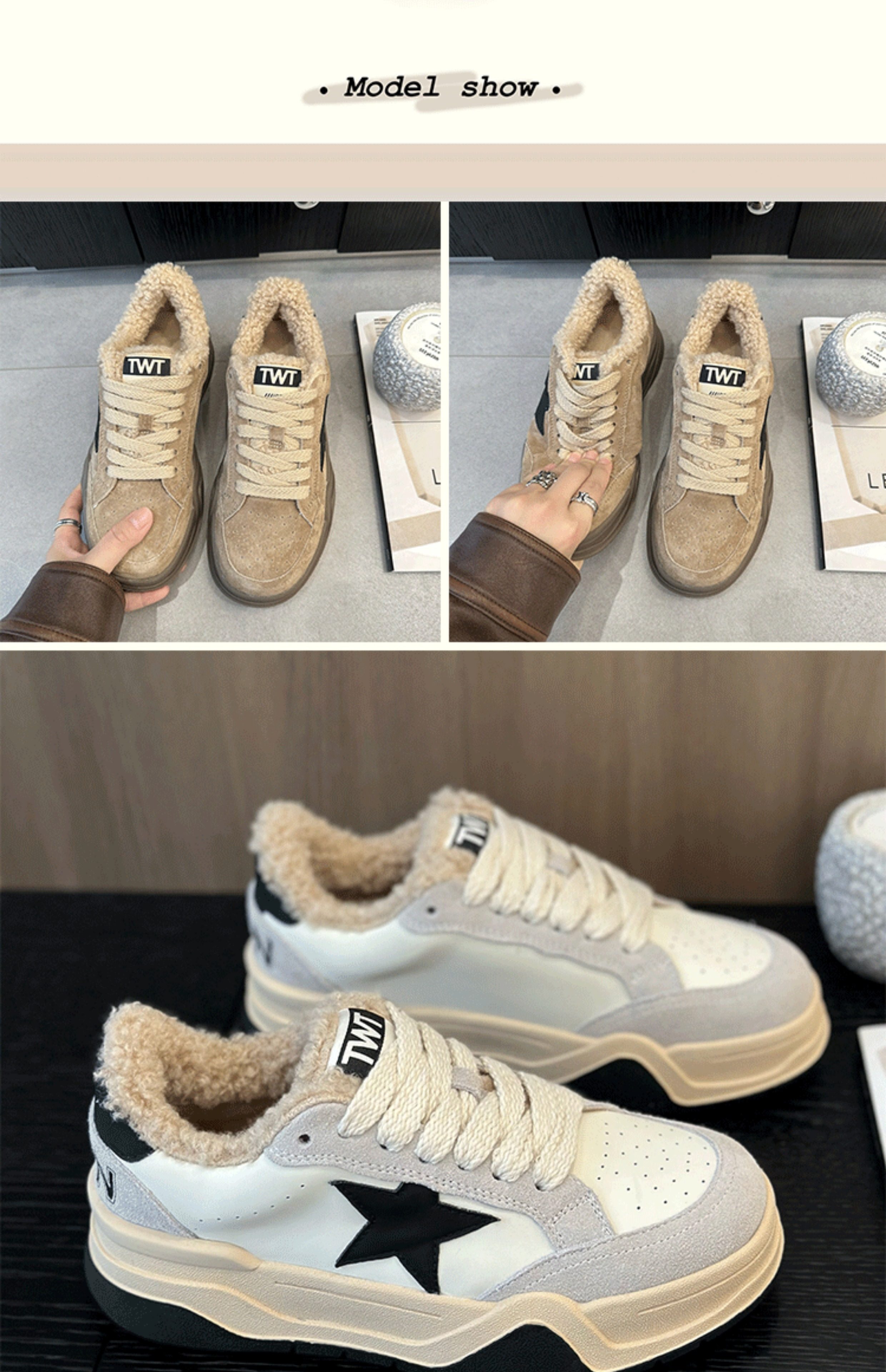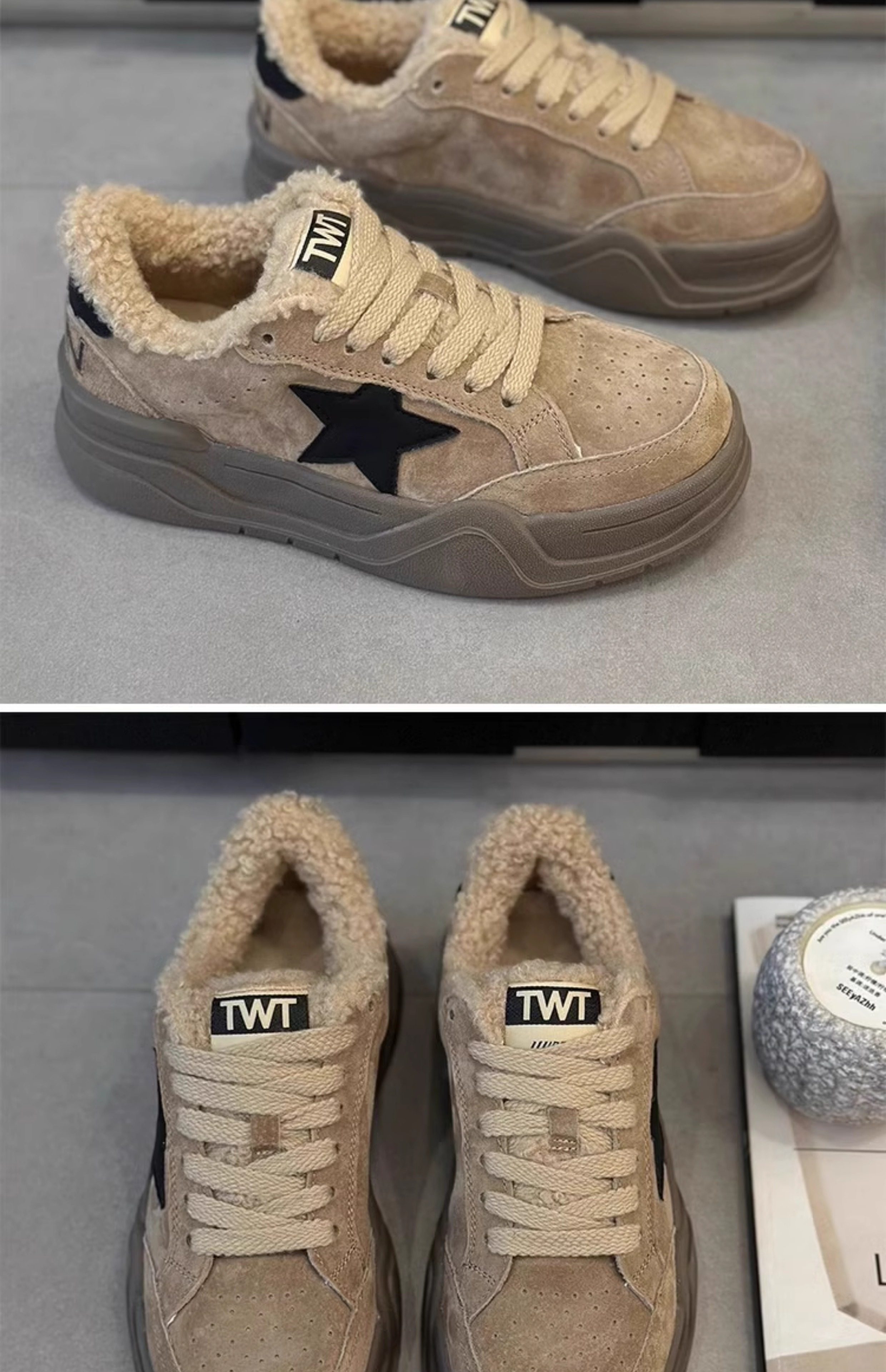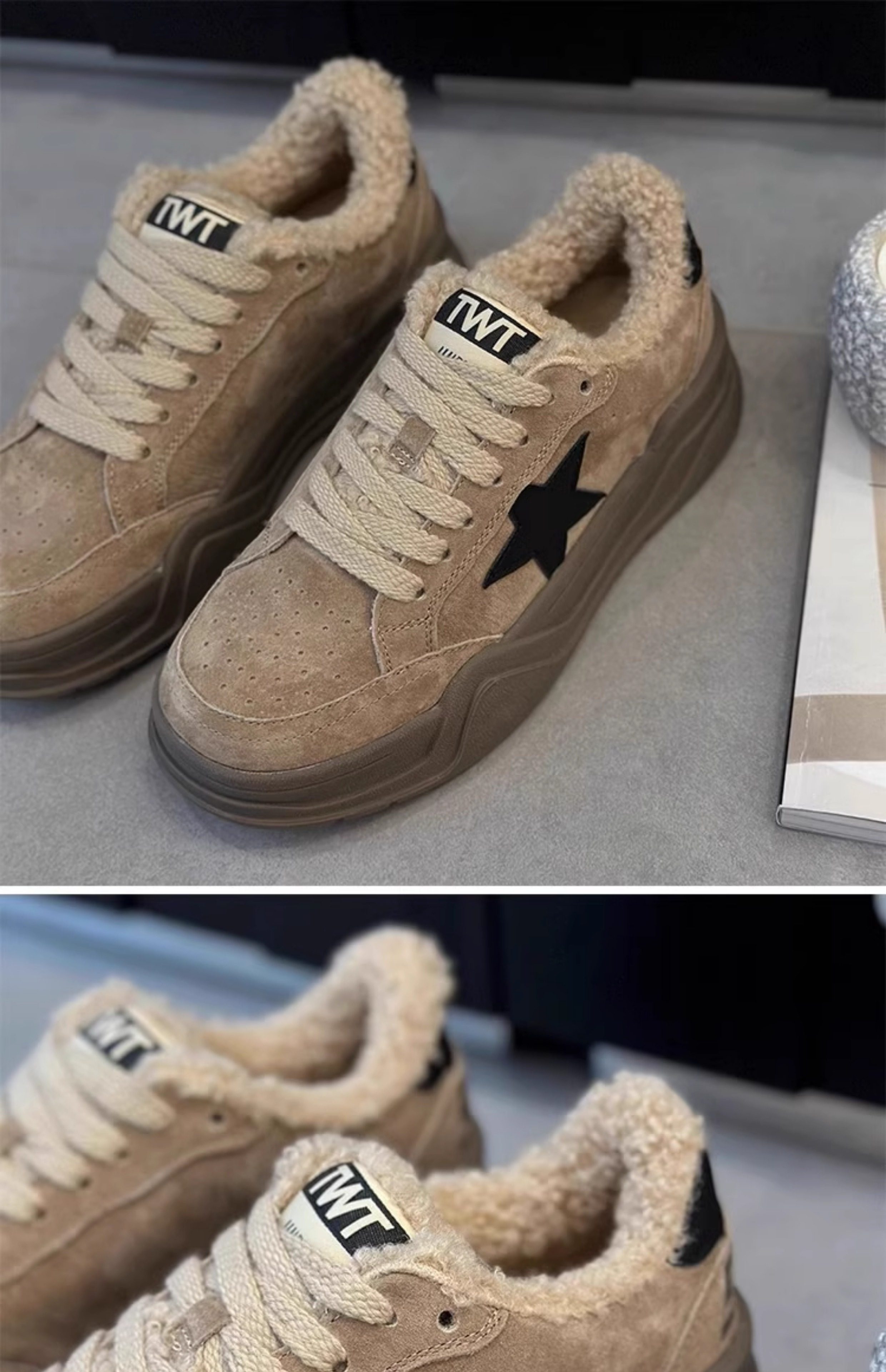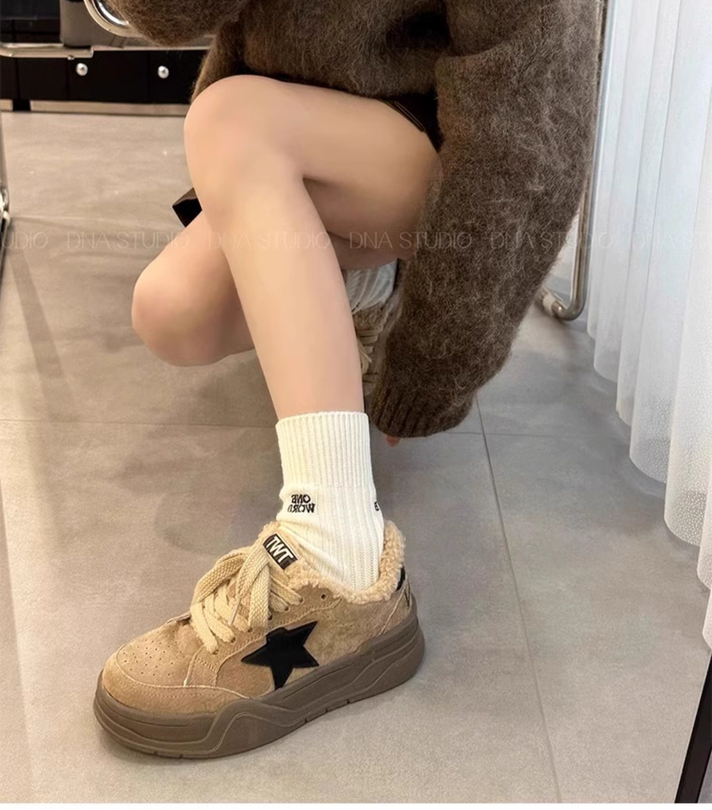 Hong Kong Thick-Soled Genuine Leather Plush Star Shoes for Women 2025 Winter Casual Sports Shoes Lace-Up Warm Sneakers Cotton Shoes for Women